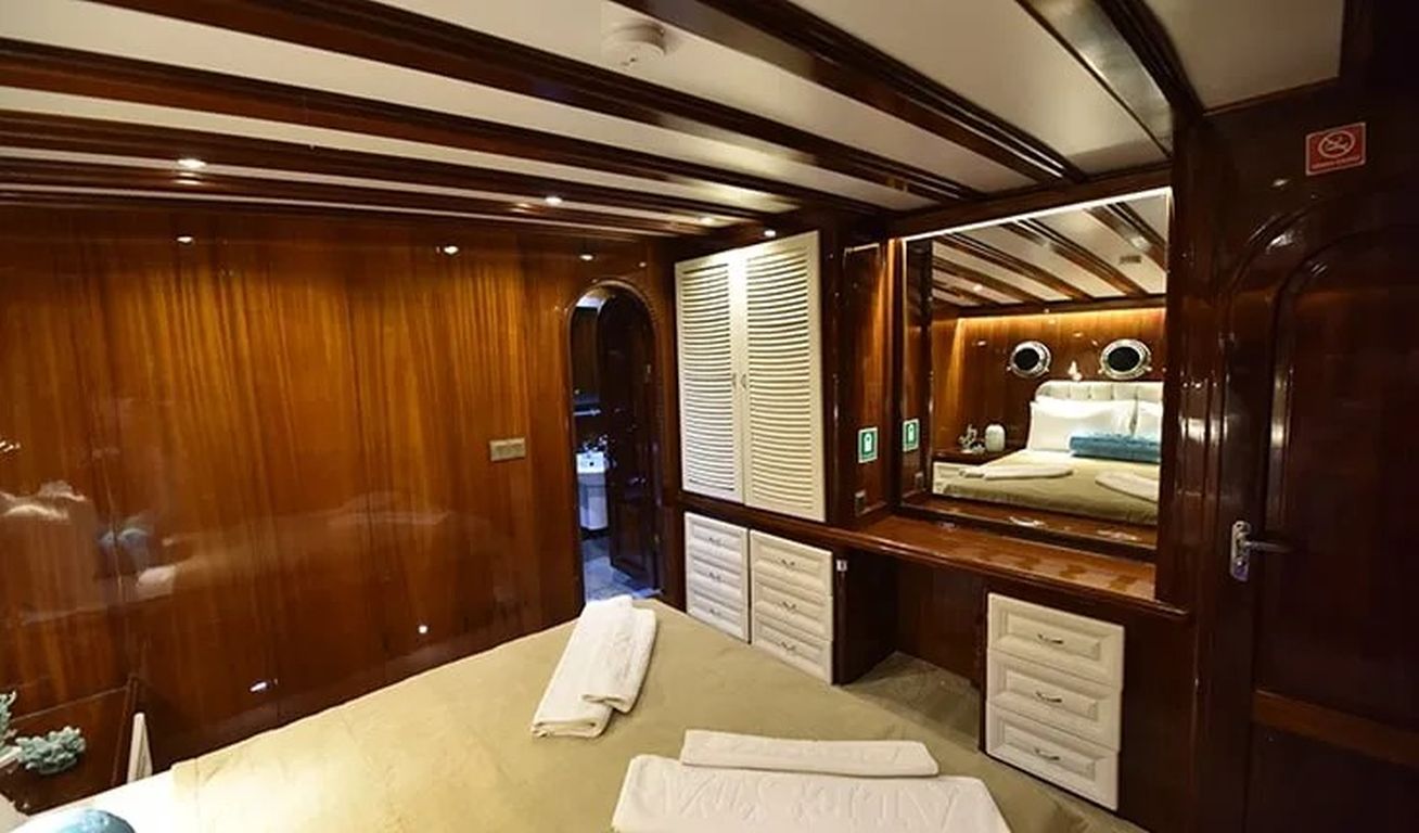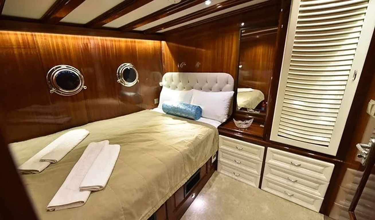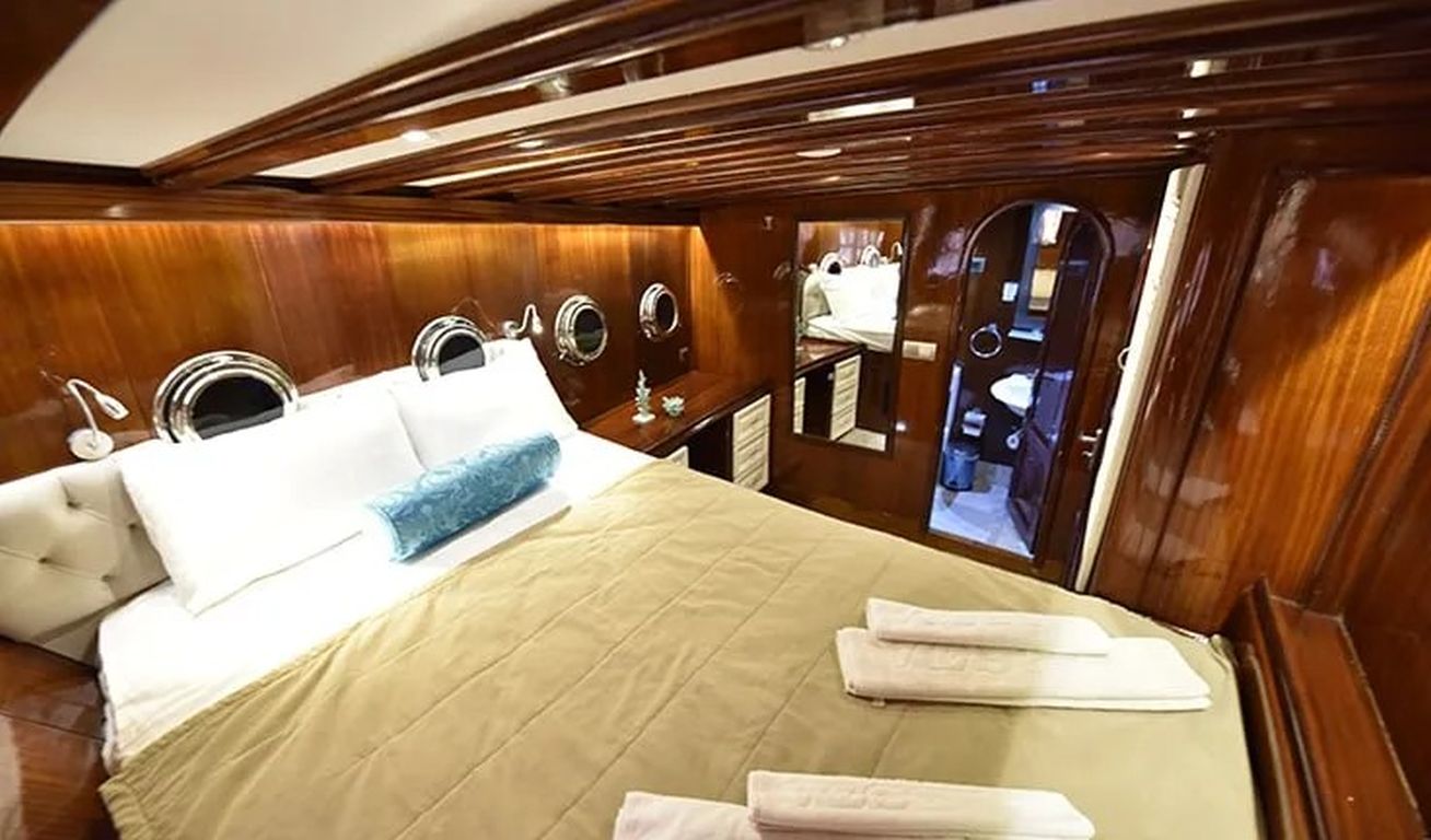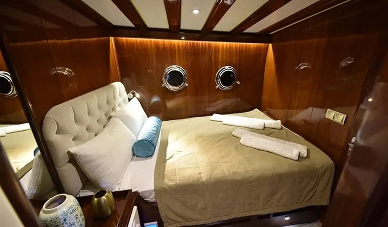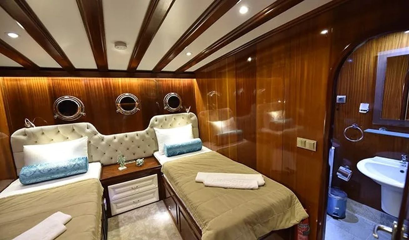 | Die Gulet Kayhan 11 ist eine 34 Meter lange Ketch, gebaut 2002 und 2017 umfassend renoviert. Sie verfügt über 10 Kabinen – sechs Doppel- und vier Zweibettkabinen – mit einer Gesamtkapazität von 20 Gästen. Jede Kabine ist mit Klimaanlage, Bad und Dusche ausgestattet. Die Klimaanlage ist acht Stunden täglich verfügbar (erweiterbar gegen Aufpreis). Das Deck ist großzügig gestaltet, mit schattigen Essbereichen, gepolsterten Sitzgelegenheiten und großen Sonnenflächen. Der Salon verfügt über einen Esstisch, eine Bar und gemütliche Sitzbereiche. Zu den Wassersportarten gehören Kanu und Wasserski, weitere Aktivitäten wie Wakeboard, Ringo oder SUP sind gegen Aufpreis erhältlich. Schnorchel- und Angelausrüstung stehen ebenfalls zur Verfügung. Angetrieben von zwei 450 PS Iveco-Motoren und zwei 45 kW Onan-Generatoren, erreicht sie eine Geschwindigkeit von 11 Knoten. Die Kayhan 11 ist eine hervorragende Wahl für große Gruppen, die eine elegante und serviceorientierte Blaue Reise suchen. |