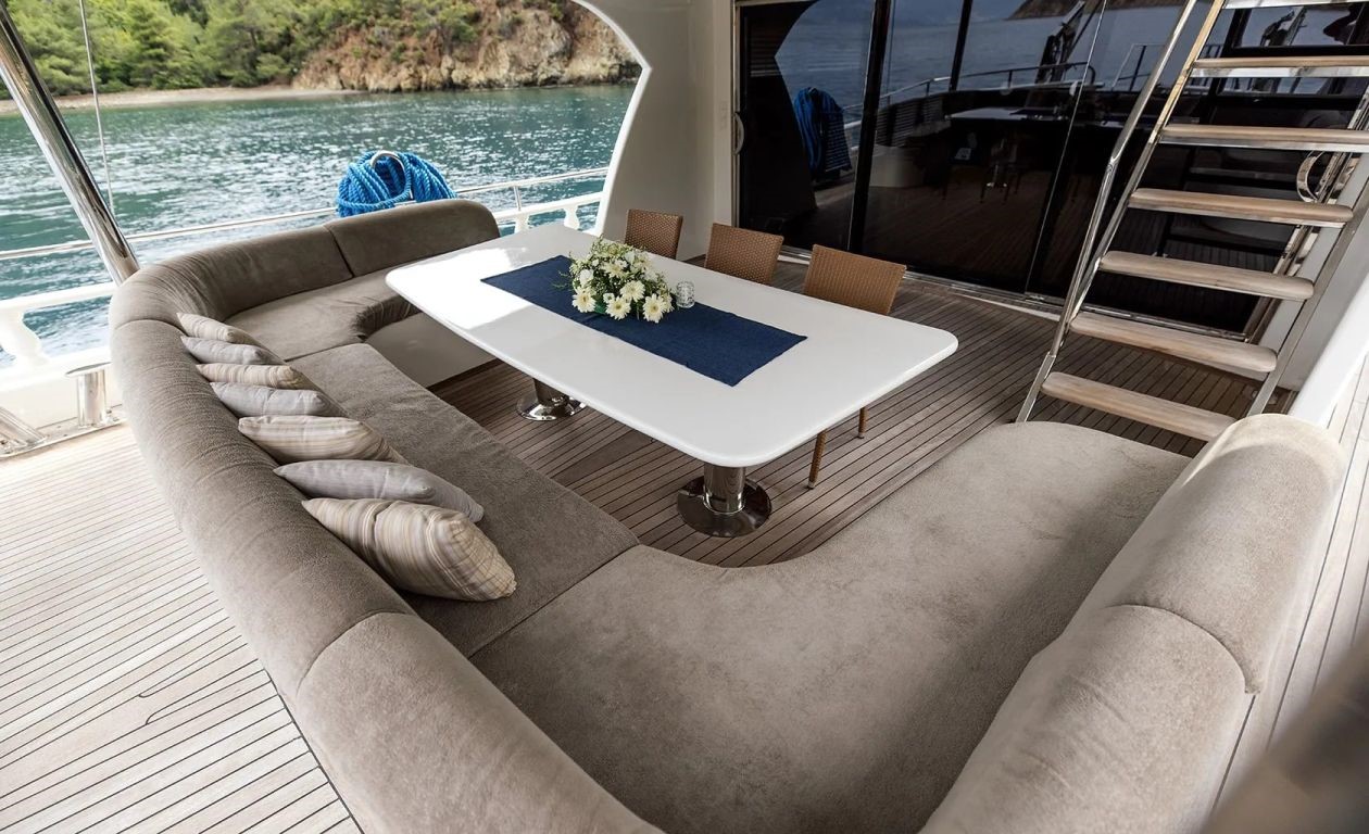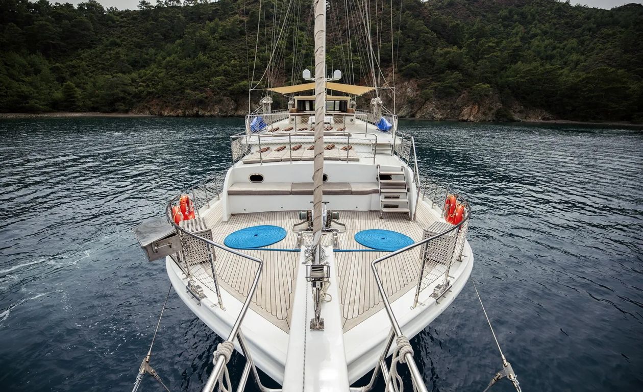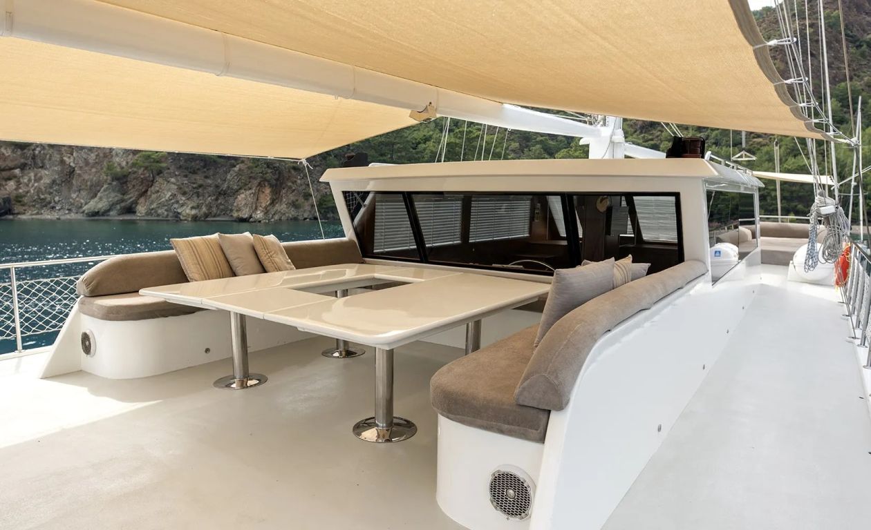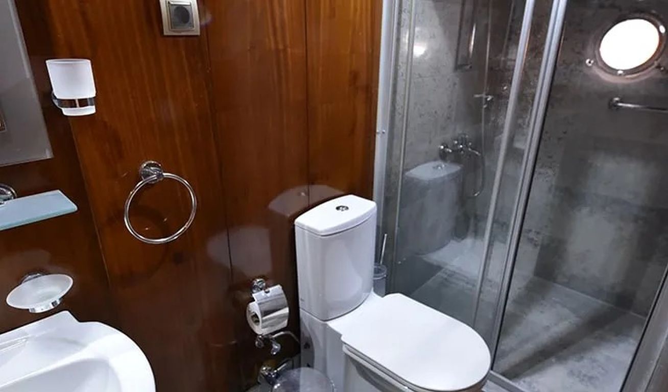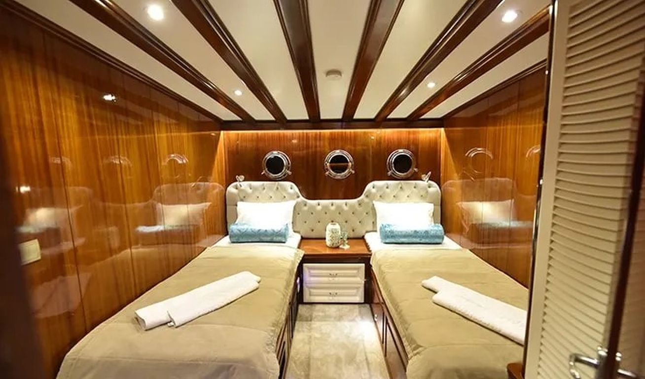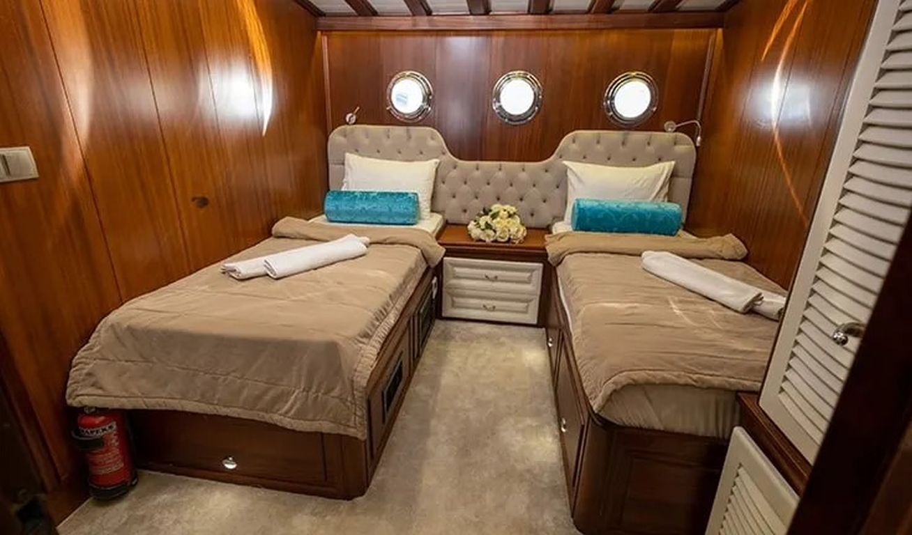 | Die Gulet Kayhan 11 ist eine 34 Meter lange Ketch, gebaut 2002 und 2017 umfassend renoviert. Sie verfügt über 10 Kabinen – sechs Doppel- und vier Zweibettkabinen – mit einer Gesamtkapazität von 20 Gästen. Jede Kabine ist mit Klimaanlage, Bad und Dusche ausgestattet. Die Klimaanlage ist acht Stunden täglich verfügbar (erweiterbar gegen Aufpreis). Das Deck ist großzügig gestaltet, mit schattigen Essbereichen, gepolsterten Sitzgelegenheiten und großen Sonnenflächen. Der Salon verfügt über einen Esstisch, eine Bar und gemütliche Sitzbereiche. Zu den Wassersportarten gehören Kanu und Wasserski, weitere Aktivitäten wie Wakeboard, Ringo oder SUP sind gegen Aufpreis erhältlich. Schnorchel- und Angelausrüstung stehen ebenfalls zur Verfügung. Angetrieben von zwei 450 PS Iveco-Motoren und zwei 45 kW Onan-Generatoren, erreicht sie eine Geschwindigkeit von 11 Knoten. Die Kayhan 11 ist eine hervorragende Wahl für große Gruppen, die eine elegante und serviceorientierte Blaue Reise suchen. |
