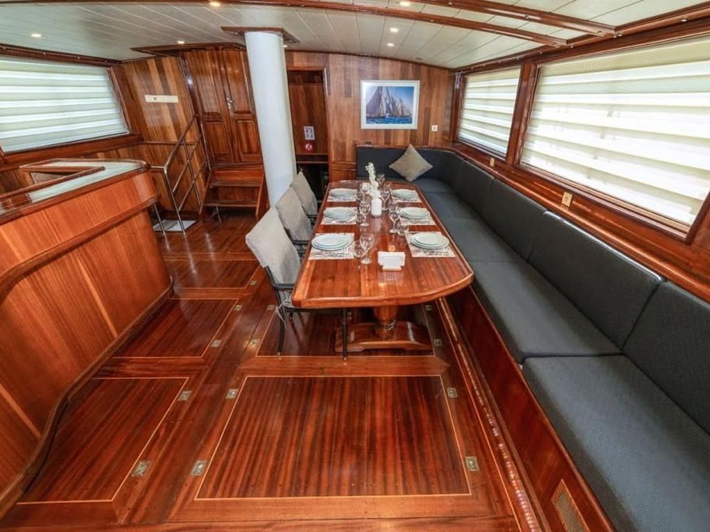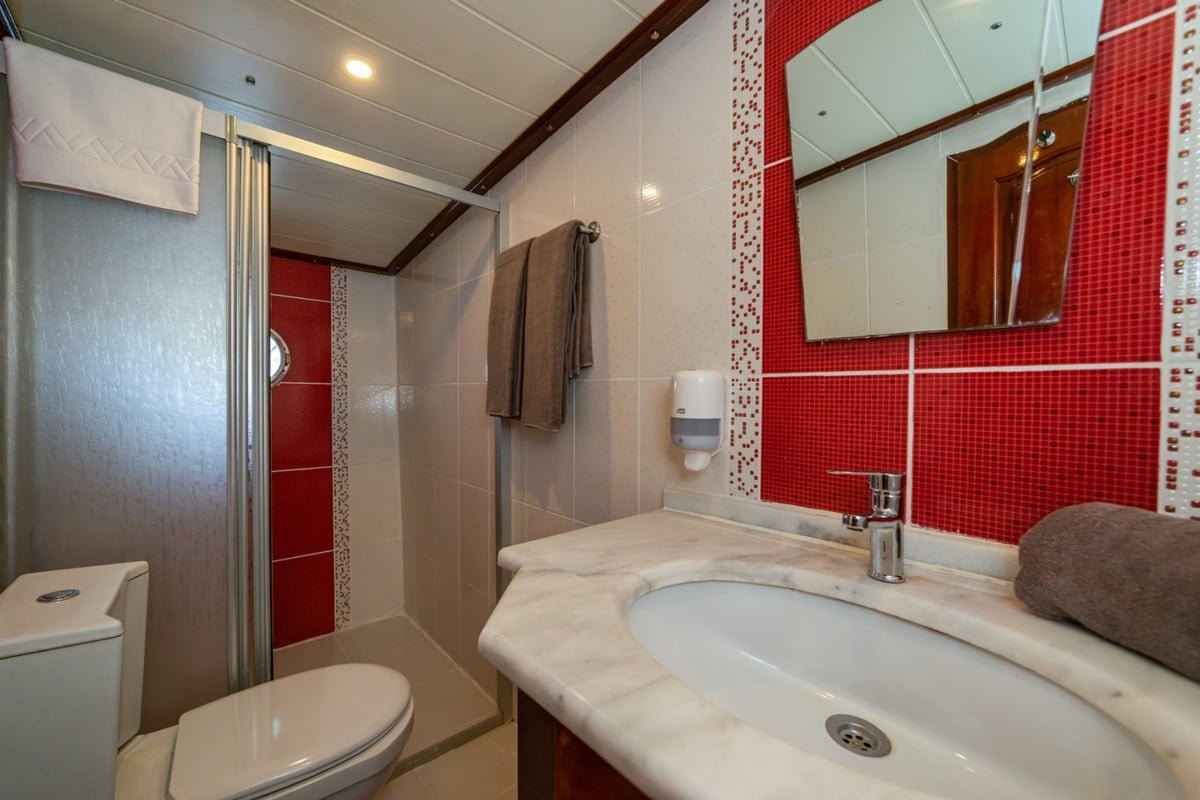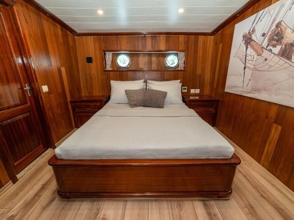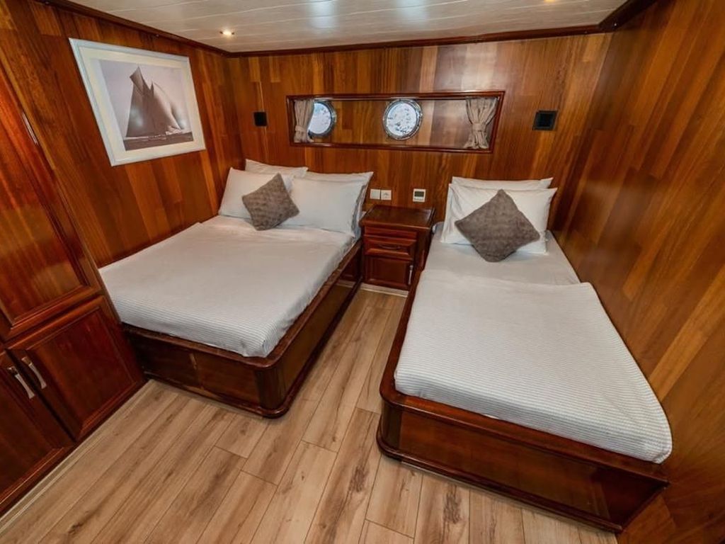 | Bis zu 20 Gäste; 6 Doppel, 2 Zweibett und 2 Dreibettkabinen, Salon und alle Kabinen mit Klimaanlage, Fernseher in allen Kabinen, Duschkabine und Toiletten im Haushaltsstil in allen Kabinen, separate Mannschaftskabinen |