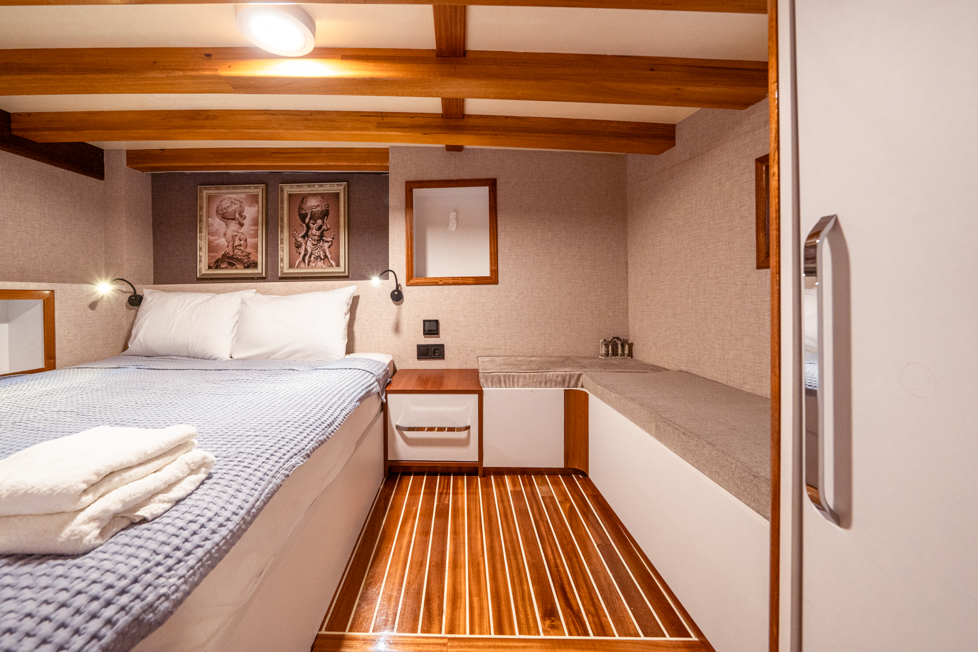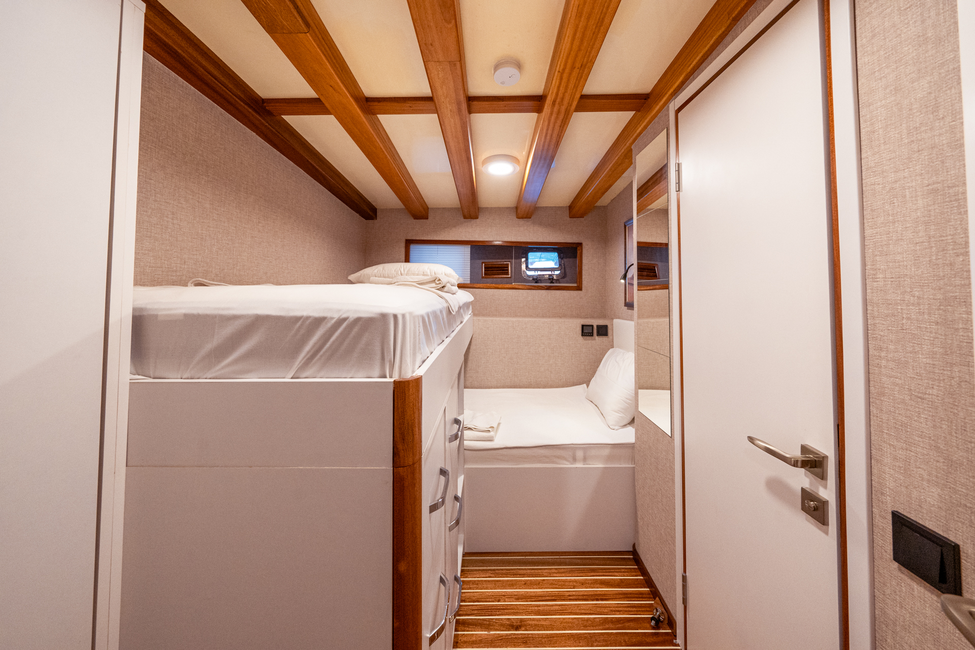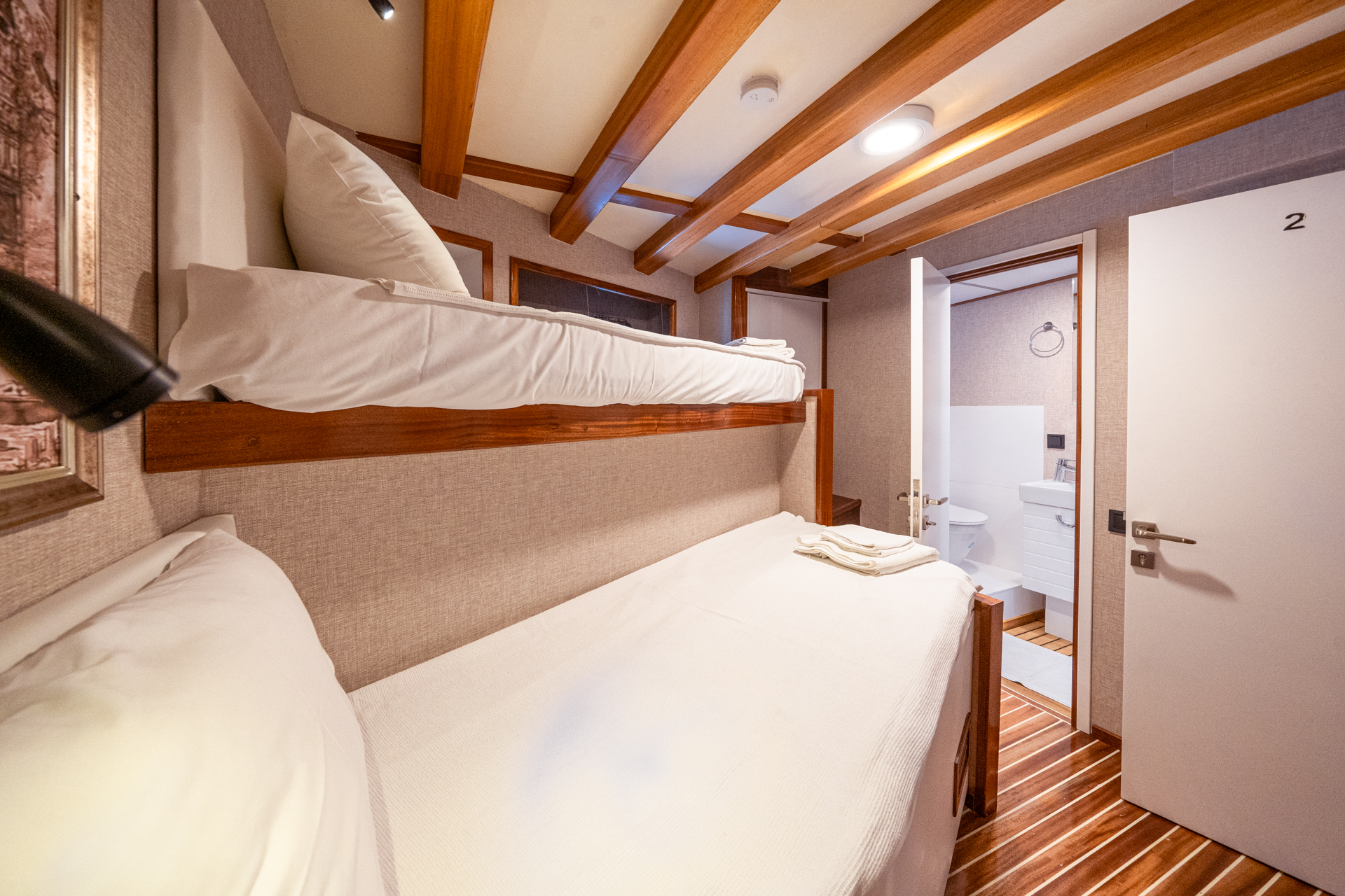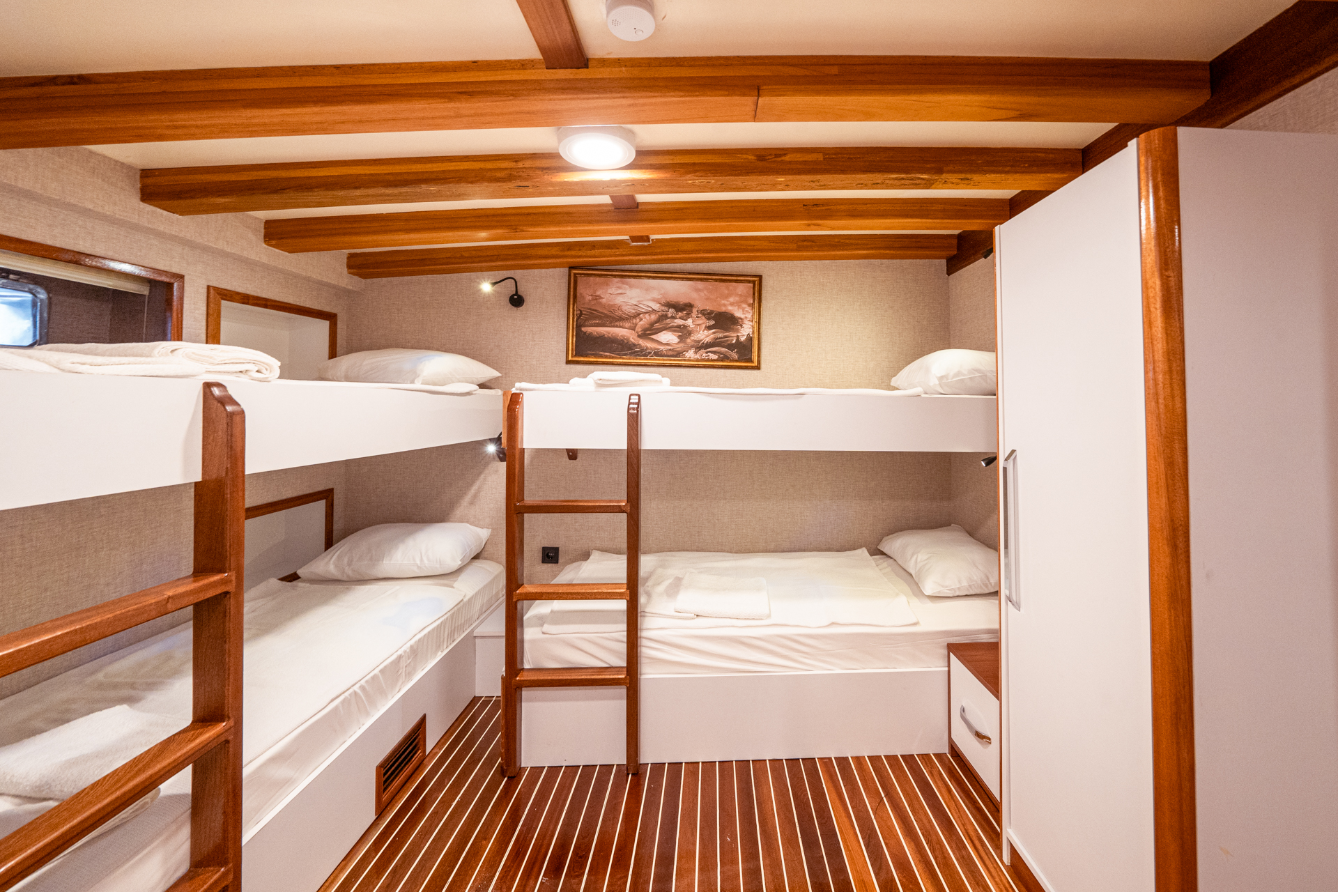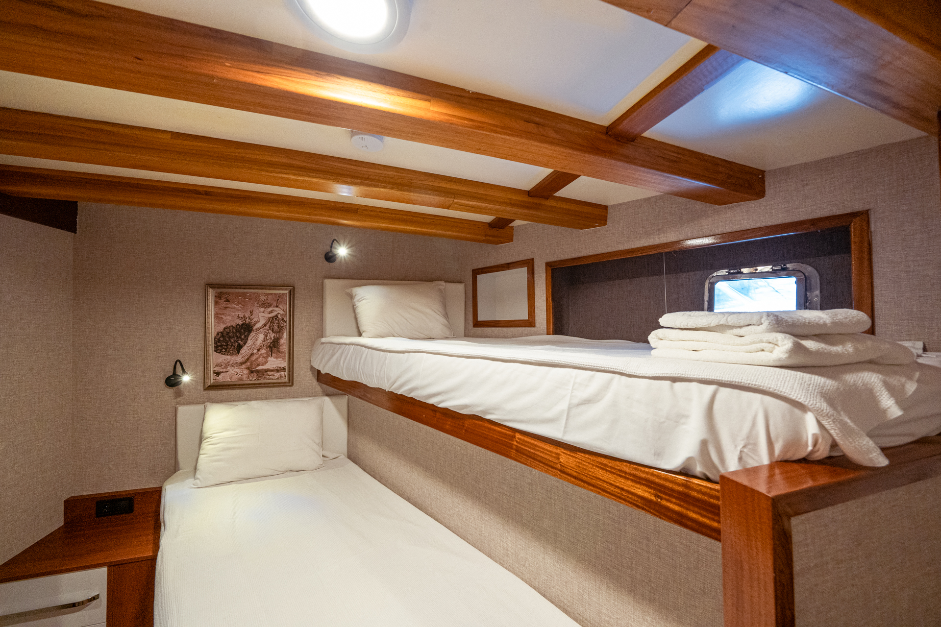 | 16 Kabinen, bis zu 36 Gäste; 4 Master, 8 Twin und 4 Quad-Bett-Kabinen, Salon und alle Kabinen mit Klimaanlage, Fernseher in allen Kabinen, Duschkabine und Haushaltstoiletten in allen Kabinen, separate Mannschaftskabinen |