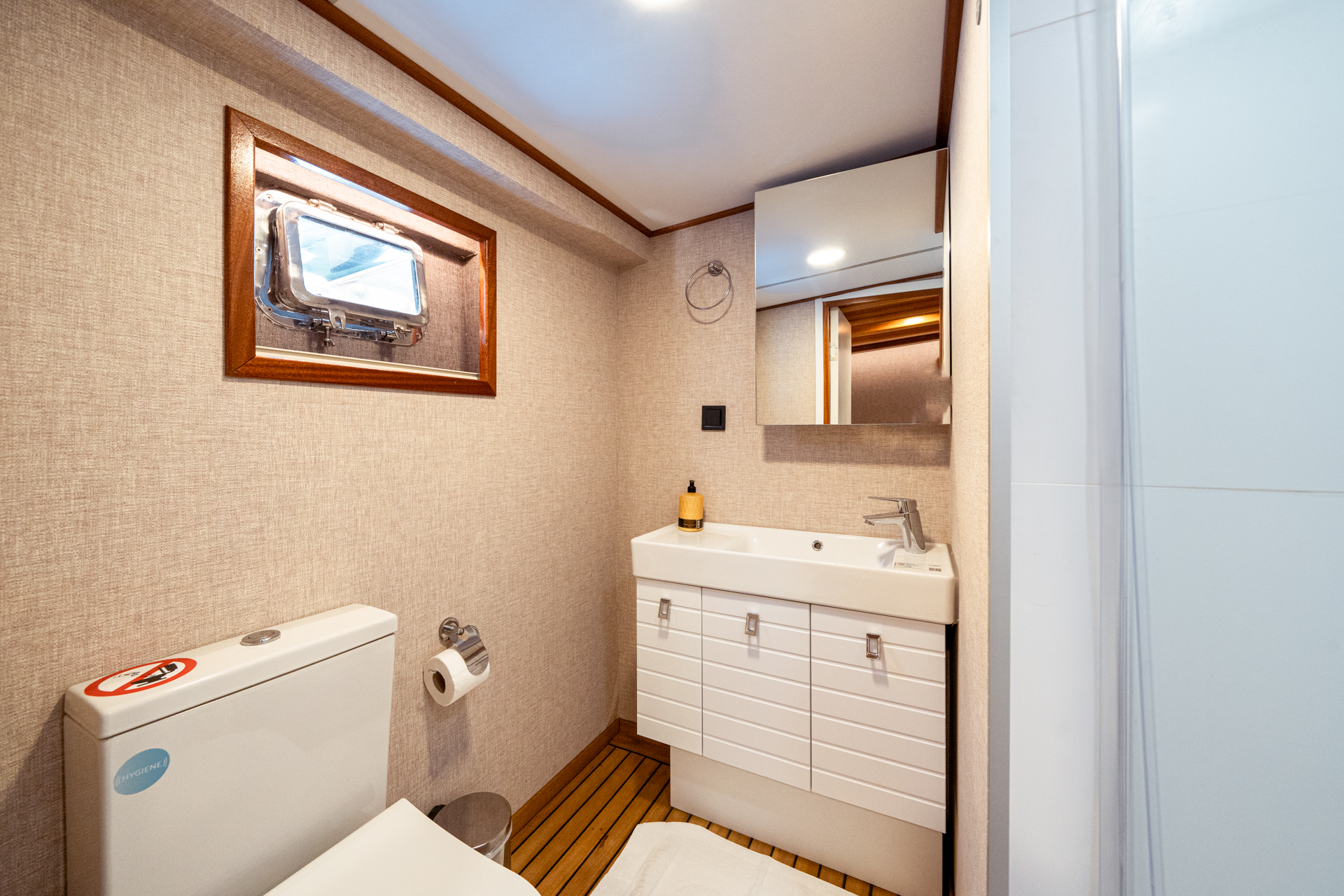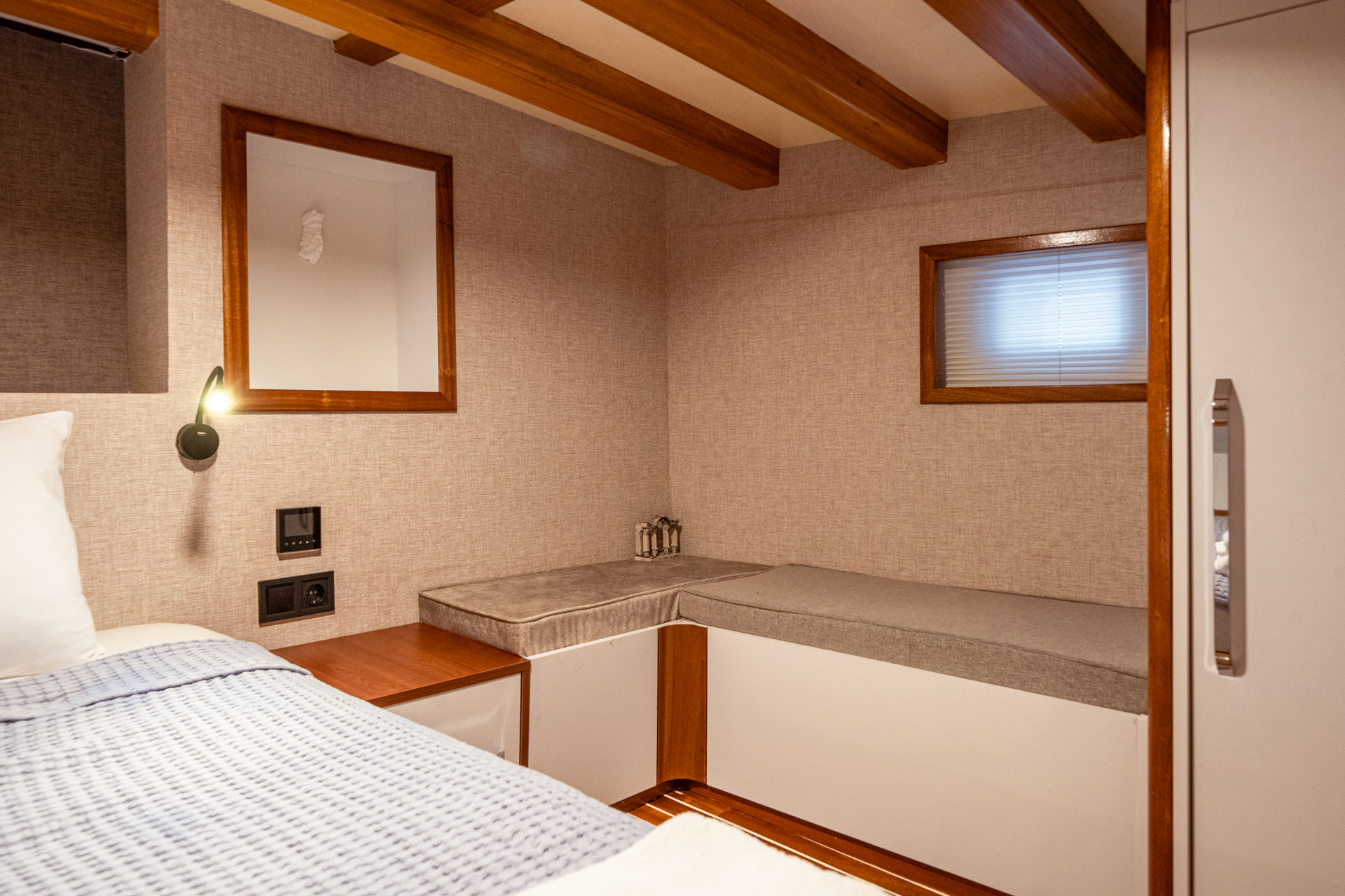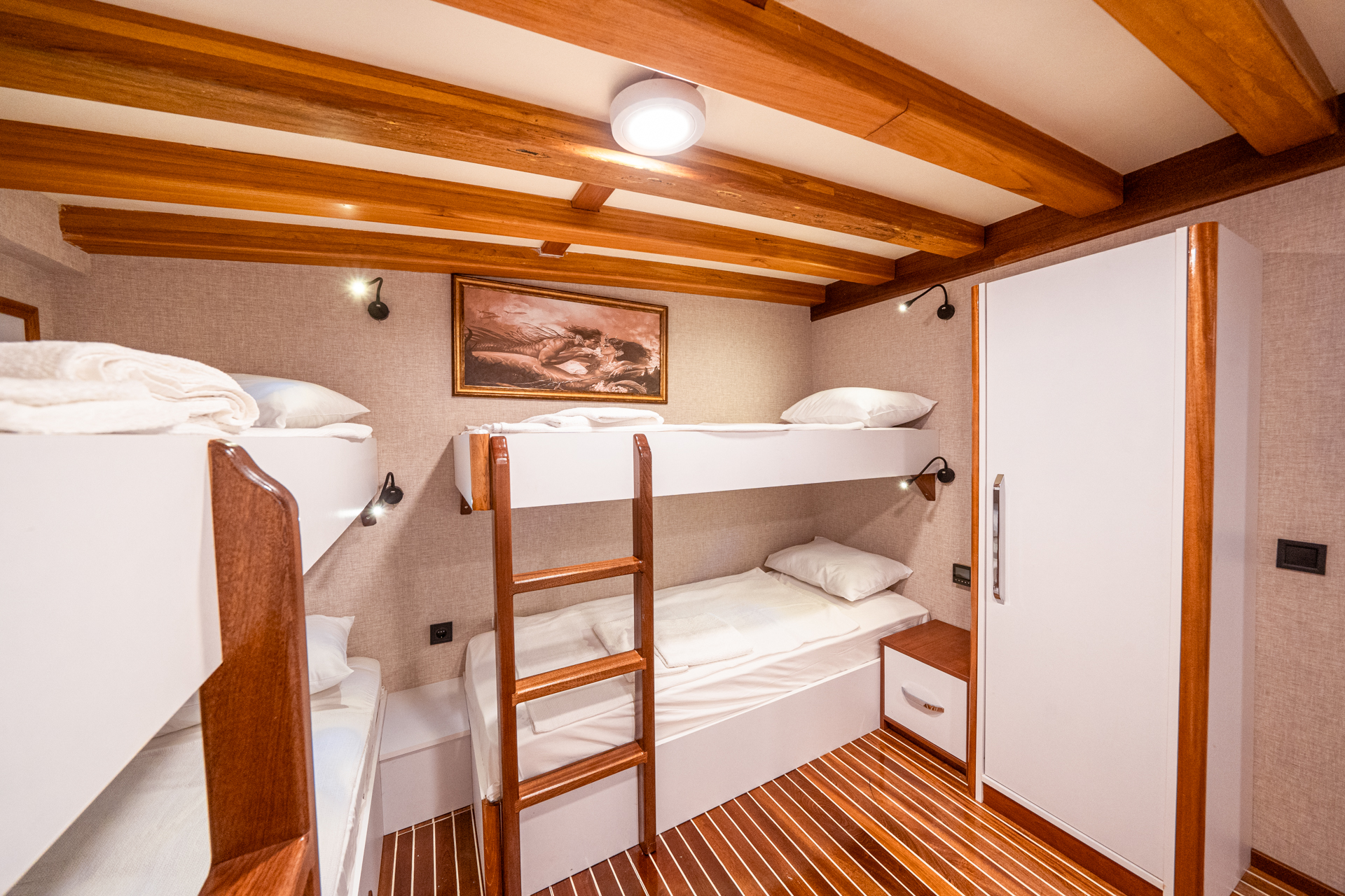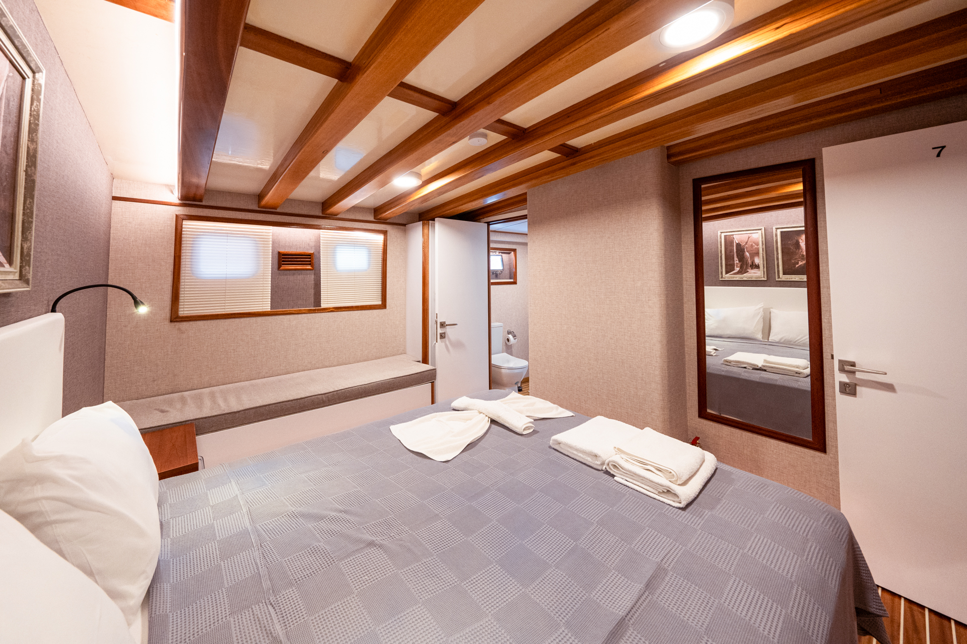 | 16 Kabinen, bis zu 36 Gäste; 4 Master, 8 Twin und 4 Quad-Bett-Kabinen, Salon und alle Kabinen mit Klimaanlage, Fernseher in allen Kabinen, Duschkabine und Haushaltstoiletten in allen Kabinen, separate Mannschaftskabinen |
