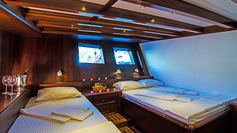 | Bis zu 32 Gäste; 10 Doppelkabinen, 4 Dreibettkabinen, 2 Zweibettkabinen mit Dusche und WC, Fernseher & DVD und Musikanlage in den Kabinen, separate Mannschaftskabinen. |