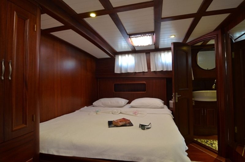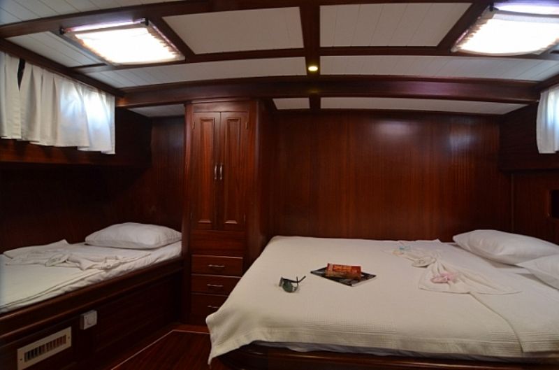 | Bis zu 4 Gästekapazität; 1 Masterkabine (1 Doppelbett + 1 Einzelbett) und 1 Doppelkabine. Alle Kabinen mit Klimaanlage und eigener Dusche und „Hometype“-Toilette. Alle Kabinen mit Bullaugen, Kleiderschrank, Schublade, Spiegel, Rauchmelder. Die Kabinen bestehen aus 1 Masterkabine mit einem Doppelbett plus einem Einzelbett und 1 Gästekabine. 2009 vom Stapel gelassen, bietet Platz für 5 Personen in 2 Kabinen. Das Bett. Alle Zimmer sind mit eigenem Bad, Dusche und WC ausgestattet. Diese Luxusyacht ist voll klimatisiert und verfügt über separate Mannschaftsquartiere. |
