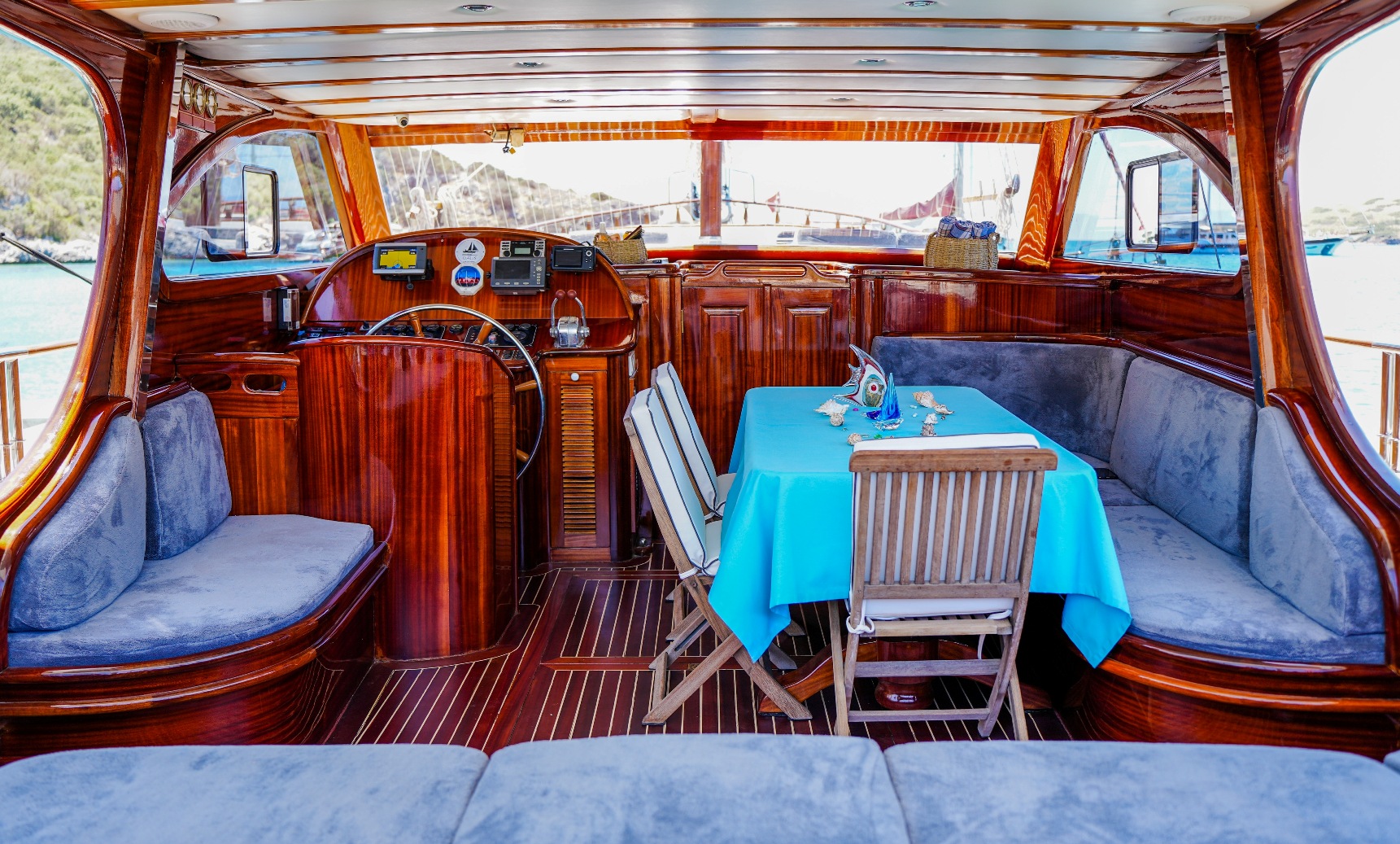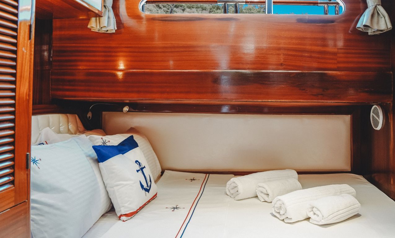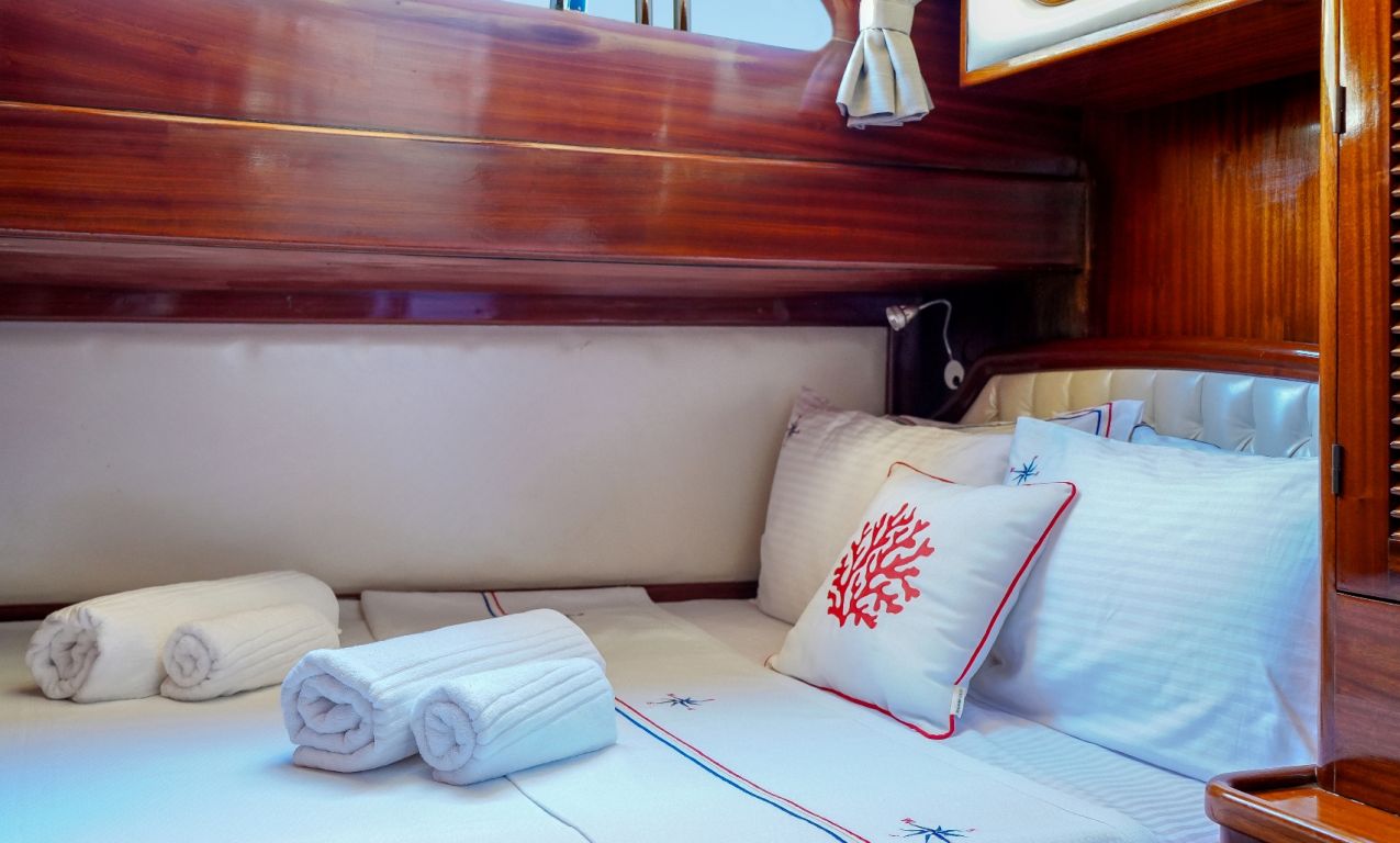 | Die Gulet Oalis ist eine 19 Meter lange traditionelle Holzyacht, gebaut 2011. Sie verfügt über eine Master- und zwei Doppelkabinen, jeweils mit eigenem Bad, und bietet Platz für bis zu sechs Gäste – perfekt für Familien oder kleine Gruppen. Das Deck wurde sorgfältig gestaltet und bietet gemütliche Sitz- und Essbereiche im Freien. Unter Deck befindet sich ein einladender Salon mit Essbereich und voll ausgestatteter Kombüse. Für Wassersport bietet Oalis ein Beiboot mit 25 PS Außenborder, ein Paddleboard, ein Kanu, Schnorchel- und Angelausrüstung. Angetrieben von zwei 280 PS Iveco-Motoren erreicht sie 9 Knoten. Ein 16 kVa Generator und 12V/24V/220V Stromversorgung sorgen für Komfort; Klimaanlage ist bis zu 5 Stunden täglich verfügbar. Die Gulet Oalis segelt entlang der Südwestküste der Türkei – ab Bodrum, Marmaris, Göcek oder Fethiye – und bringt Gäste in verborgene Buchten und türkisfarbene Gewässer. |