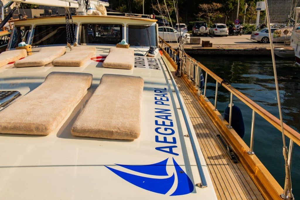 Es gibt ausreichend Sonnenkissen, Stühle und Serviersets für alle Gäste. Die Gulet Aegean Pearl verfügt dank ihrer vollwertigen Radio, GSM-Telefon-Navigationsausrüstung über eine vollwertige Ausstattung; Bodrum, Göcek, Marmaris, Fethiye usw. Sie können sicher zu unseren Zielen der Blauen Kreuzfahrt segeln.