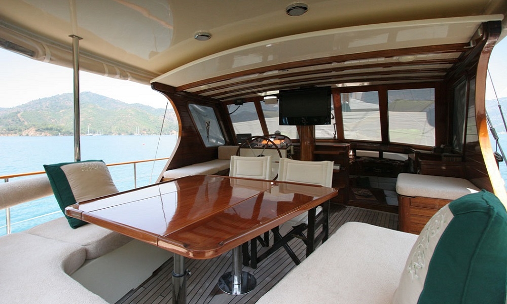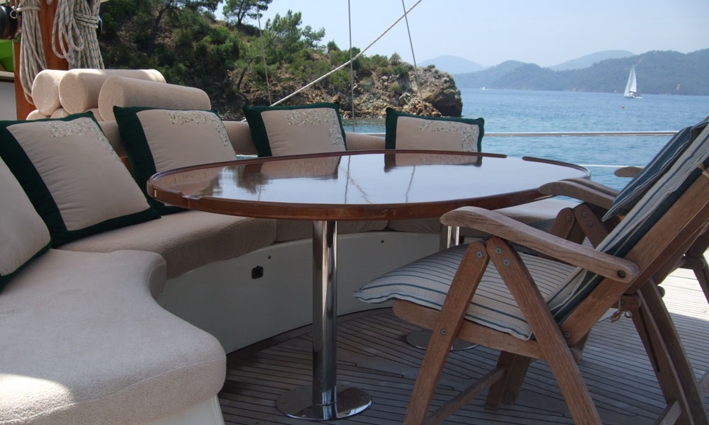 Es gibt ausreichend Sonnenkissen, Stühle und Serviersets für alle Gäste. Gulet Freya verfügt dank seiner vollwertigen Radio-, GSM-Telefon-Navigationsausrüstung; Bodrum, Göcek, Marmaris, Fethiye usw. Sie können sicher zu unseren Zielen der Blauen Kreuzfahrt segeln.