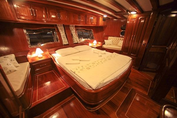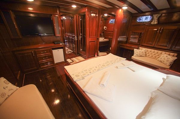 Unsere 24 m lange Gulet Furkan wurde 2010 gebaut. Unser Boot hat 4 Kabinen: 2 Master-, 1 Double- und 1 Twin-Kabinen, jede stilvoller und komfortabler, mit eigener Dusche, WC und Klimaanlage. 3 Es gibt separate Wohnbereiche, eine voll ausgestattete Küche, Essbereiche drinnen und draußen sowie Ruhebereiche für die Crew.