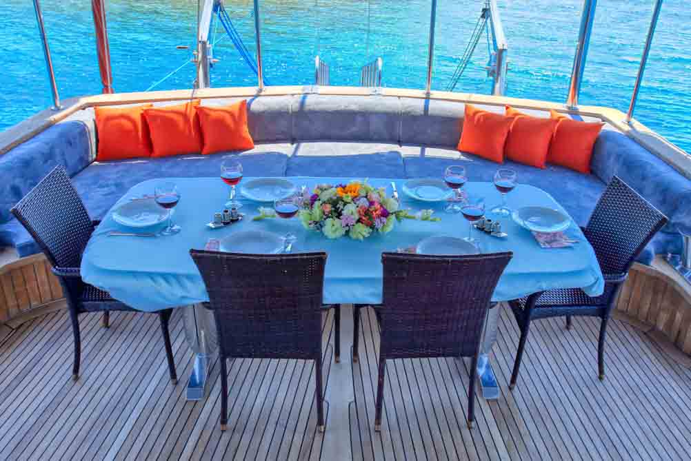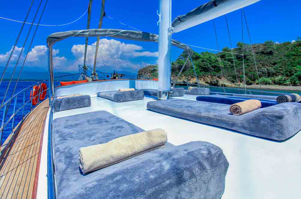Es gibt ausreichend Sonnenkissen, Stühle und Serviersets für alle Gäste. Die Gulet Hasay verfügt dank ihrer vollwertigen drahtlosen GSM-Telefonnavigationsausrüstung über Bodrum, Göcek, Marmaris, Fethiye usw. Sie können sicher zu unseren Zielen der blauen Kreuzfahrt segeln. LCD-Fernseher, DVD-Player und Stereoanlage stehen unseren geschätzten Gästen der Blauen Reise in der Lounge unserer Gulet zur Verfügung.