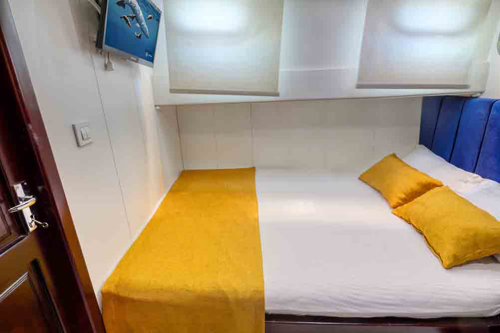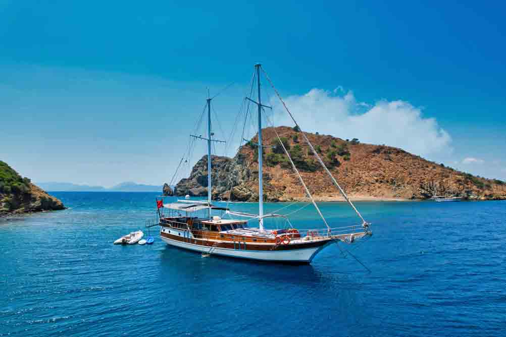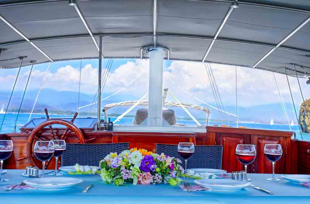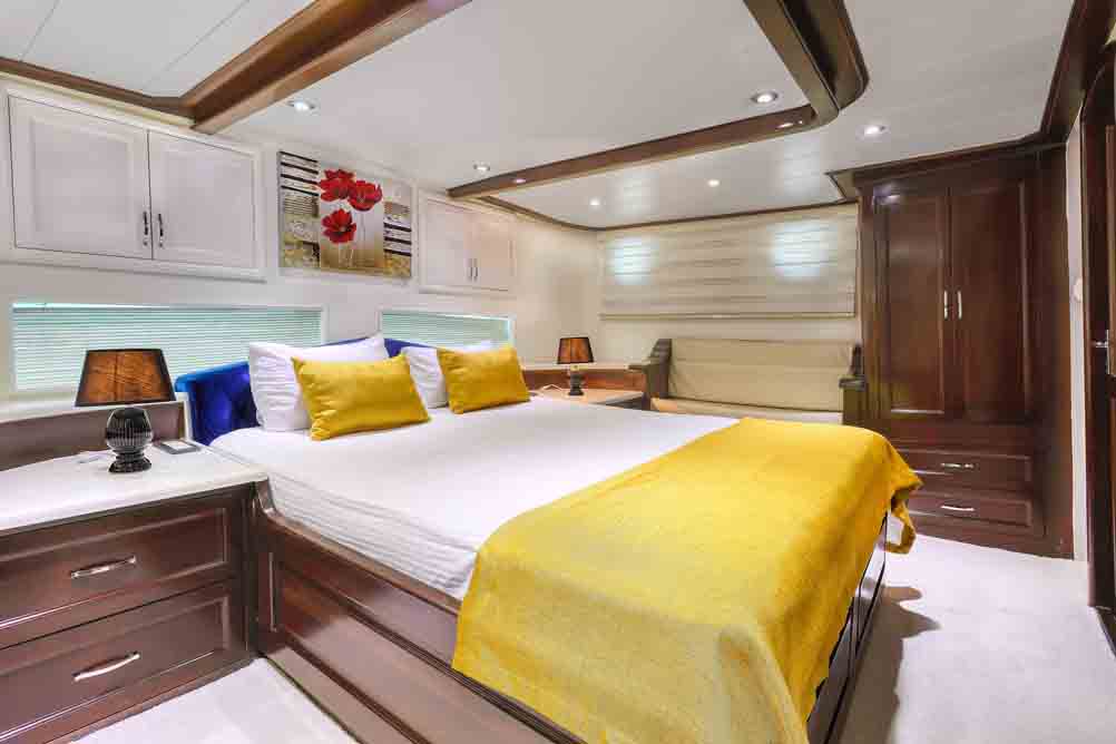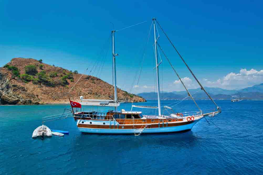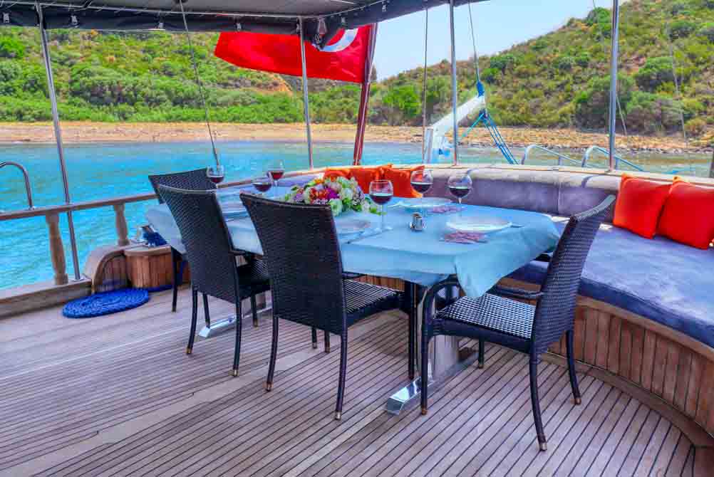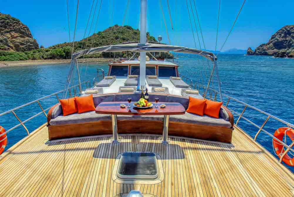 Unsere 22 m lange Gulet Hasay wurde 2006 gebaut. Ihre endgültige Form erhielt sie bei der Renovierung und Sanierung im Jahr 2012. Unser Boot verfügt über 4 Kabinen, 2 Master- und 2 Doppelkabinen, jede stilvoller und komfortabler, mit eigener Dusche, WC und Klimaanlage. Es gibt 3 separate Wohnbereiche, eine voll ausgestattete Küche, Essbereiche im Innen- und Außenbereich sowie Ruhebereiche für die Besatzung.