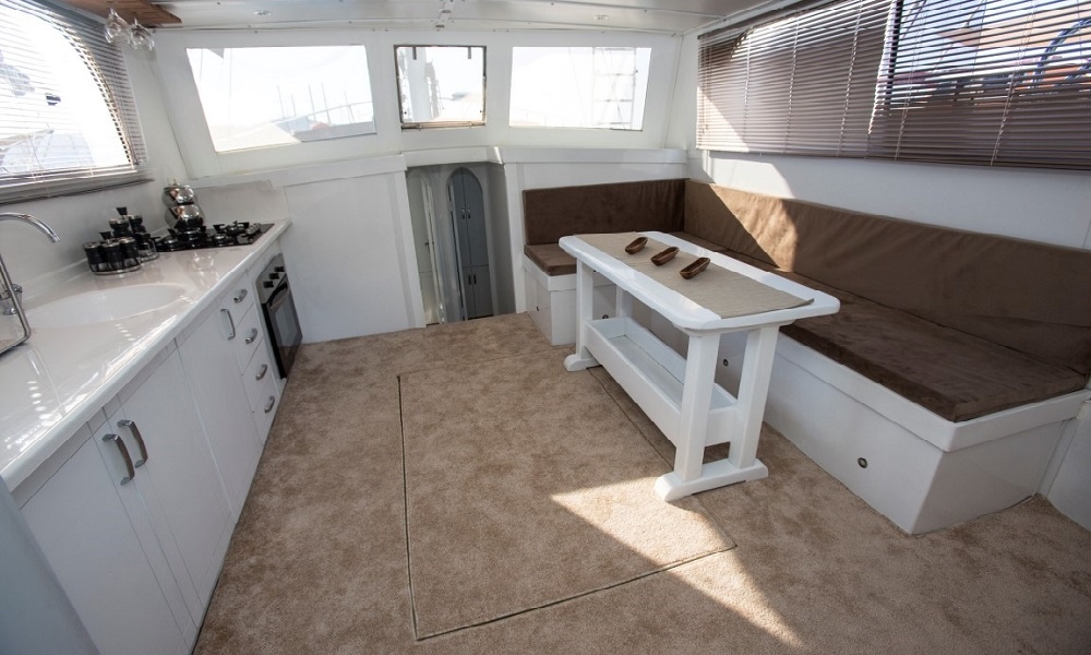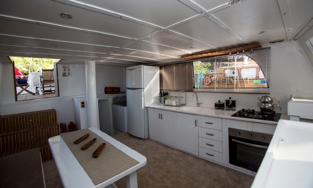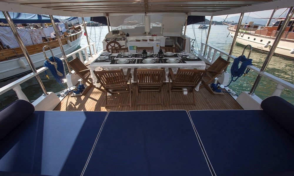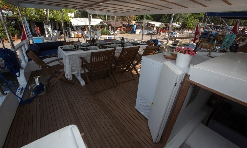 Es gibt genügend Sonnenkissen, Stühle und Service-Sets für alle Gäste. Dank seines vollwertigen Radios, GSM-Telefonnavigationsgeräten, Gulet Icarus; Sie können sicher zu unseren Zielen der Blauen Kreuzfahrt wie Bodrum, Göcek, Marmaris, Fethiye usw. kreuzen.