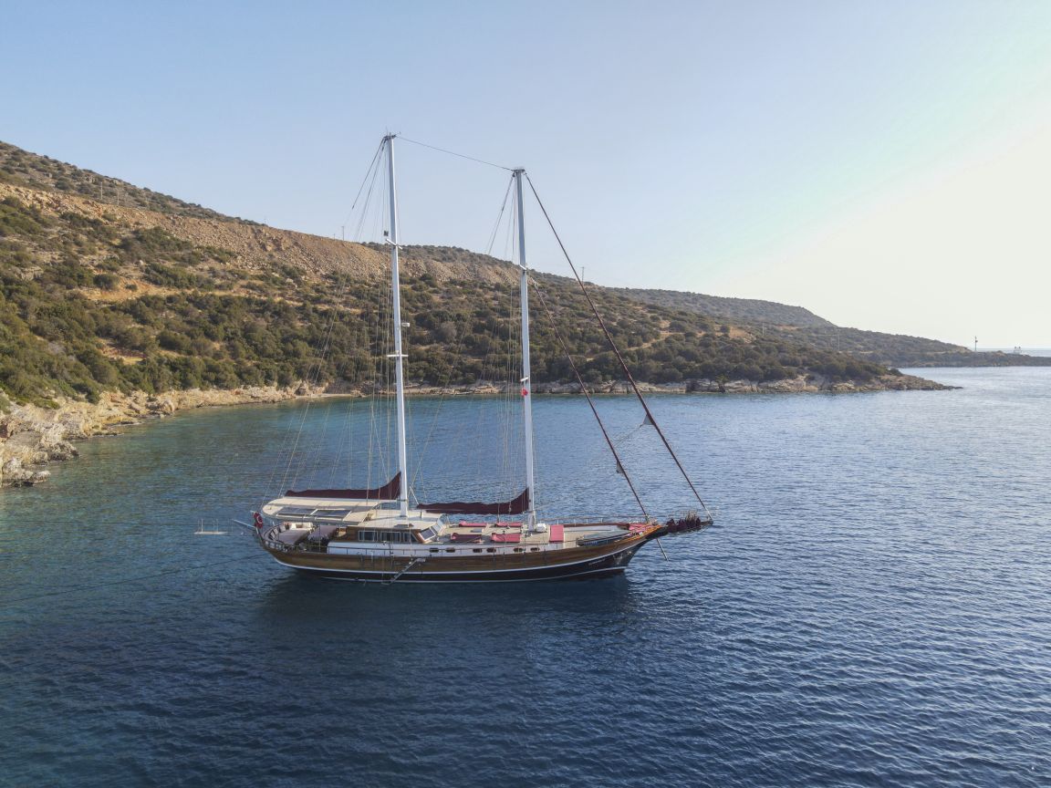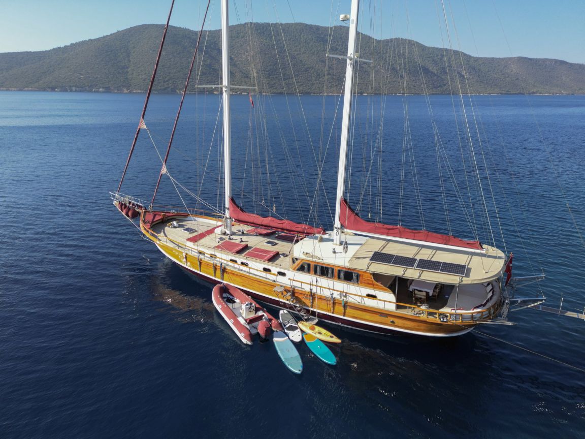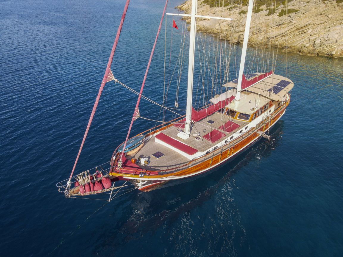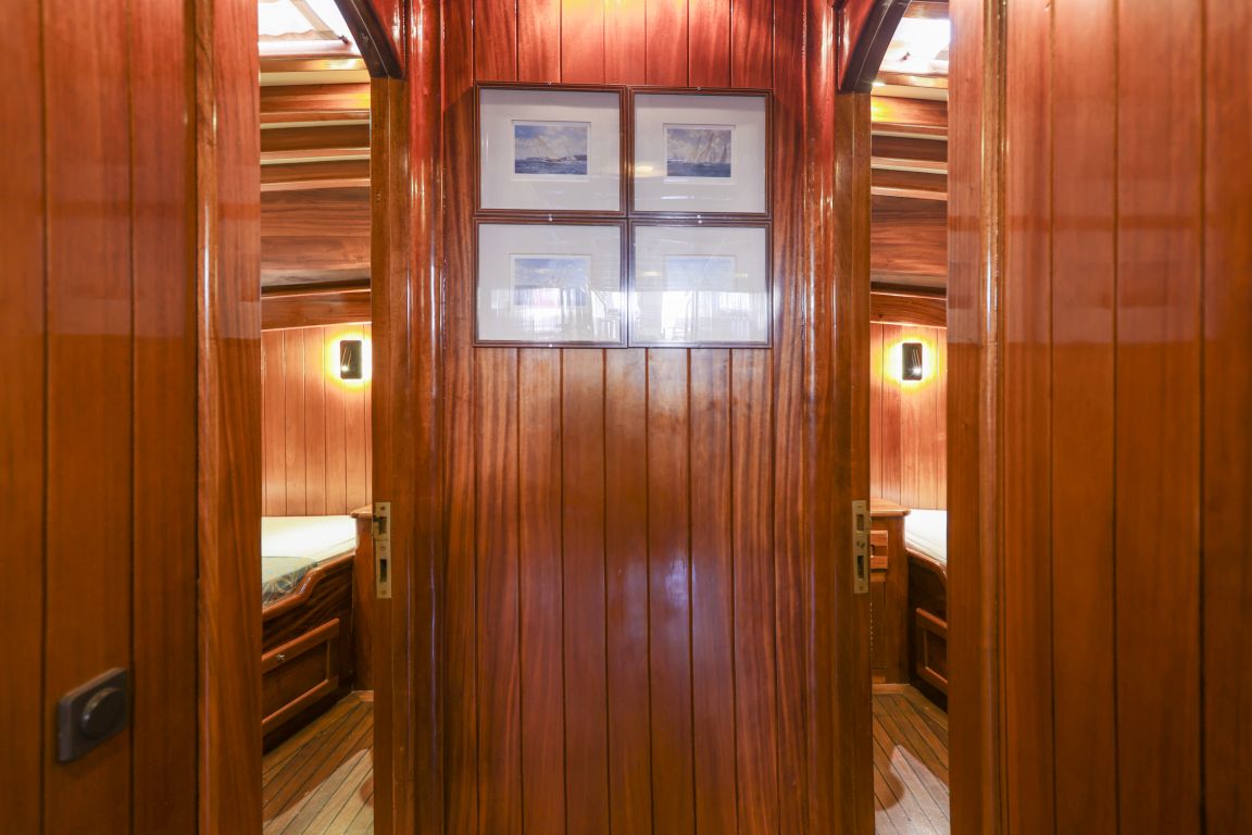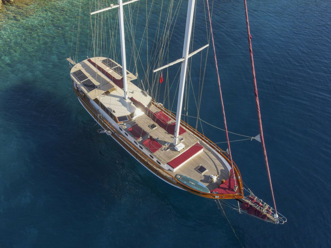 Unsere 24 m lange Gulet Il Fratello wurde 2002 gebaut. Sie verfügt über vier Kabinen: drei Doppelkabinen und eine Zweibettkabine. Jede Kabine ist stilvoller und komfortabler als die andere und mit eigener Dusche, WC und Klimaanlage ausgestattet. Es gibt separate Wohnbereiche, eine voll ausgestattete Küche, Essbereiche im Innen- und Außenbereich sowie Ruhebereiche für die Crew.