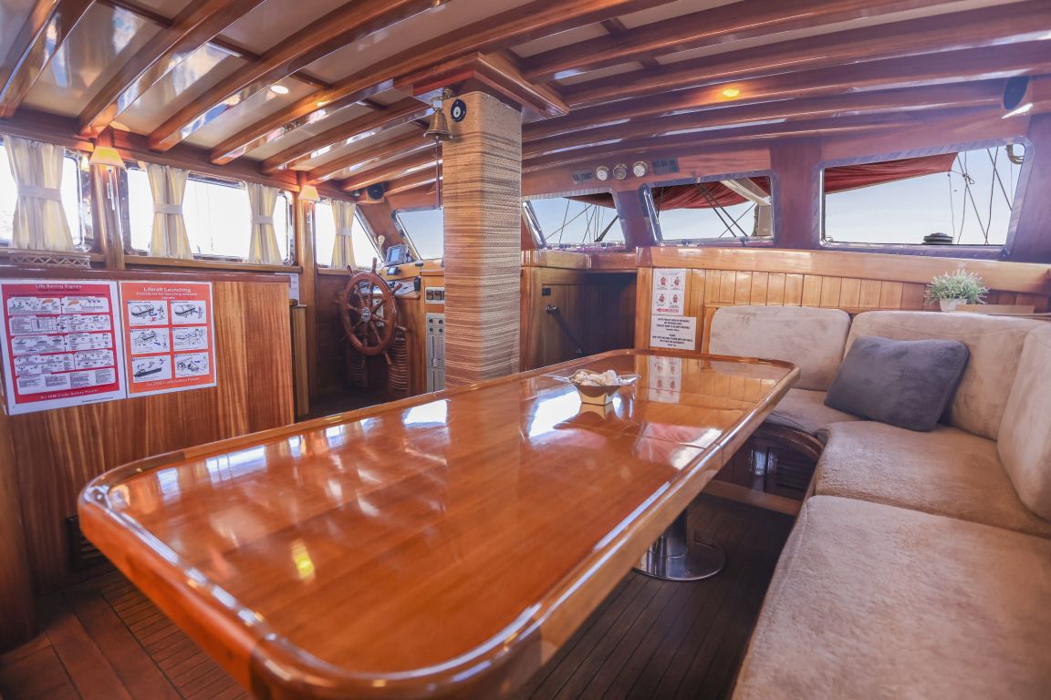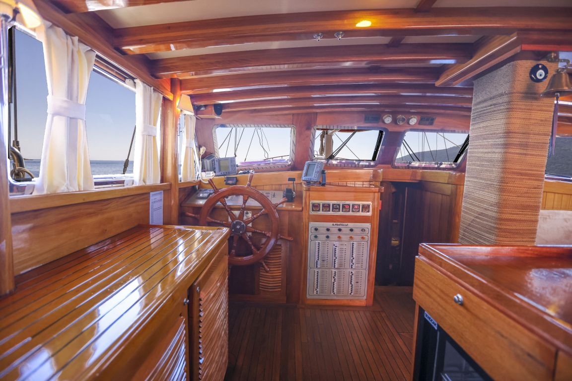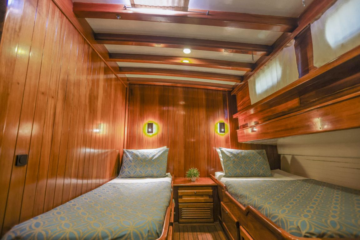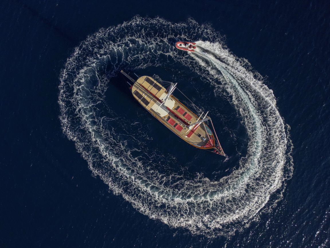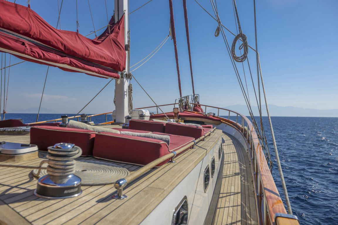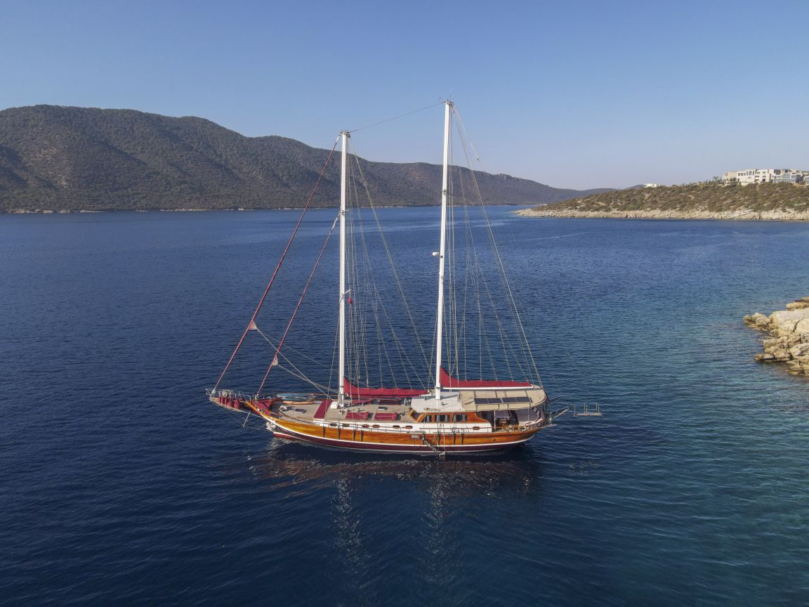 Unsere 24 m lange Gulet Il Fratello wurde 2002 gebaut. Sie verfügt über vier Kabinen: drei Doppelkabinen und eine Zweibettkabine. Jede Kabine ist stilvoller und komfortabler als die andere und mit eigener Dusche, WC und Klimaanlage ausgestattet. Es gibt separate Wohnbereiche, eine voll ausgestattete Küche, Essbereiche im Innen- und Außenbereich sowie Ruhebereiche für die Crew.