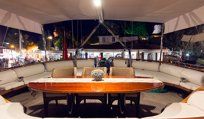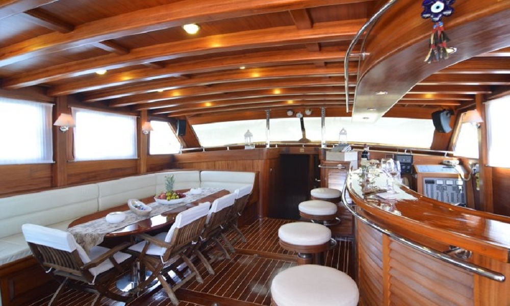 Diese Gulet bietet ausreichend Sonnenkissen, Sitzgruppen, Tische, Stühle und Geschirr für alle Gäste. Die Yacht, die unseren Gästen auf der Blauen Reise eine Kombination aus Komfort, Luxus und Ruhe bietet, hat eine Reichweite von 11 Seemeilen. Dusche, WC und Klimaanlage in allen Kabinen sorgen für Ihren Komfort. Im Salon mit großzügigen Sitzgruppen können Sie sich mit Bar, Musikanlage, DVD-Player, Backgammon und Spielkarten entspannen.