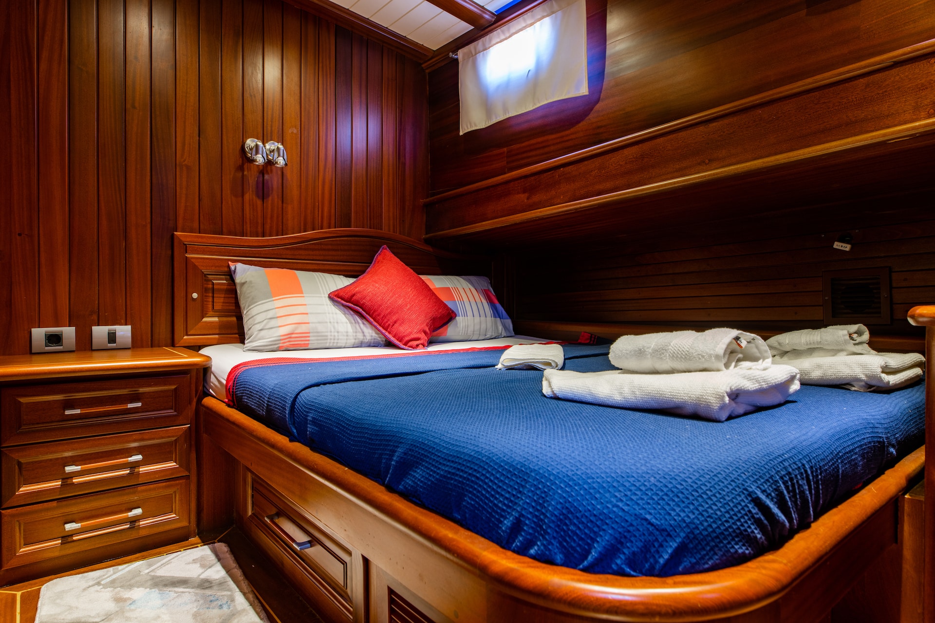 3 Doppel- und 1 Zweibettkabine, jede stilvoller und komfortabler als die andere, mit eigener Dusche, WC und Klimaanlage. 3 Es gibt separate Wohnbereiche, eine voll ausgestattete