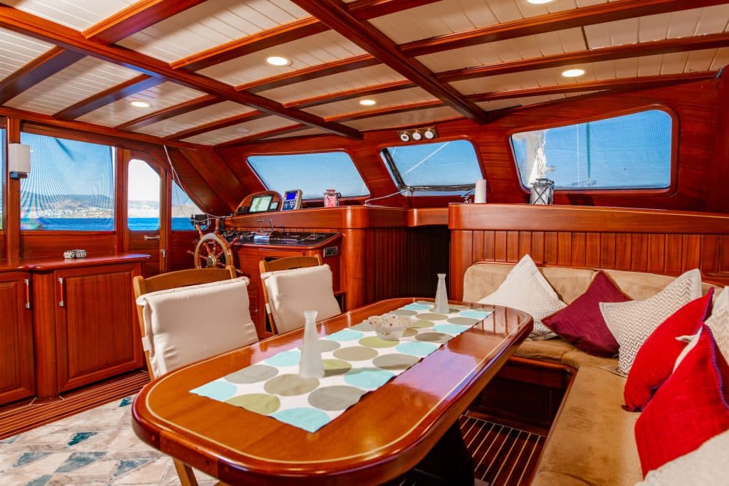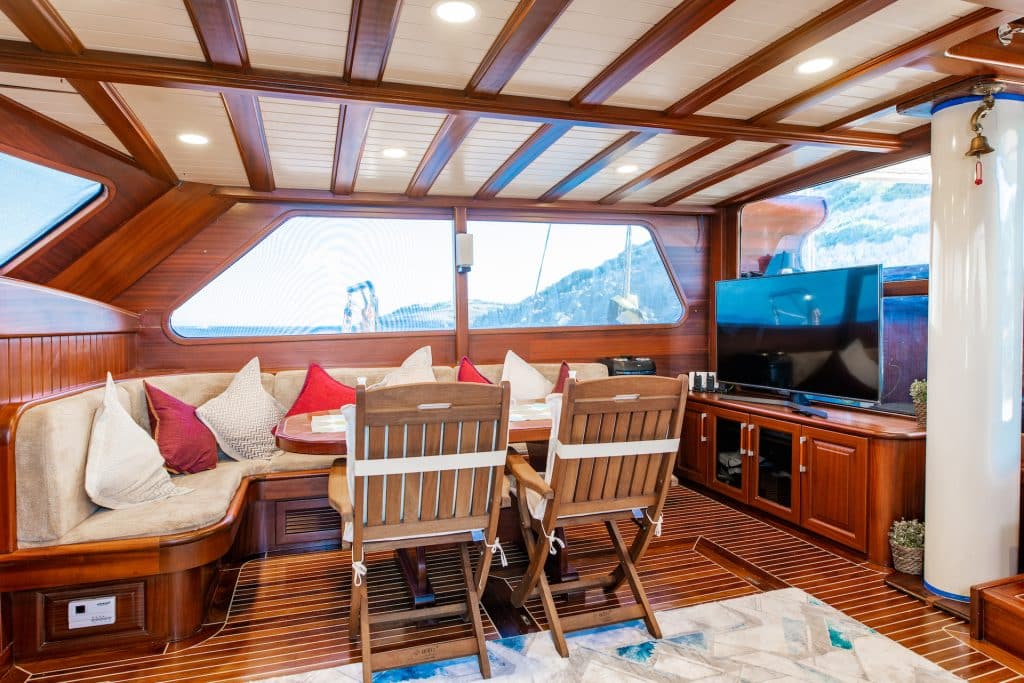 Küche, Essbereiche im Innen- und Außenbereich sowie Ruhebereiche für die Besatzung. Es gibt ausreichend Sonnenkissen, Stühle und Serviersets für alle Gäste. Gulet Sani Kaptan verfügt dank seiner vollwertigen drahtlosen GSM-Telefonnavigationsausrüstung; Bodrum,