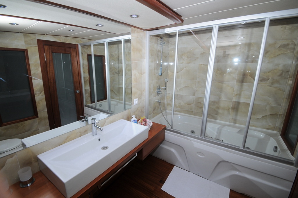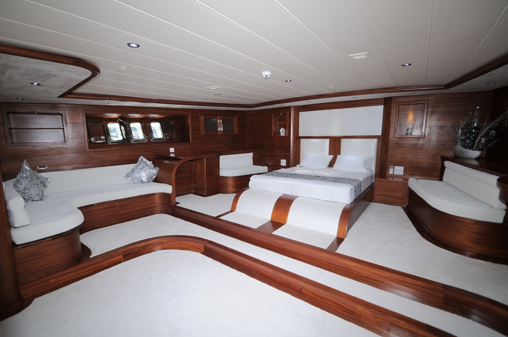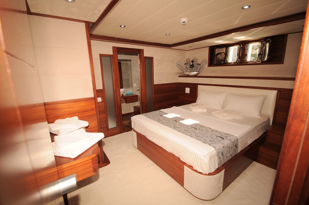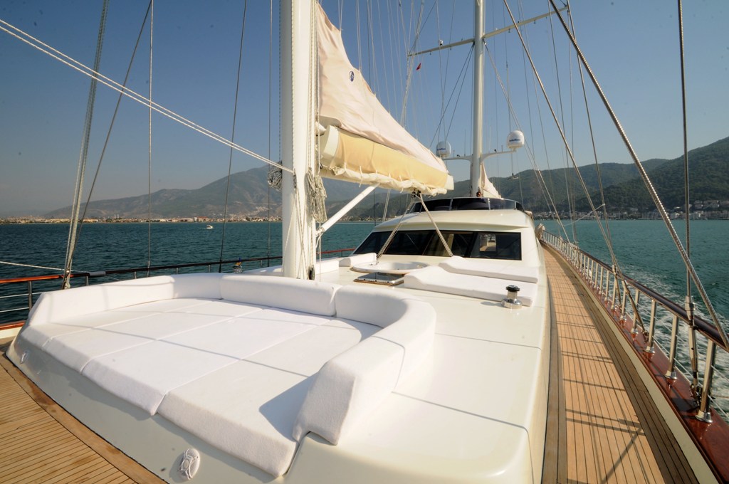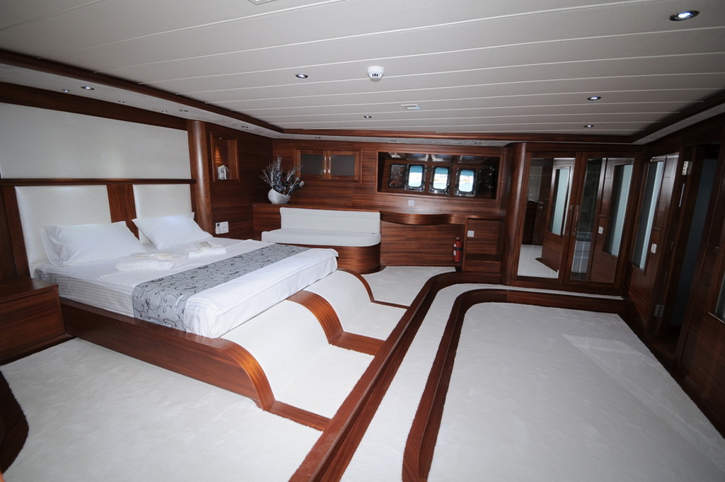 Unser 40 m langes Gulet Alessandro wurde 2011 gebaut. Unser Boot verfügt über 5 Kabinen, darunter 1 VIP-, 3 Master- und 1 Twin-Kabine, jede stilvoller und komfortabler, mit eigener Dusche, WC und Klimaanlage. 6 Es gibt separate Wohnbereiche, eine voll ausgestattete Küche, Essbereiche im Innen- und Außenbereich sowie Ruhebereiche für die Besatzung. Es gibt ausreichend Sonnenkissen, Stühle und Serviersets für alle Gäste. Gulet Alessandro verfügt dank seiner vollwertigen Radio-, GSM-Telefon-Navigationsausrüstung; Bodrum, Göcek, Marmaris, Fethiye usw. Sie können sicher zu unseren Zielen der Blauen Kreuzfahrt segeln.
