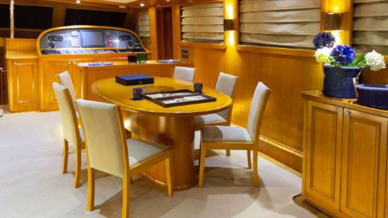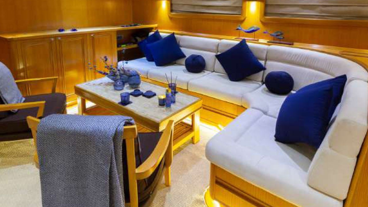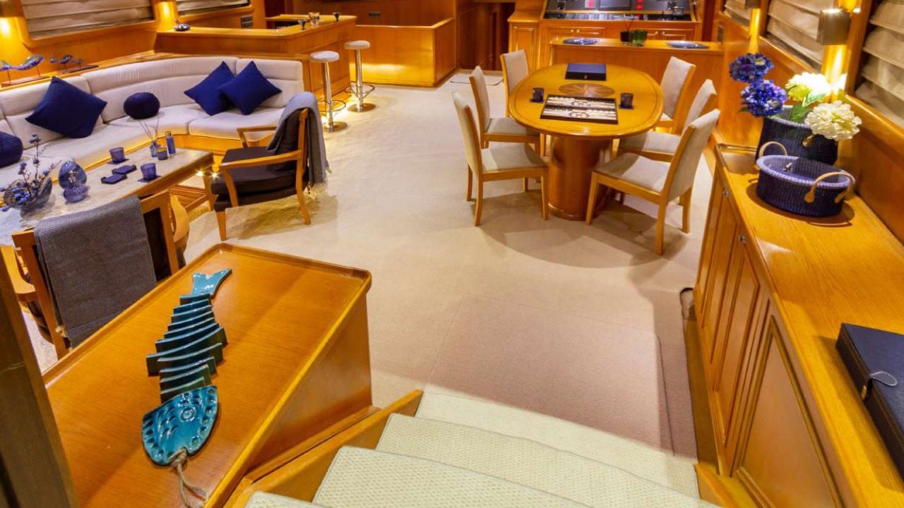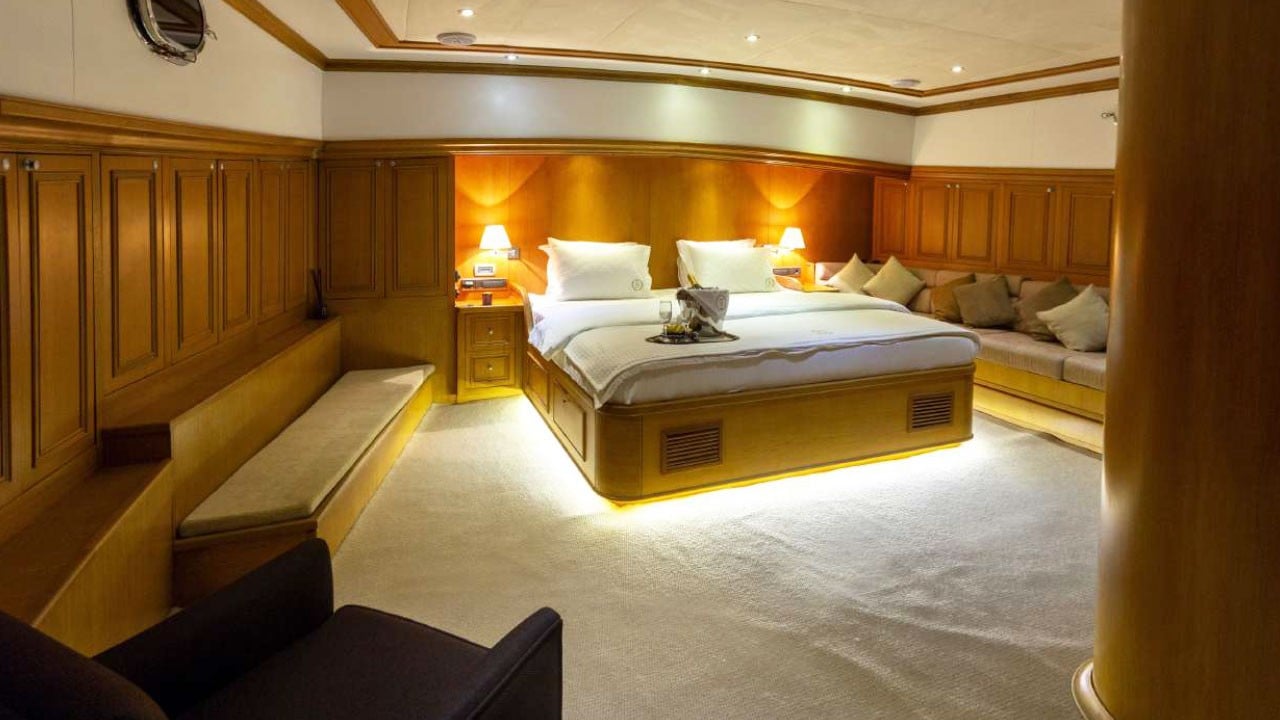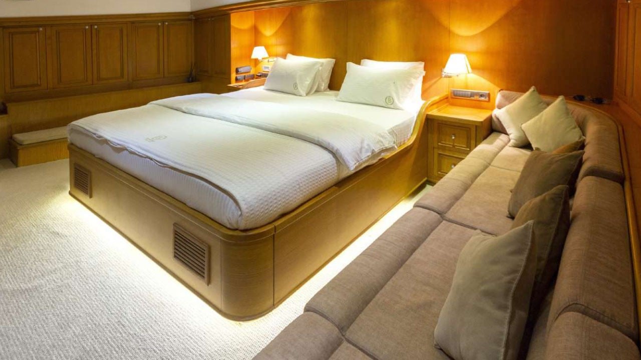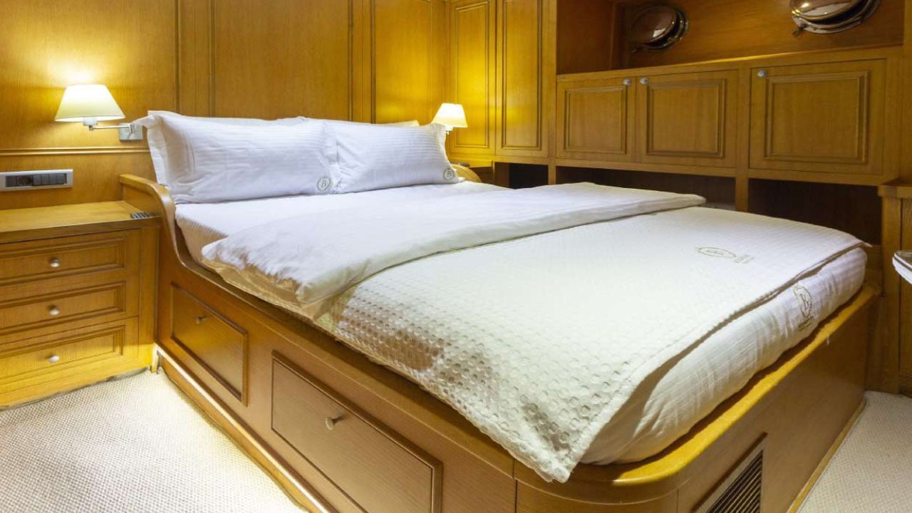 | Kapazität für bis zu 12 Gäste; 1 VIP, 1 Master, 3 Doppelkabinen, Duschkabine und Toiletten in allen Kabinen, separate Mannschaftskabinen. |