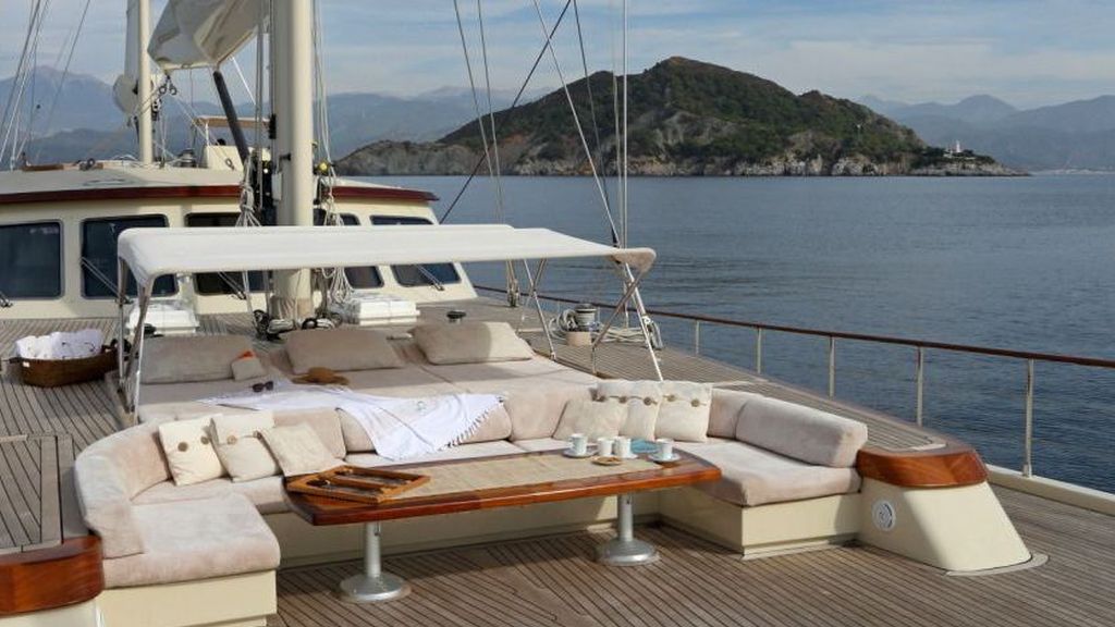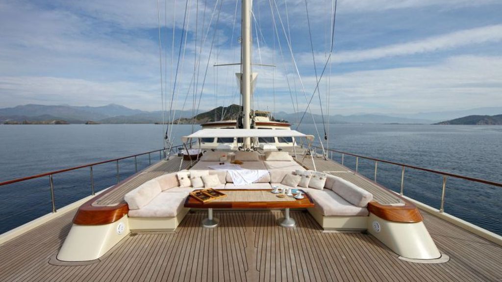 Unsere 42,50 m lange Gulet Daima wurde 2009 gebaut. Unser Boot verfügt über 5 Kabinen, darunter 1 Master, 2 Doppel und 2 Zweibettkabinen, jede stilvoller und komfortabler, mit eigener Dusche, WC und Klimaanlage. 7 Es gibt separate Wohnbereiche, eine voll ausgestattete Küche, Essbereiche im Innen- und Außenbereich sowie Ruhebereiche für die Besatzung. Es gibt ausreichend Sonnenkissen, Stühle und Serviersets für alle Gäste. Dank seiner vollwertigen Radio-, GSM-Telefon und Navigationsausrüstung bietet Gulet Always; Bodrum, Göcek, Marmaris, Fethiye usw. Sie können sicher zu unseren Zielen der Blauen Kreuzfahrt segeln.
