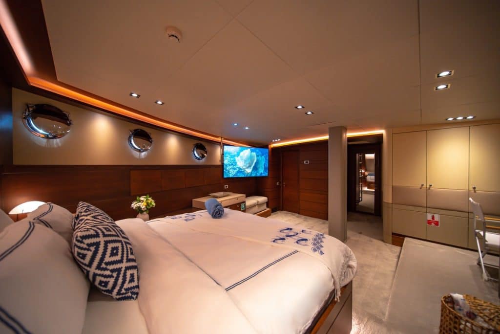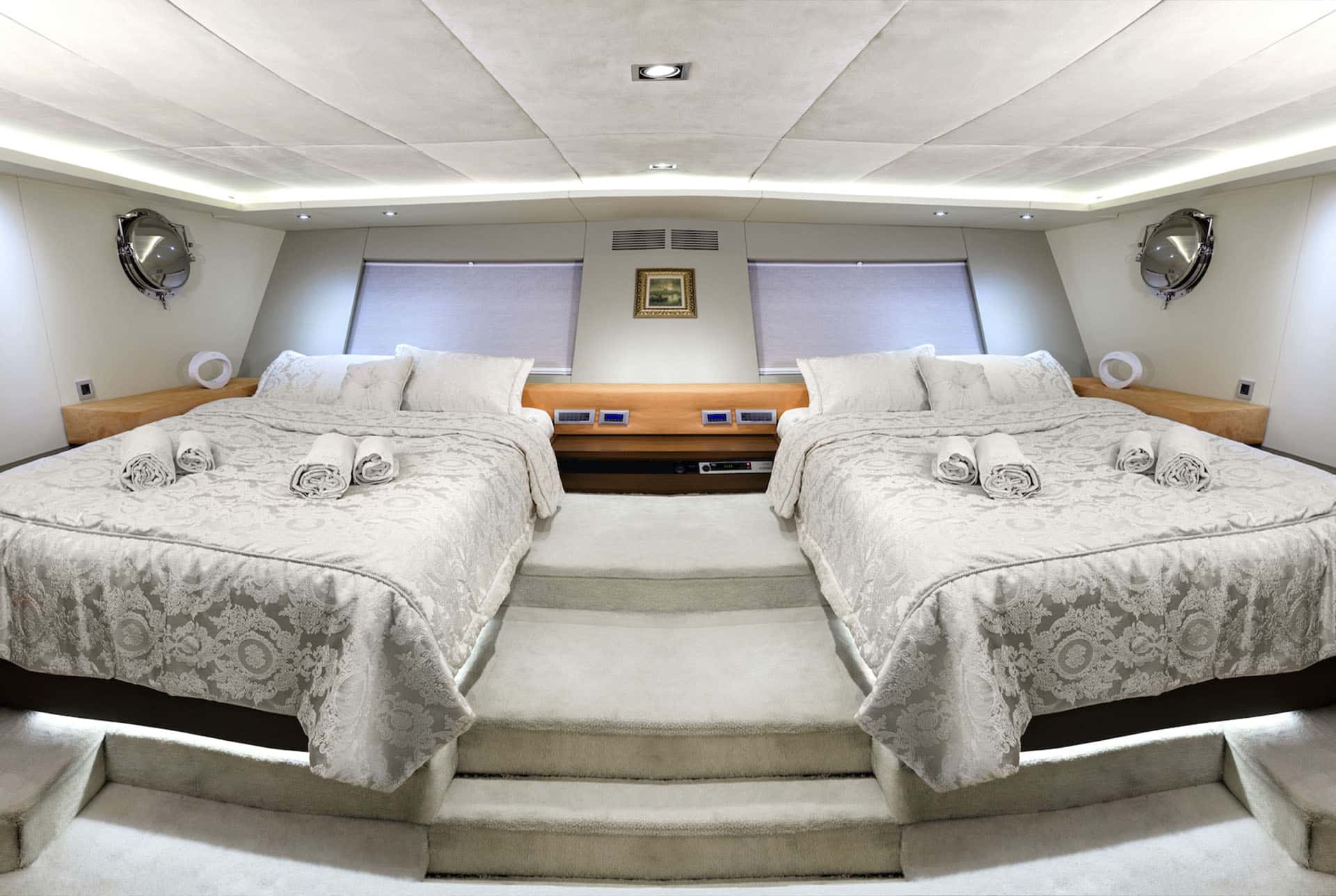 Bis zu 10 Gäste; 2 Master-, 1 Doppel-, 2 Zweibettkabinen, Klimaanlage, Kleiderschrank, Duschkabine und Haushaltstoiletten in allen Kabinen, separate Mannschaftskabinen. |