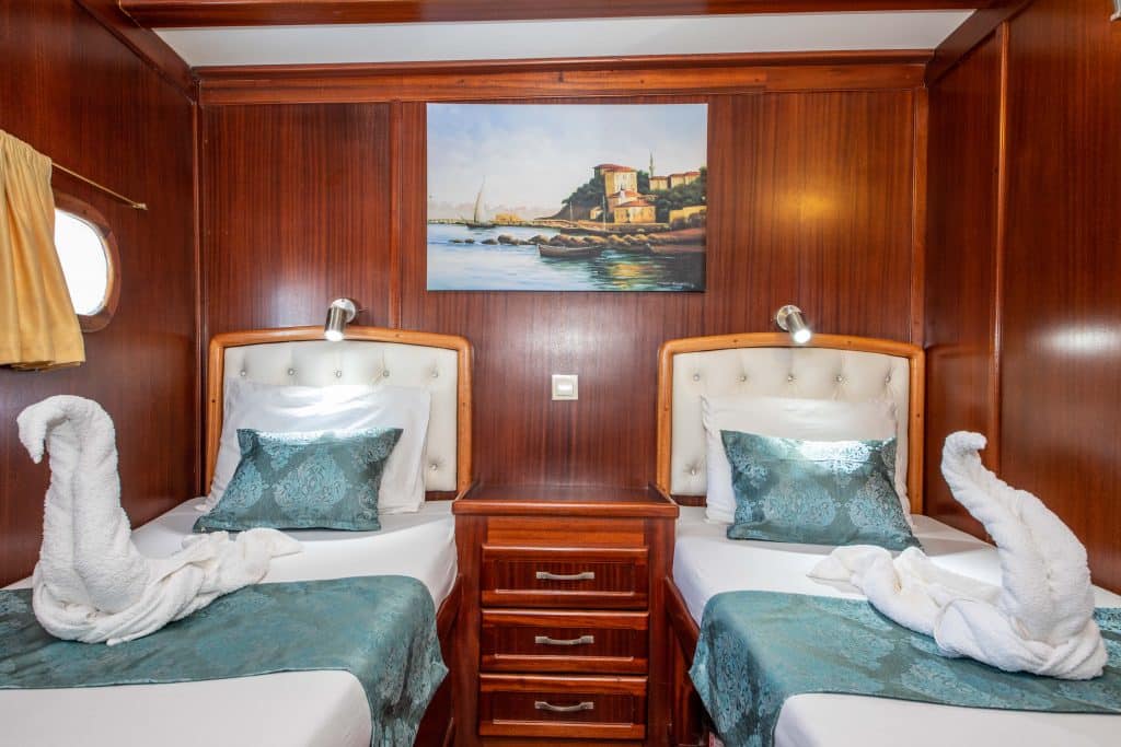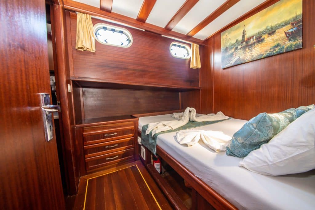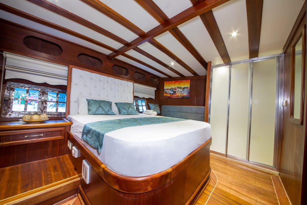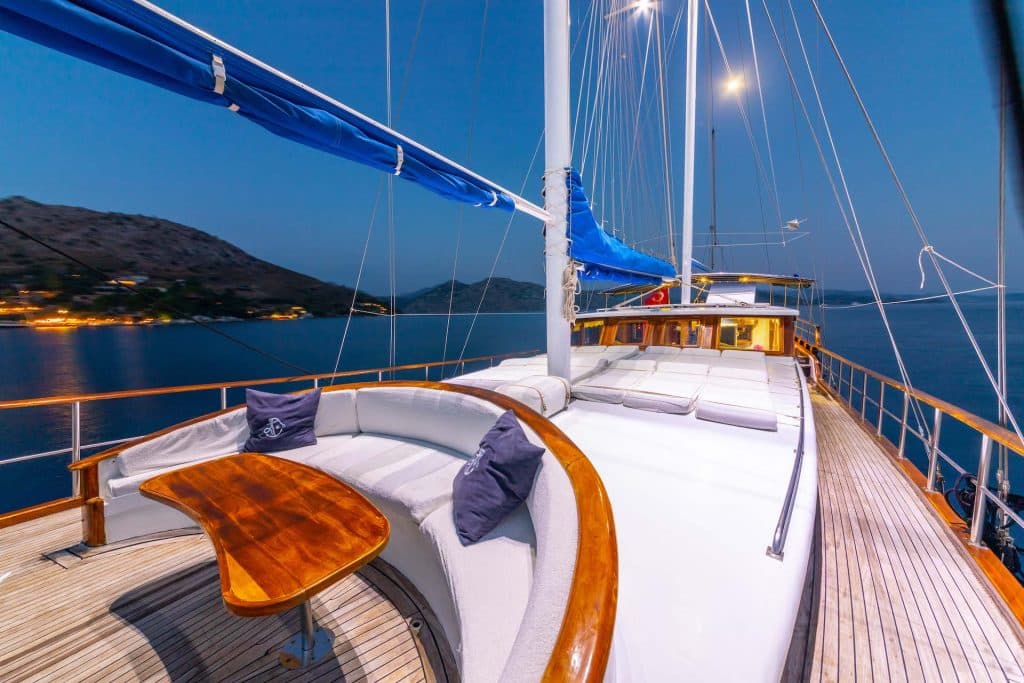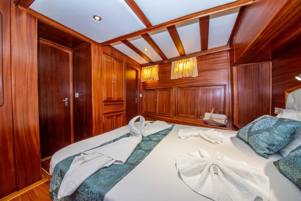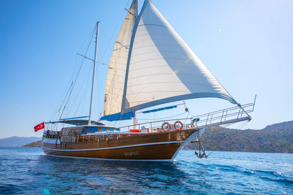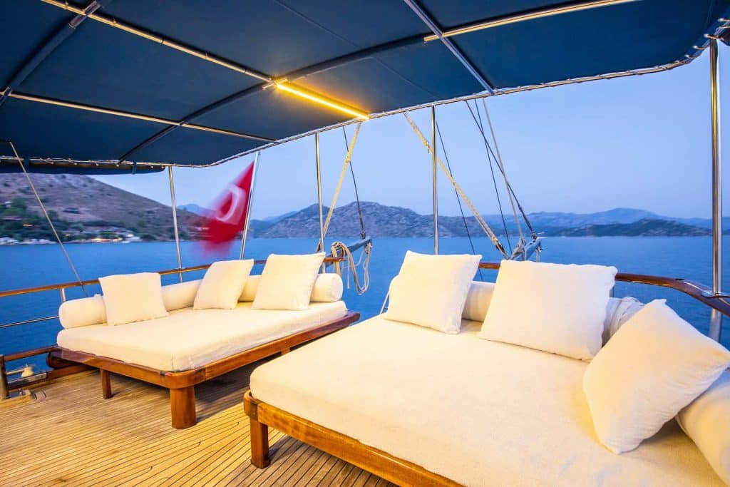 Unsere 24 m lange Gulet Gokce 1 wurde 1996 gebaut. Ihre endgültige Form erhielt sie mit der Renovierung und Sanierung im Jahr 2011. Unser Boot verfügt über 5 Kabinen, 1 Master- und 4 Doppelkabinen, jede stilvoller und komfortabler, mit eigener Dusche, WC und Klimaanlage. 3 Es gibt separate Wohnbereiche, eine voll ausgestattete Küche, Essbereiche im Innen- und Außenbereich sowie Ruhebereiche für die Besatzung. Es gibt ausreichend Sonnenkissen, Stühle und Serviersets für alle Gäste. Dank seiner vollwertigen Wireless-, GSM-Telefon- und Navigationsausrüstung bietet Gulet Gokce 1; Bodrum, Göcek, Marmaris, Fethiye usw. Sie können sicher zu unseren Zielen der Blauen Kreuzfahrt segeln.