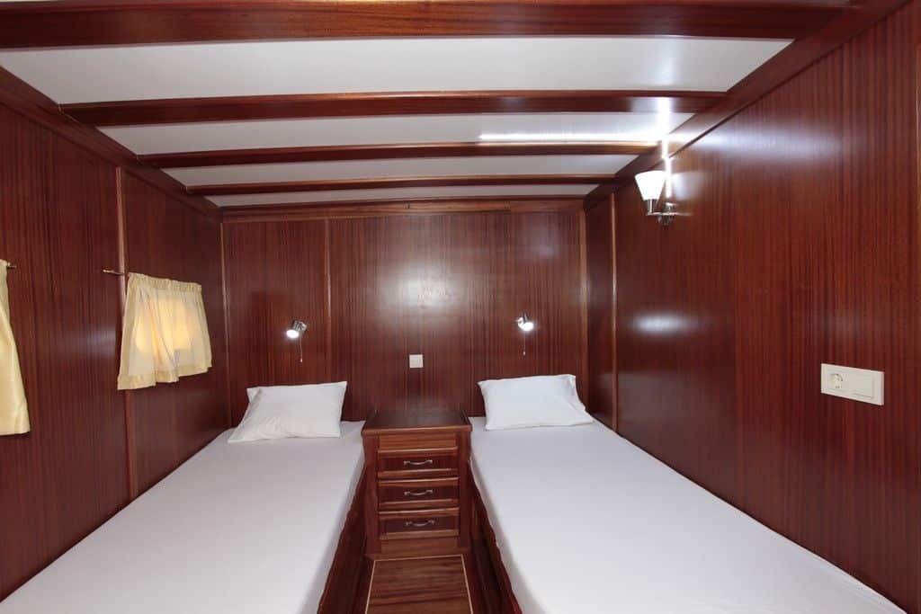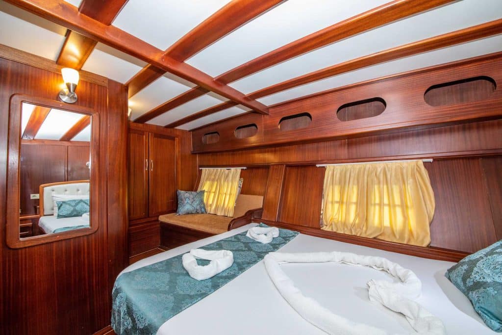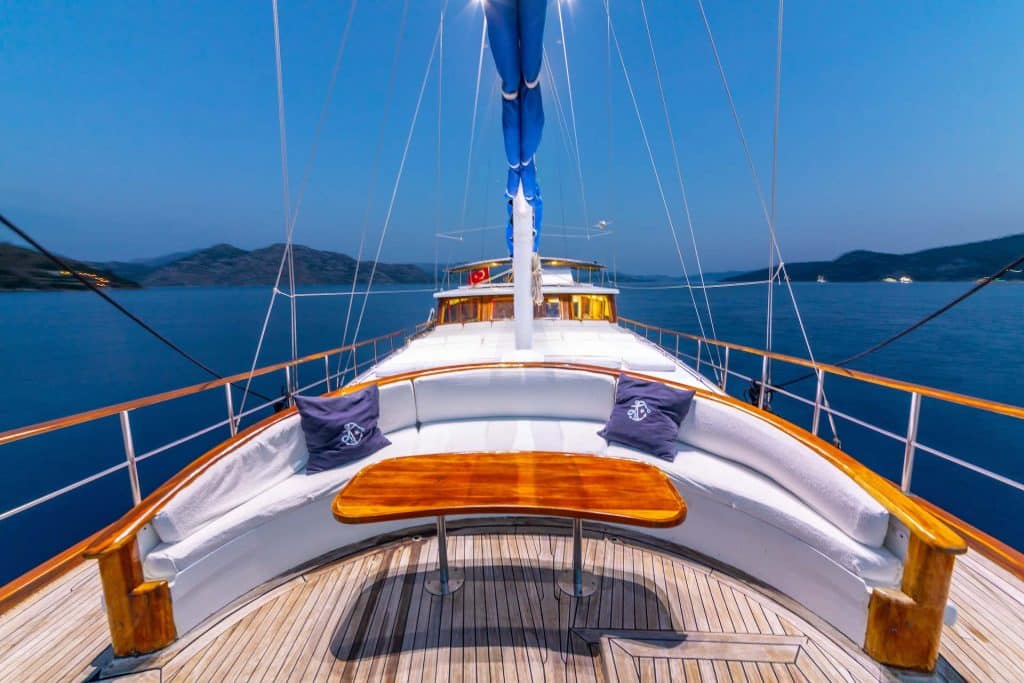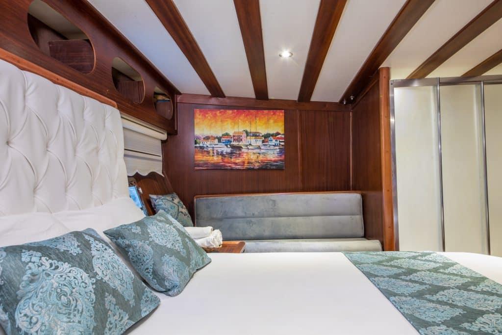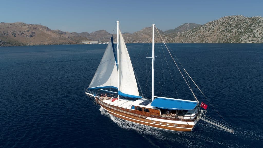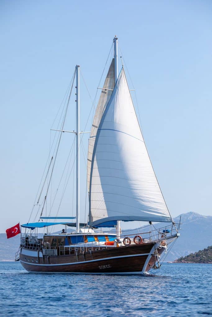 Unsere 24 m lange Gulet Gokce 1 wurde 1996 gebaut. Ihre endgültige Form erhielt sie mit der Renovierung und Sanierung im Jahr 2011. Unser Boot verfügt über 5 Kabinen, 1 Master- und 4 Doppelkabinen, jede stilvoller und komfortabler, mit eigener Dusche, WC und Klimaanlage. 3 Es gibt separate Wohnbereiche, eine voll ausgestattete Küche, Essbereiche im Innen- und Außenbereich sowie Ruhebereiche für die Besatzung. Es gibt ausreichend Sonnenkissen, Stühle und Serviersets für alle Gäste. Dank seiner vollwertigen Wireless-, GSM-Telefon- und Navigationsausrüstung bietet Gulet Gokce 1; Bodrum, Göcek, Marmaris, Fethiye usw. Sie können sicher zu unseren Zielen der Blauen Kreuzfahrt segeln.