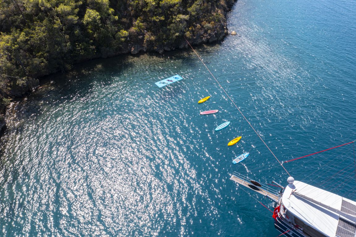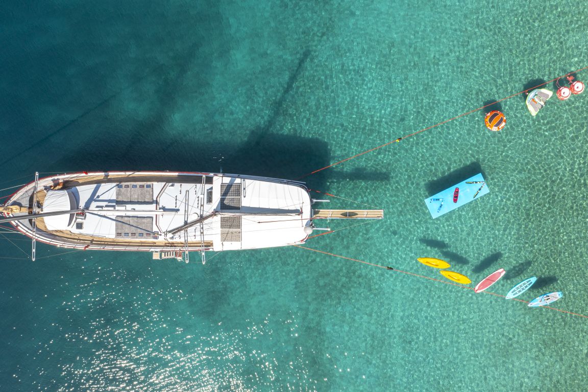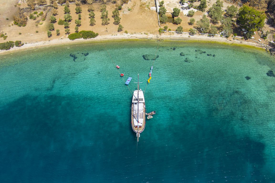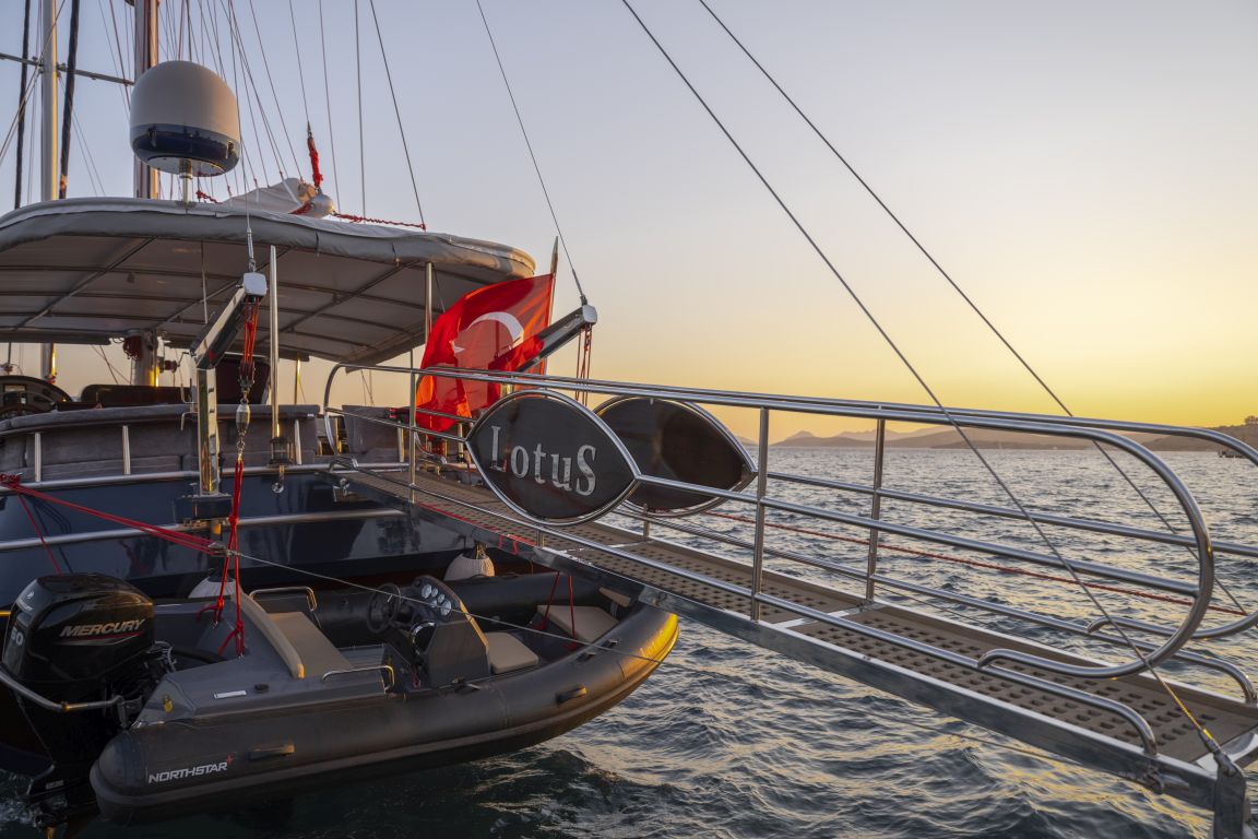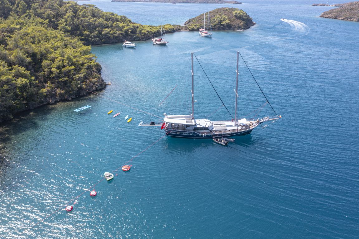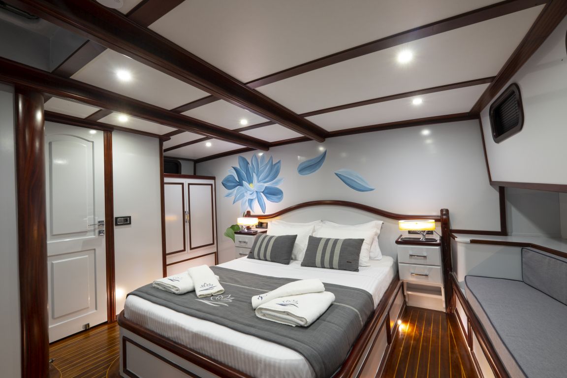 Die M/S Lotus wurde 1996 gebaut. Nach der Renovierung im Jahr 2021 präsentiert sie sich in ihrem heutigen, modernen Zustand. Das 26 Meter lange und 6 Meter breite Boot bietet unseren geschätzten Gästen mit einer 4-köpfigen Crew exklusive Blaue-Kreuzfahrten. Unsere Yacht verfügt über insgesamt 5 Kabinen, bestehend aus 2 Master-Kabinen und 3 Doppelkabinen, die alle stilvoll und komfortabel eingerichtet sind und jeweils über eine eigene Dusche, WC und Klimaanlage verfügen. Sie ist mit 2 x 450 PS starken MAN-Motoren und 2 x 24 kW Kohler-Generatoren ausgestattet. Separate Wohnbereiche für die Crew, eine voll ausgestattete Küche, Essbereiche im Innen- und Außenbereich, eine 24-Stunden-Klimaanlage, Entspannungsbereiche und eine amerikanische Bar stehen zur Verfügung. Ausreichend Sonnenliegen, Stühle und Service-Sets sind für alle Gäste vorhanden. Diese Yacht, die unseren Gästen auf Blauen Kreuzfahrten Komfort, Luxus und Ruhe bietet, erreicht eine Geschwindigkeit von bis zu 10 Seemeilen. Dank der voll ausgestatteten drahtlosen Telefonanlage mit GSM-Telefon und Navigationssystemen werden Sie sich an Bord der Lotus Yacht in den beliebtesten Blauen-Reisezielen wie Bodrum, Marmaris, Fethiye und Göcek sicher fühlen. Zusätzlich stehen Ihnen im Salon ein LCD-Fernseher, ein DVD-Player und eine Musikanlage zur Verfügung. Damit Sie auch während Ihres Urlaubs nicht vom Internet abgeschnitten sind, ist unsere Yacht mit WLAN ausgestattet, das innerhalb türkischer Hoheitsgewässer gültig ist. Wassersportarten wie Wakeboarden, Wasserski, Kanufahren und Hobie Mirage sind optional verfügbar. Für unsere Gäste, die die Blaue Reise in den unberührten Buchten der Türkei genießen möchten, bietet unsere Seematratze zusätzliche Unterhaltungsmöglichkeiten.
