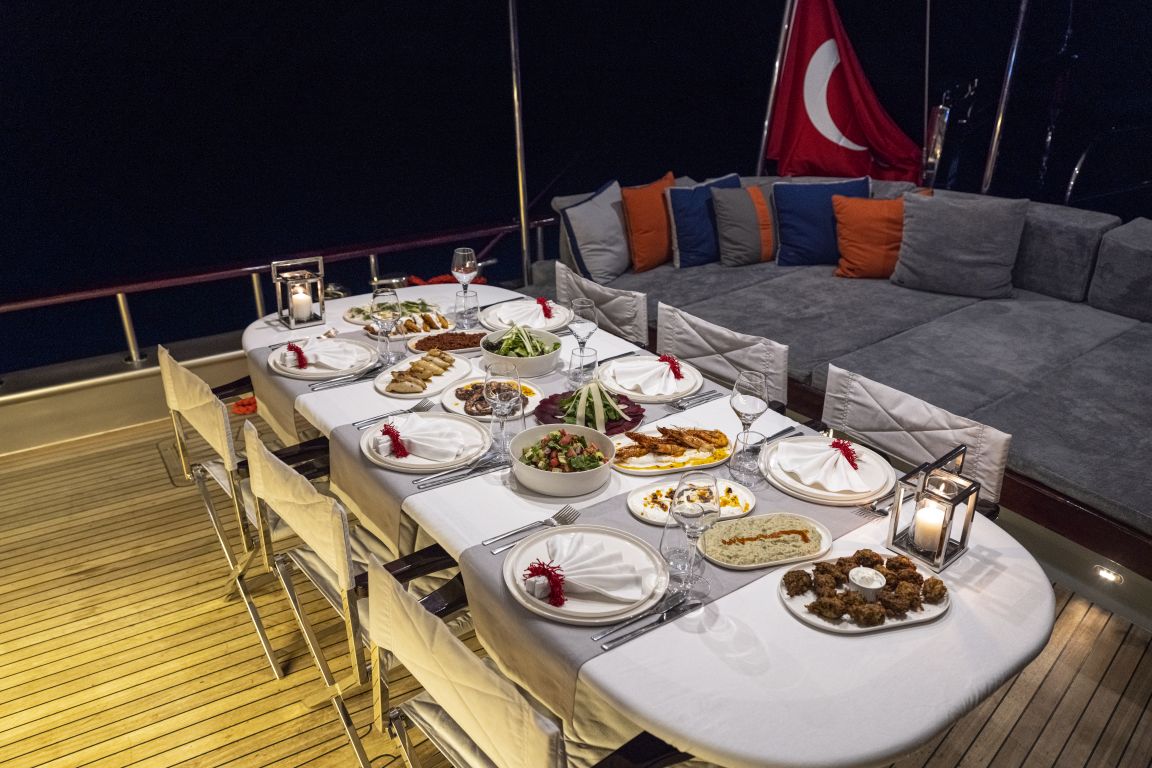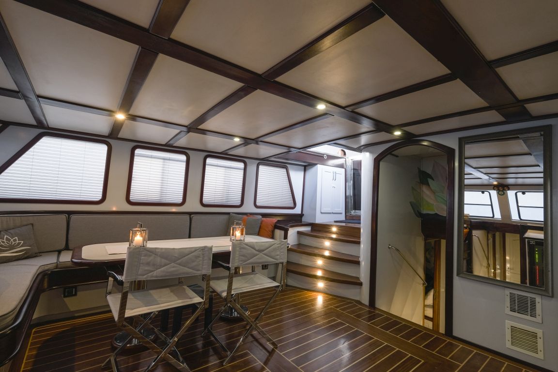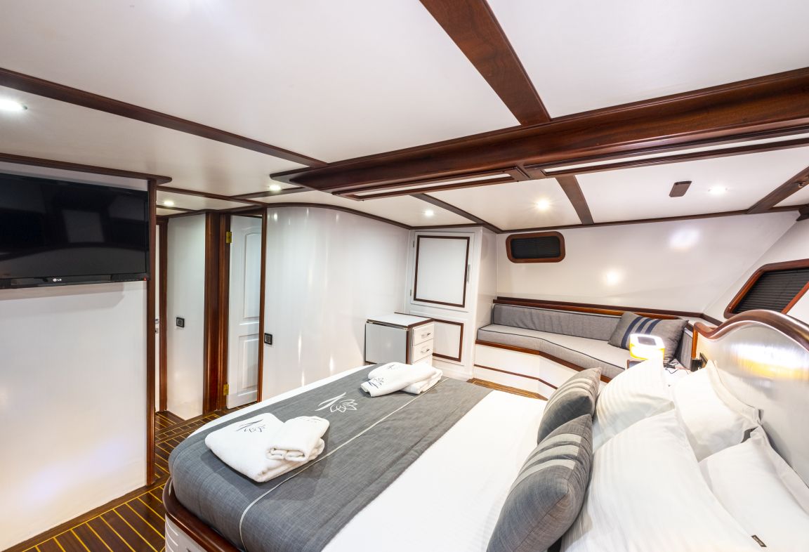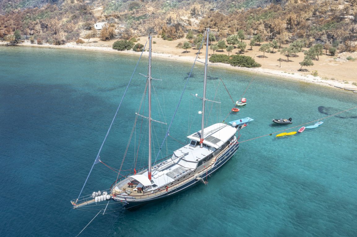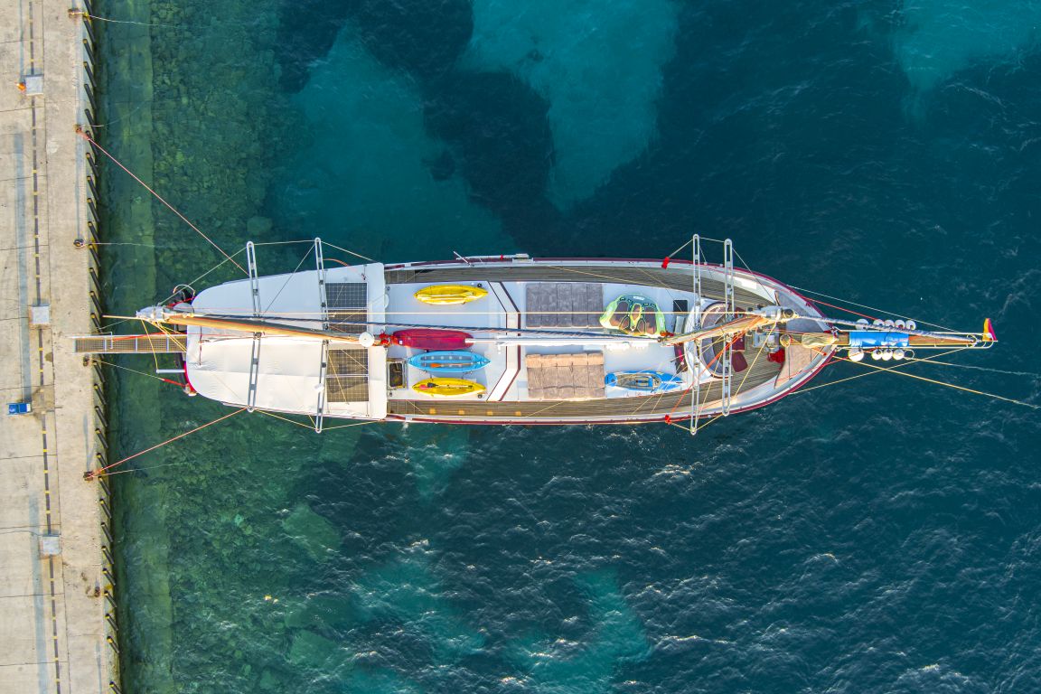 Die M/S Lotus wurde 1996 gebaut. Nach der Renovierung im Jahr 2021 präsentiert sie sich in ihrem heutigen, modernen Zustand. Das 26 Meter lange und 6 Meter breite Boot bietet unseren geschätzten Gästen mit einer 4-köpfigen Crew exklusive Blaue-Kreuzfahrten. Unsere Yacht verfügt über insgesamt 5 Kabinen, bestehend aus 2 Master-Kabinen und 3 Doppelkabinen, die alle stilvoll und komfortabel eingerichtet sind und jeweils über eine eigene Dusche, WC und Klimaanlage verfügen. Sie ist mit 2 x 450 PS starken MAN-Motoren und 2 x 24 kW Kohler-Generatoren ausgestattet. Separate Wohnbereiche für die Crew, eine voll ausgestattete Küche, Essbereiche im Innen- und Außenbereich, eine 24-Stunden-Klimaanlage, Entspannungsbereiche und eine amerikanische Bar stehen zur Verfügung. Ausreichend Sonnenliegen, Stühle und Service-Sets sind für alle Gäste vorhanden. Diese Yacht, die unseren Gästen auf Blauen Kreuzfahrten Komfort, Luxus und Ruhe bietet, erreicht eine Geschwindigkeit von bis zu 10 Seemeilen. Dank der voll ausgestatteten drahtlosen Telefonanlage mit GSM-Telefon und Navigationssystemen werden Sie sich an Bord der Lotus Yacht in den beliebtesten Blauen-Reisezielen wie Bodrum, Marmaris, Fethiye und Göcek sicher fühlen. Zusätzlich stehen Ihnen im Salon ein LCD-Fernseher, ein DVD-Player und eine Musikanlage zur Verfügung. Damit Sie auch während Ihres Urlaubs nicht vom Internet abgeschnitten sind, ist unsere Yacht mit WLAN ausgestattet, das innerhalb türkischer Hoheitsgewässer gültig ist. Wassersportarten wie Wakeboarden, Wasserski, Kanufahren und Hobie Mirage sind optional verfügbar. Für unsere Gäste, die die Blaue Reise in den unberührten Buchten der Türkei genießen möchten, bietet unsere Seematratze zusätzliche Unterhaltungsmöglichkeiten.