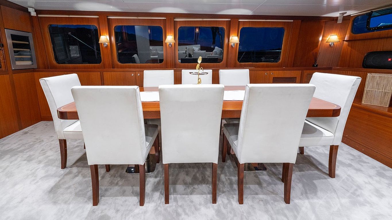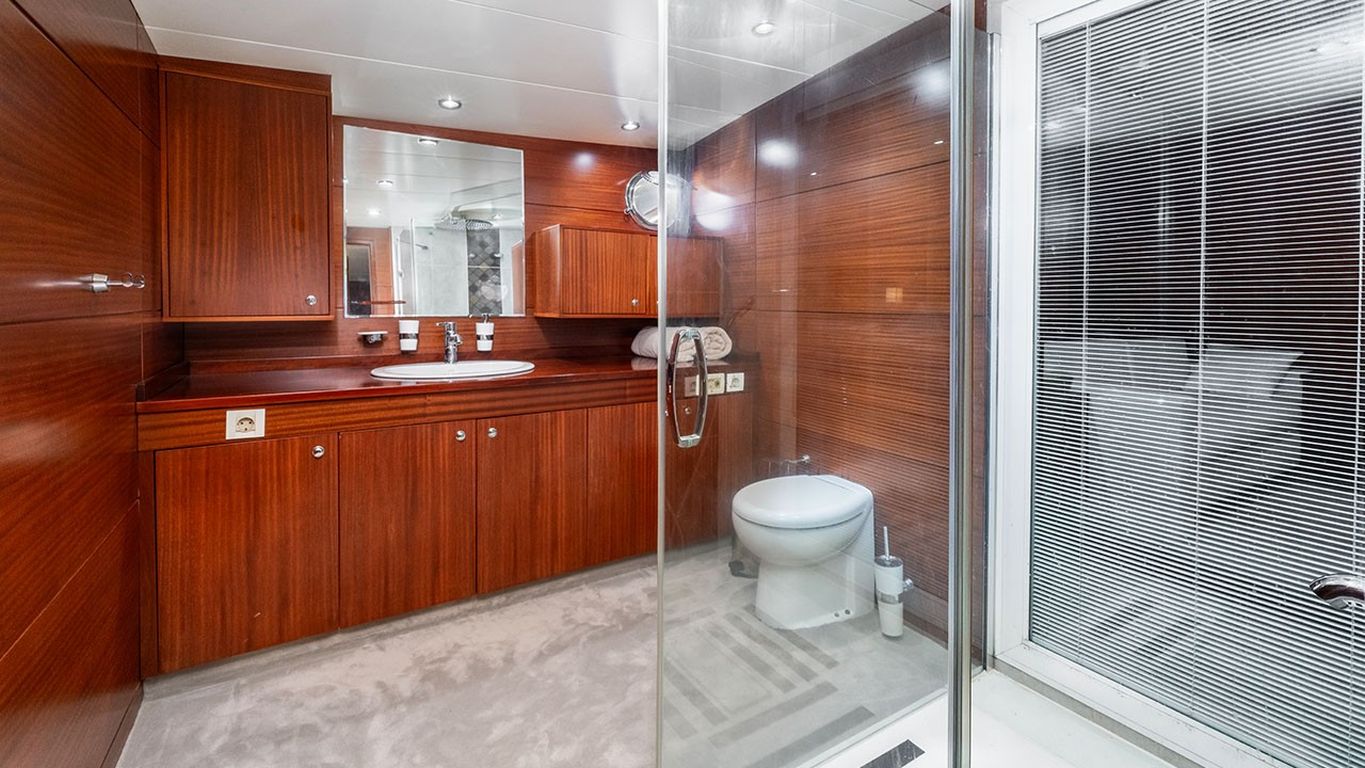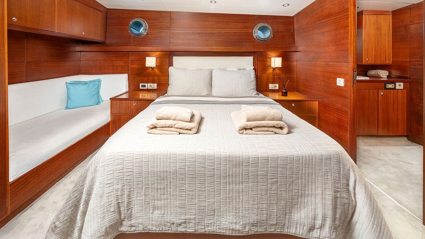 | Kapazität für bis zu 10 Gäste; 2 VIP, 1 Master, 2 Doppelkabinen, Duschkabine und Toiletten in allen Kabinen, separate Mannschaftskabinen. |