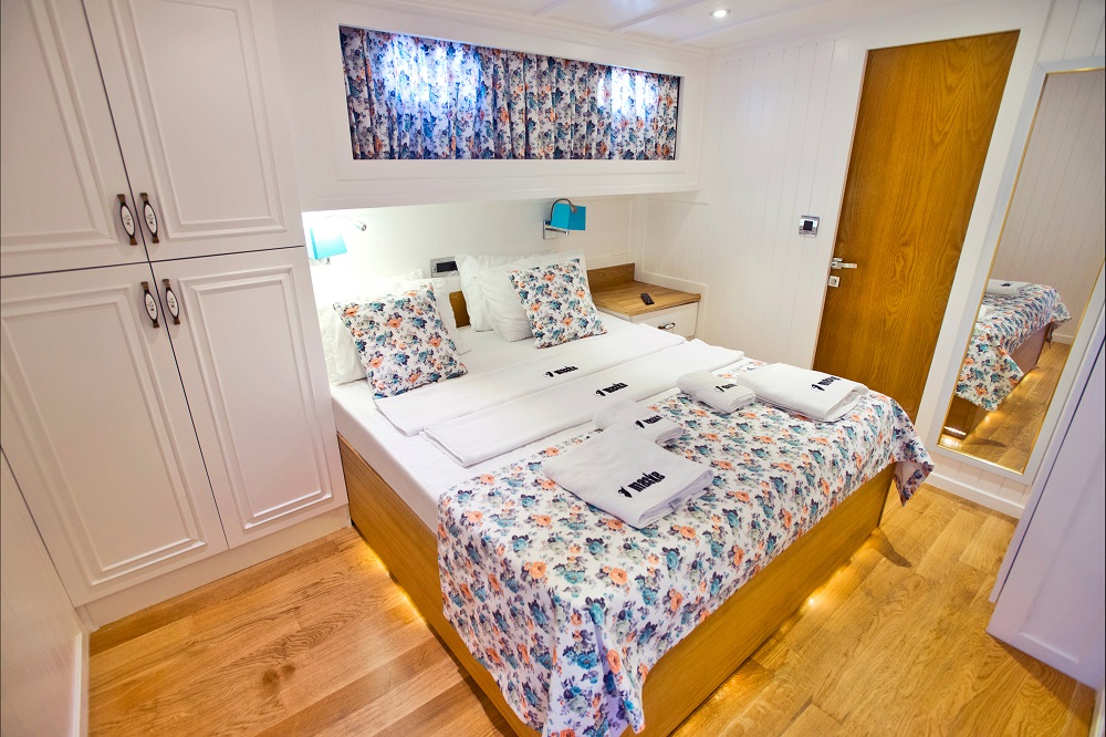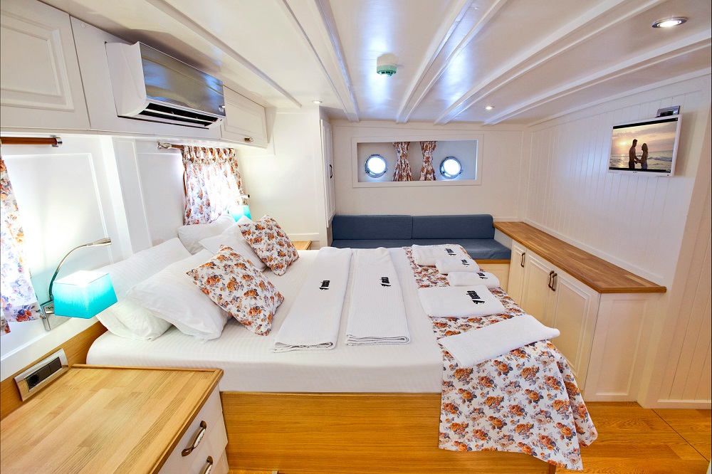 Unsere 24 m lange Gulet Maske 1 wurde 2014 gebaut. Ihre endgültige Form erhielt sie mit der Renovierung und Sanierung, die sie 2017 durchlief. Unser Boot verfügt über 5 Kabinen, 1 Master- und 4 Doppelkabinen, jede stilvoller und komfortabler, mit eigener Dusche, WC und Klimaanlage. 3 Es gibt separate Wohnbereiche, eine voll ausgestattete Küche, Essbereiche im Innen- und Außenbereich sowie Ruhebereiche für die Besatzung. Es gibt Sonnenkissen, Stühle und Serviersets in ausreichender Menge für alle Gäste. Dank seiner vollwertigen Radio-, GSM-Telefon- und Navigationsausrüstung ist die Gulet Maske 1; Bodrum, Göcek, Marmaris, Fethiye usw. Sie können sicher zu unseren Zielen der Blauen Kreuzfahrt segeln.
