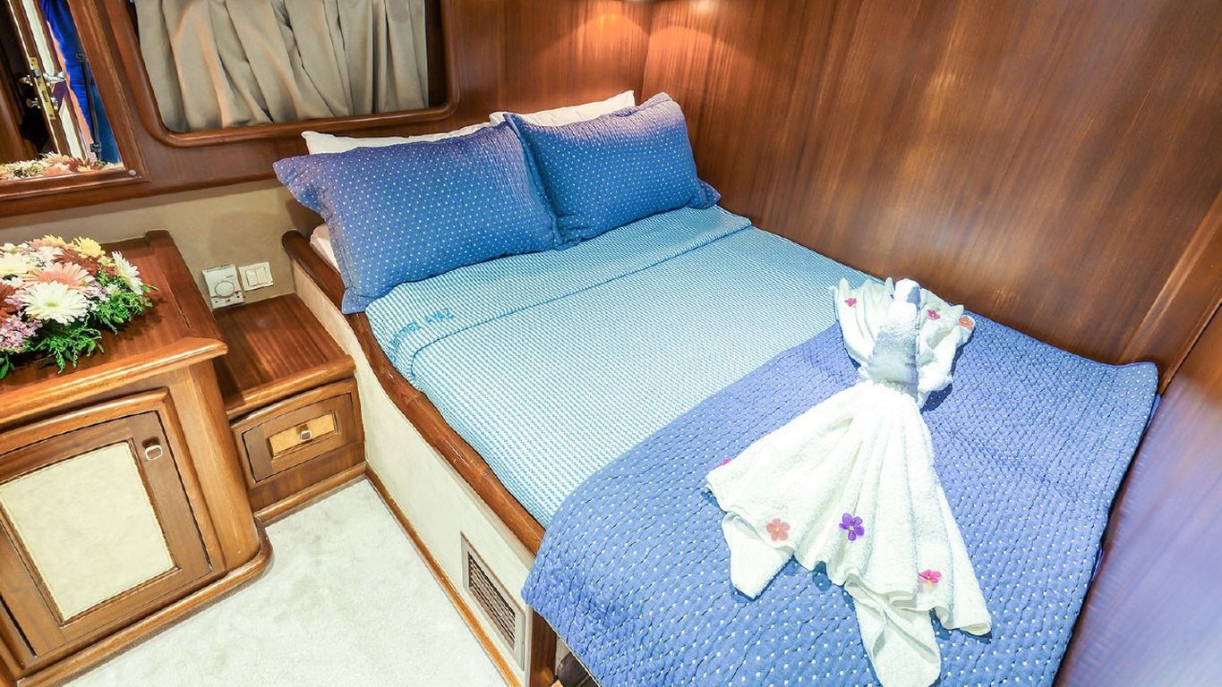 | Kapazität für bis zu 10 Gäste; 2 Masterkabinen, 3 Doppelkabinen, Duschkabine und Toiletten in allen Kabinen, separate Mannschaftskabinen. |