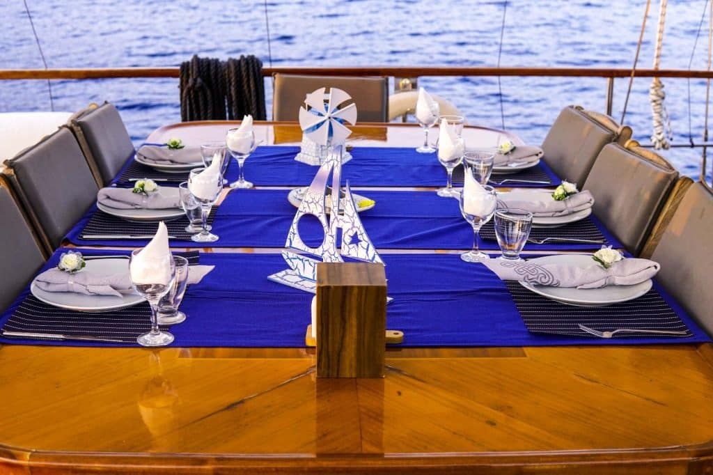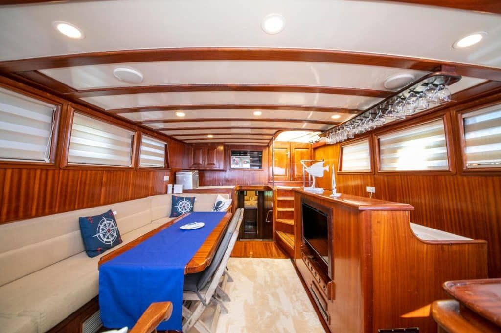 LCD-Fernseher, DVD-Player und Stereoanlage stehen unseren geschätzten Gästen der Blauen Reise in der Lounge unserer Gulet zur Verfügung. Wassersportarten wie Kanufahren, Tauchen und Windsurfen stehen unseren Gästen auf Wunsch optional zur Verfügung. Unser Boot bietet unseren Passagieren, die die Blaue Reise in den unberührten Buchten der Türkei genießen möchten, auch Unterhaltung und die Möglichkeit, sich auf dem Boot zu entspannen. Gulet Santa Maria ist bereit, unsere geschätzten Gäste willkommen zu heißen, die erwägen, ein Gulet für eine Woche in den Regionen Bodrum, Göcek, Fethiye, Marmaris oder Gökova zu mieten.