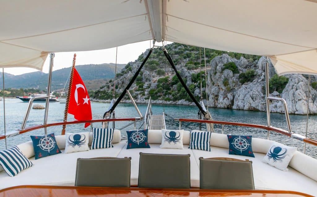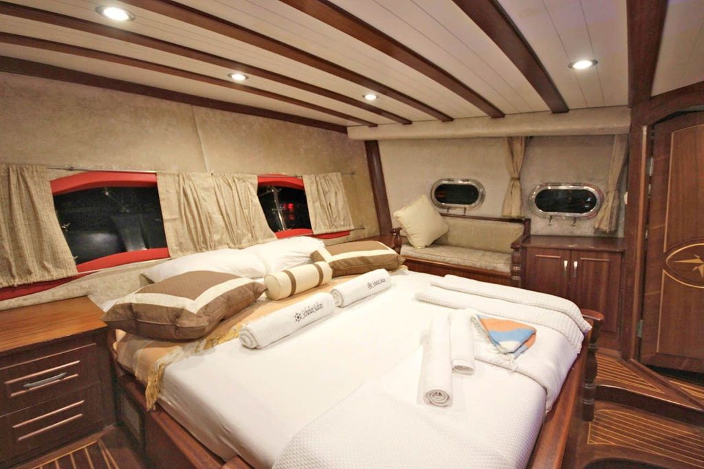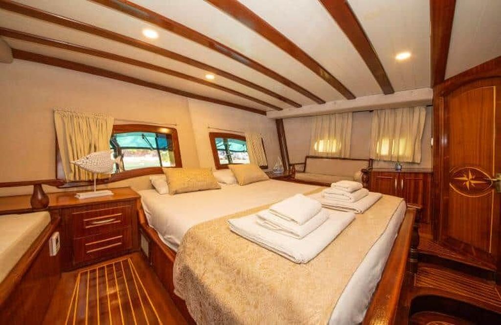 Unsere 23,90 m lange Gulet Santa Maria wurde 2008 gebaut. Ihre endgültige Form erhielt sie mit der Renovierung und Sanierung, die sie 2019 durchlief. Unser Boot verfügt über 5 Kabinen, 2 Master- und 3 Doppelkabinen, jede stilvoller und komfortabler als die andere, mit eigener Dusche, WC und Klimaanlage. 3 Es gibt separate Wohnbereiche, eine voll ausgestattete Küche, Essbereiche im Innen- und Außenbereich sowie Ruhebereiche für die Crew. Es gibt ausreichend Sonnenkissen, Stühle und Serviersets für alle Gäste. Die Gulet Santa Maria verfügt dank ihrer vollwertigen Radio-, GSM-Telefon- und Navigationsausrüstung; Bodrum, Göcek, Marmaris, Fethiye usw. Sie können sicher zu unseren Zielen der Blauen Kreuzfahrt segeln.