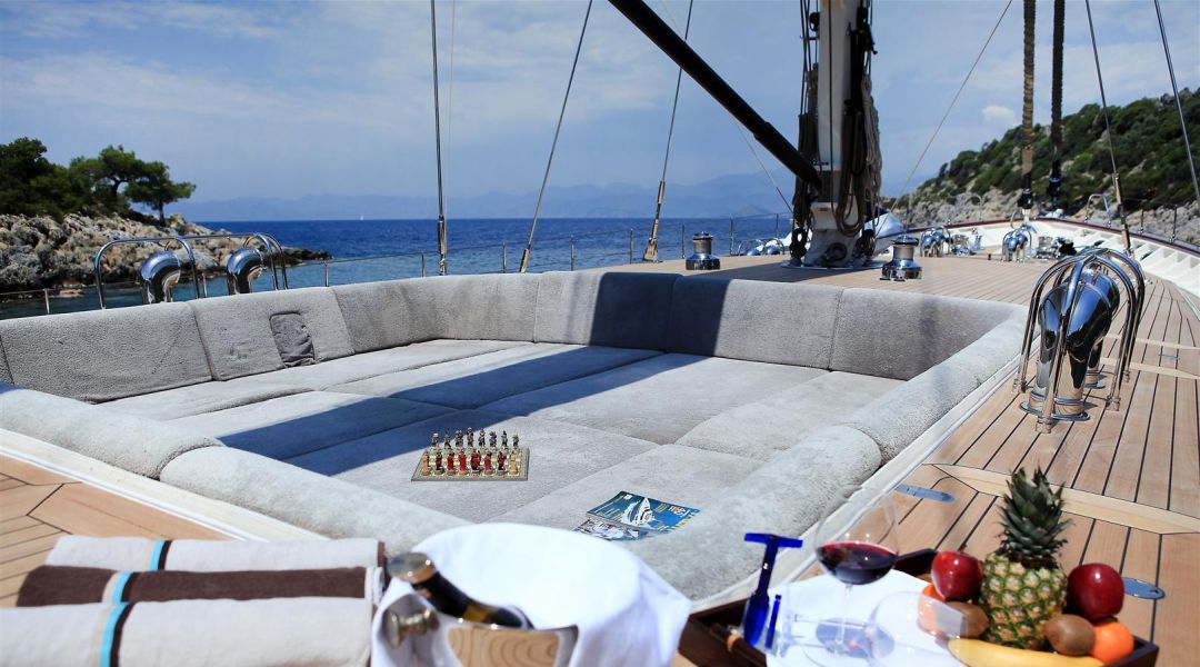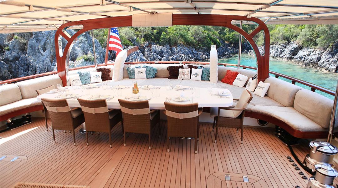 Unsere 40 m lange Gulet Zelda wurde 2010 gebaut. Ihre endgültige Form erhielt sie mit der Renovierung und Sanierung, die sie 2020 durchlief. Unser Boot verfügt über 5 Doppelkabinen, jede stilvoller und komfortabler als die andere, mit eigener Dusche, WC und Klimaanlage. 4 Es gibt separate Wohnbereiche, eine voll ausgestattete Küche, Essbereiche im Innen- und Außenbereich sowie Ruhebereiche für die Besatzung. Es gibt ausreichend Sonnenkissen, Stühle und Serviersets für alle Gäste. Gulet Zelda verfügt dank seiner vollwertigen Radio-, GSM-Telefon-Navigationsausrüstung; Bodrum, Göcek, Marmaris, Fethiye usw. Sie können sicher zu unseren Zielen der Blauen Kreuzfahrt segeln.