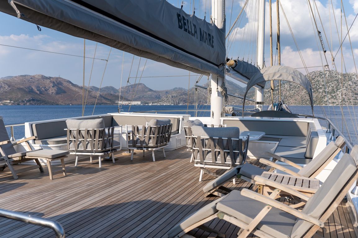 Die Gulet Bella Mare wurde 2008 gebaut und 2018 nach den neuesten Technologien renoviert. Sie bietet Ihnen eine Blaue Reise mit einer Länge von 38 Metern. Es gibt 6 Doppelkabinen, jede mit eigener Dusche, WC und Klimaanlage. Sie können mit unserem Boot Bella Mare eine angenehme und unterhaltsame Blaue Kreuzfahrt auf allen Routen von Bodrum, Göcek, Marmaris und Fethiye planen. Unser Boot Bella Mare verfügt über separate Essbereiche auf dem Deck und in der Lounge, eine voll ausgestattete Küche, eine amerikanische Bar und separate Wohnbereiche für die Crew. Auf dem Deck gibt es Sonnenbereiche, auf denen 12 Personen bequem sonnenbaden können.