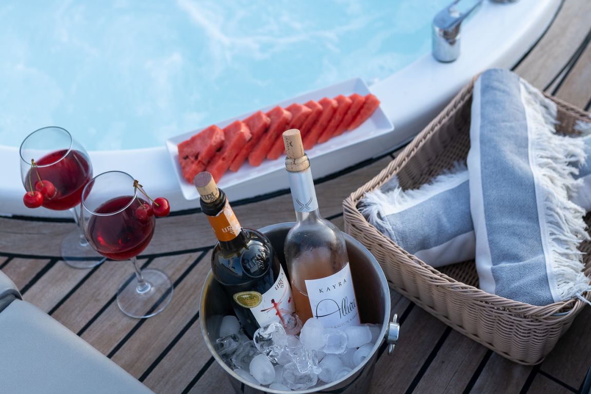 Es gibt Kanus, Schnorchel, Masken, Flossen und einfache Angelausrüstung, um die Zeit auf See angenehmer zu gestalten, und um die Zeit auf dem Deck unterhaltsamer zu gestalten, gibt es ein Rommé-Set, Backgammon, Spielkarten, einen DVD-Player, ein Musiksystem und eine Klimaanlage. Unser erfahrenes Personal auf dem Boot steht Ihnen bei der Zubereitung von Speisen, dem Service, der täglichen Reinigung und allen Angelegenheiten, die Sie während der Blauen Reise benötigen, zur Verfügung. Der Kapitän und die Crew, die über Segelerfahrung verfügen, werden segeln, wenn das Wetter es zulässt, und Sie können das Vergnügen einer Blauen Segelkreuzfahrt in der Ägäis erleben. Um eine preiswerte und angenehme Blaue Kreuzfahrt in türkischen Hoheitsgewässern zu erleben, laden wir Sie zu einer Blauen Reise mit unserer Bella Mare-Gulet ein.