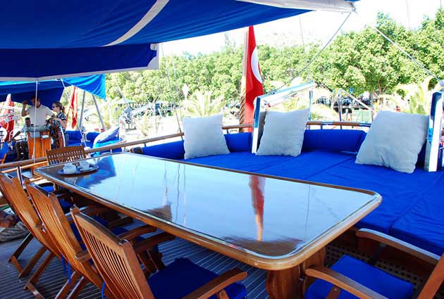Es gibt Kanus, Schnorchel, Masken, Flossen und einfache Angelausrüstung, um die Zeit auf See angenehmer zu gestalten, und um die Zeit auf dem Deck unterhaltsamer zu gestalten, gibt es ein Rommé-Set, Backgammon, Spielkarten, einen DVD-Player, ein Musiksystem und eine Klimaanlage. Unser erfahrenes Personal auf dem Boot steht Ihnen bei der Zubereitung von Speisen, dem Service, der täglichen Reinigung und allen Angelegenheiten, die Sie während der Blauen Reise benötigen, zur Verfügung. Der Kapitän und die Besatzung, die über Segelerfahrung verfügen, werden segeln, wenn das Wetter es zulässt, und Sie können das Vergnügen einer Segel-Blauen-Kreuzfahrt in der Ägäis erleben. Um eine kostengünstige und angenehme Blaue Tour in türkischen Hoheitsgewässern zu erleben, laden wir Sie zu einer Blauen Reise mit unserem Gulet Enderim ein.