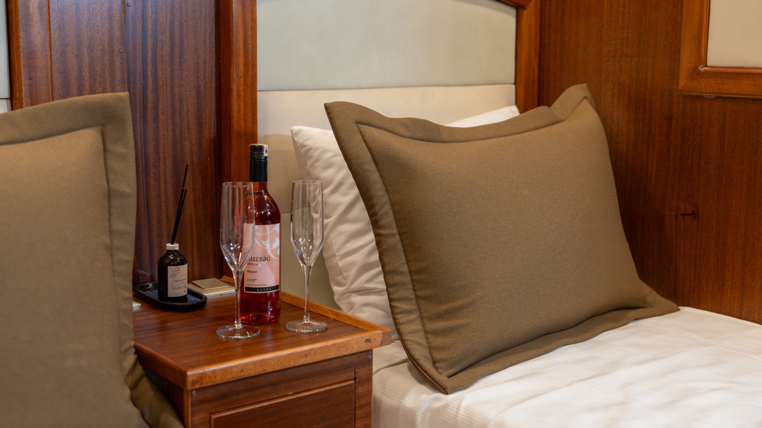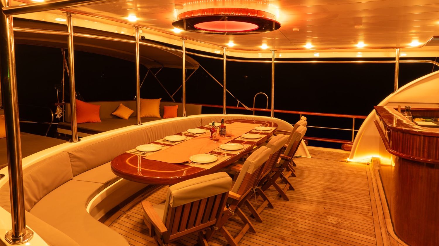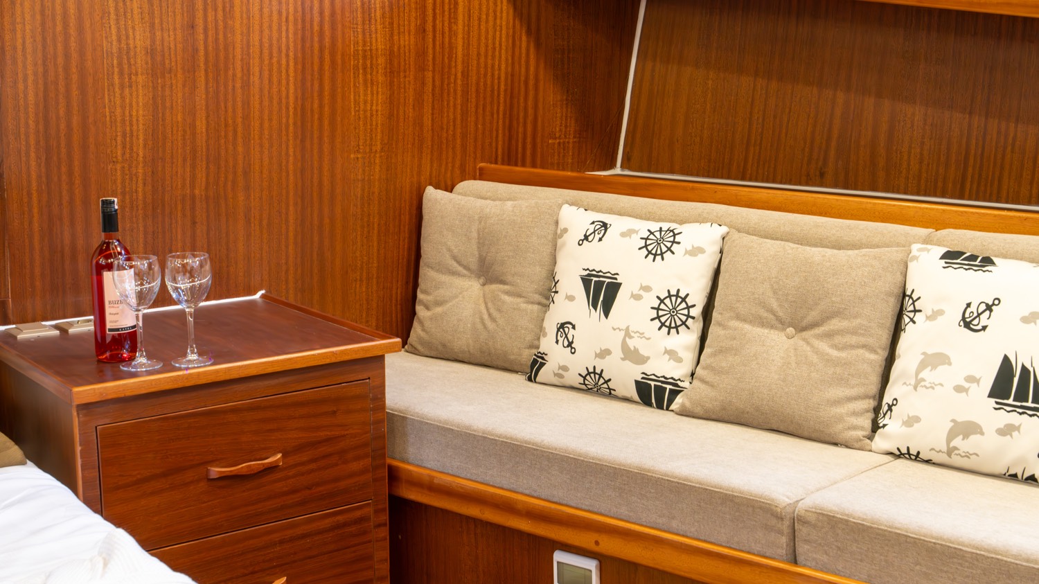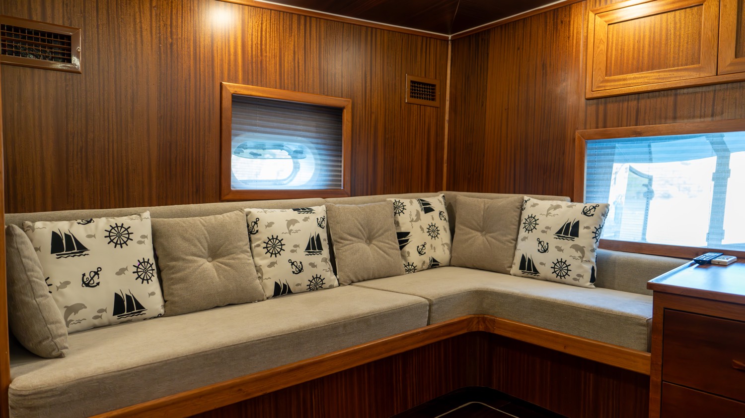 Bis zu 12 Gäste; 2 Haupt-, 3 Doppel-, 1 Dreibettkabinen, Klimaanlage, Kleiderschrank, Duschkabine und Toiletten für zu Hause in allen Kabinen, separate Crew-Kabinen.. |