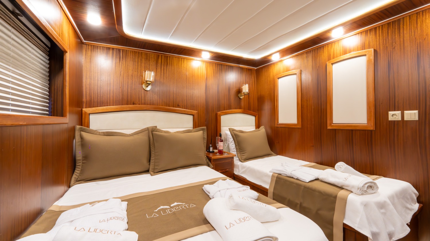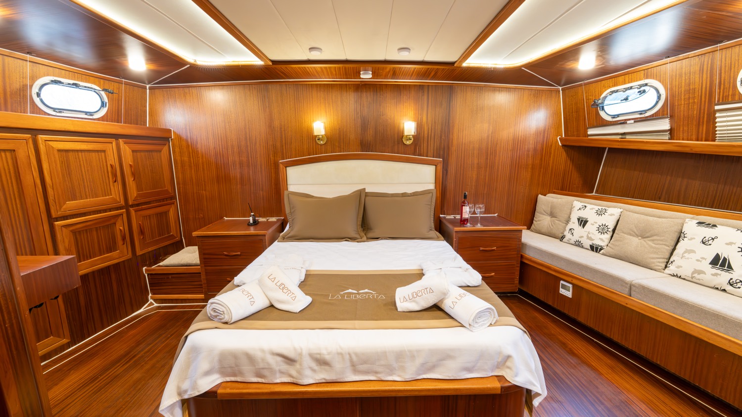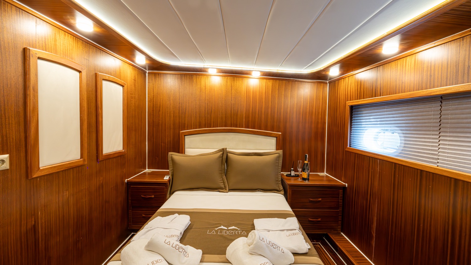 | Die Gulet La Liberta ist eine 24 Meter lange Yacht, die 2023 gebaut wurde. Sie verfügt über sechs Kabinen – zwei Master-, drei Doppel- und eine Dreibettkabine – und bietet Platz für bis zu zwölf Gäste. Alle Kabinen verfügen über eigene Badezimmer, Klimaanlage und moderne Ausstattung. Das Deck bietet großzügige Lounge- und Essbereiche, gepolsterte Sitze und Sonnenzonen. Der Salon ist modern gestaltet und mit Ess- und Unterhaltungsmöglichkeiten ausgestattet. Zur Wassersportausstattung gehören Kanus, Paddleboards, Seabobs und Jobe-Revolve-Schleppgeräte sowie Schnorchel- und Angelausrüstung. Angetrieben von zwei 350 PS Motoren und 31,5 + 19,5 kVA Generatoren, erreicht sie 8 Knoten. Klimaanlage: 12 Stunden täglich. Die La Liberta ist die perfekte Wahl für Gäste, die eine moderne Gulet mit erstklassiger Ausstattung suchen |