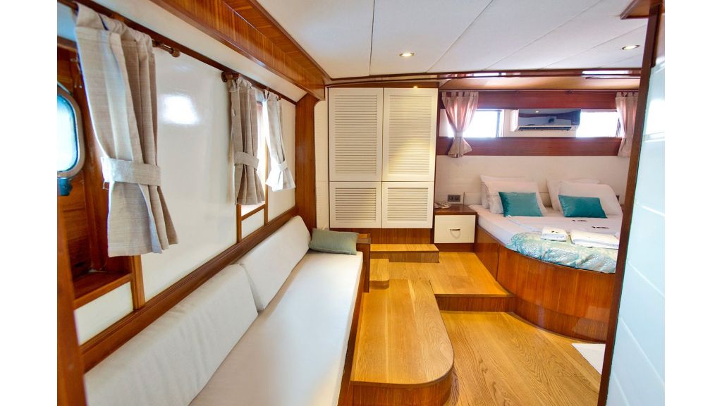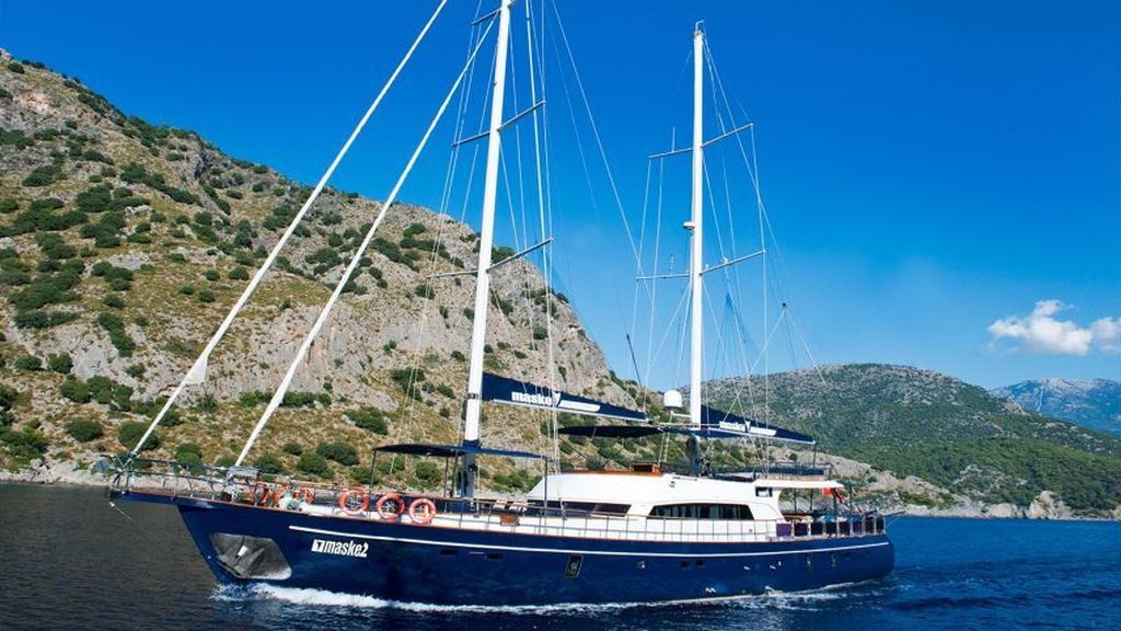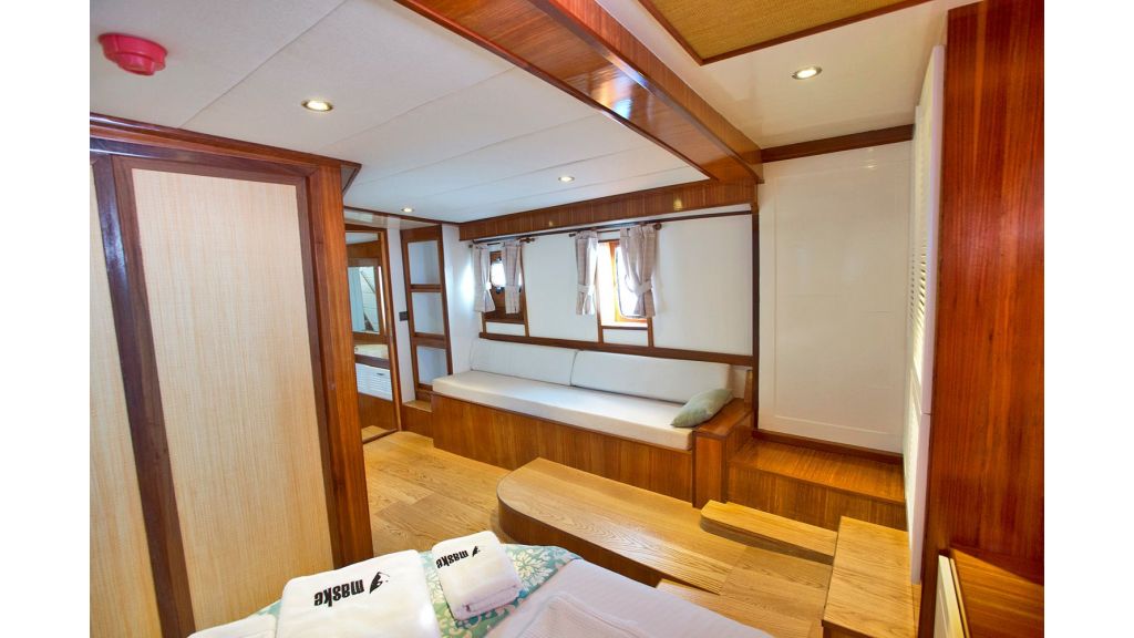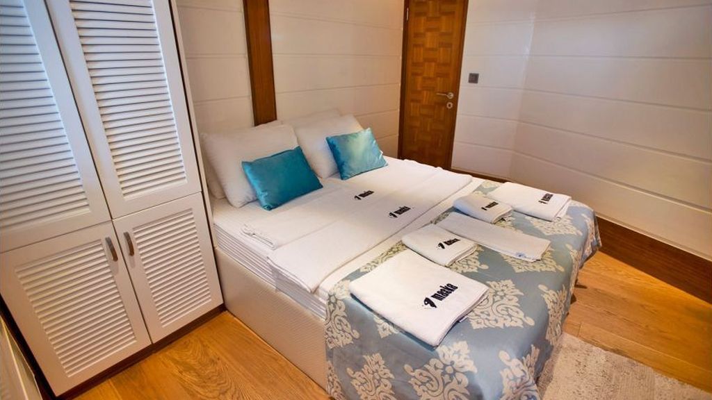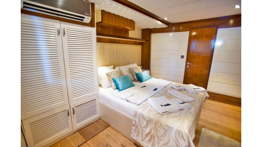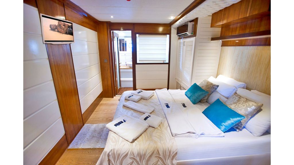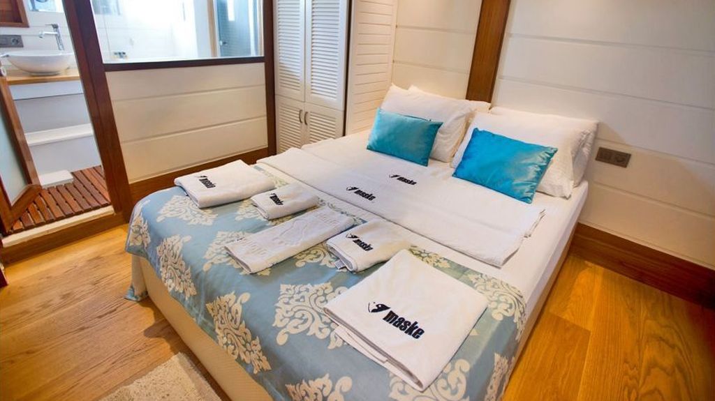 | Die Gulet Maske 2 ist eine 30 Meter lange Luxusyacht, gebaut 2013. Sie verfügt über sechs Kabinen – zwei Master-, drei Doppel- und eine Zweibettkabine – und bietet Platz für bis zu zwölf Gäste. Jede Kabine wurde sorgfältig gestaltet und verfügt über ein eigenes Bad. Das Deck bietet große Ess- und Loungebereiche, gepolsterte Sitze und weitläufige Sonnenflächen. Der Salon ist elegant eingerichtet und umfasst Ess- sowie Küchenbereiche. Zur Wassersportausstattung gehören ein 100 PS Beiboot, ein Stand-up-Paddleboard, Wasserski, Ringo, Kanu, Schnorchel- und Angelausrüstung. Angetrieben wird sie von zwei 360 PS Iveco-Motoren und zwei 27 kVA Generatoren, mit einer Reisegeschwindigkeit von 11 Knoten. Klimaanlage: 18 Stunden täglich. Die Maske 2 ist die ideale Wahl für Gäste, die Luxus, Komfort und Aktivität auf ihrer Blauen Reise kombinieren möchten. |