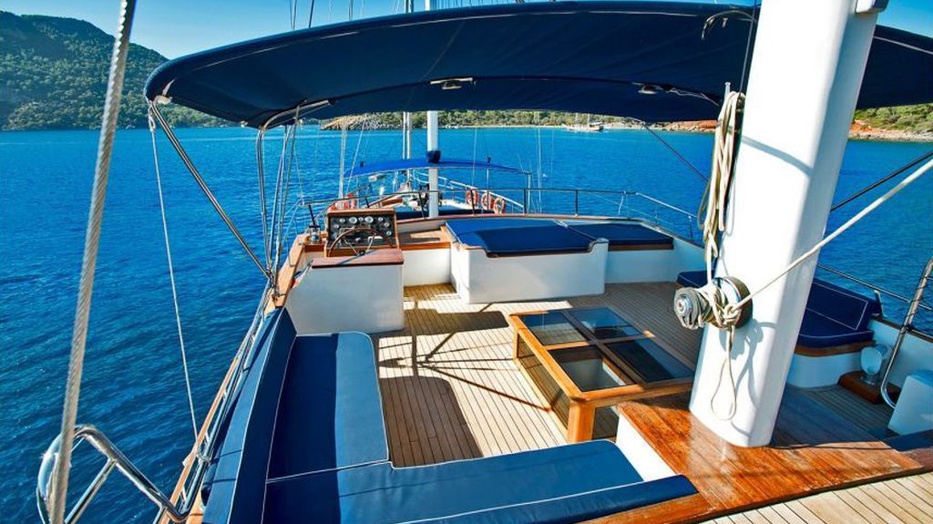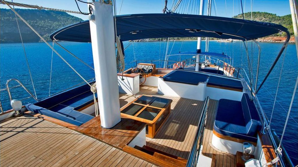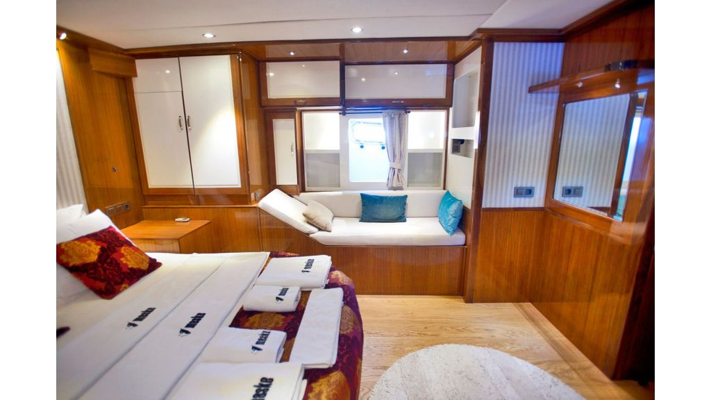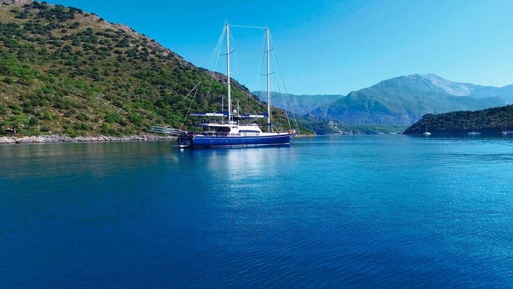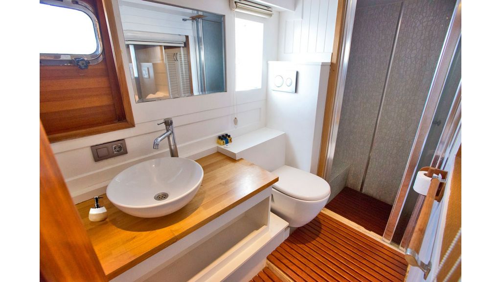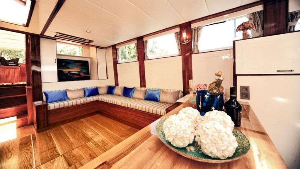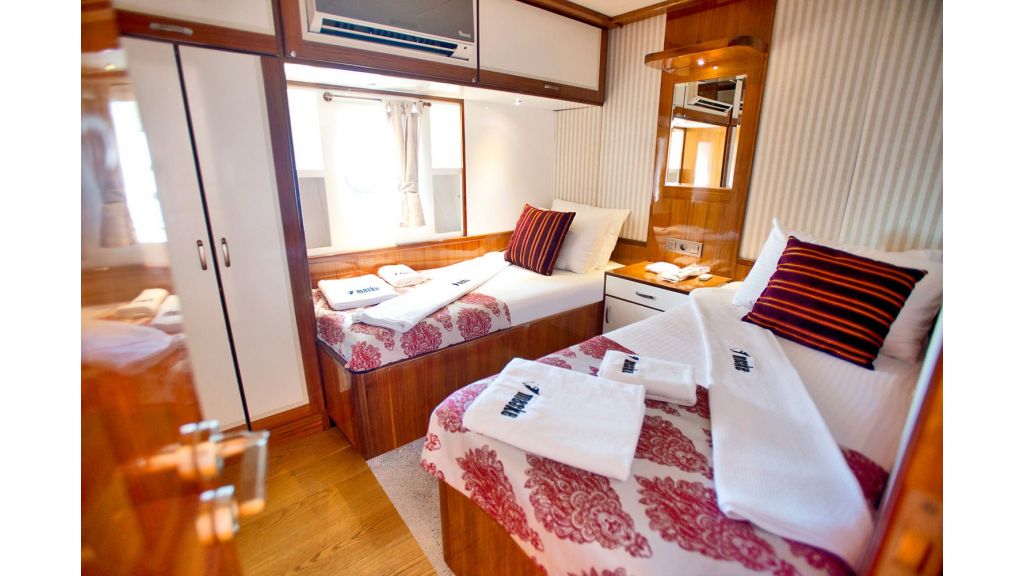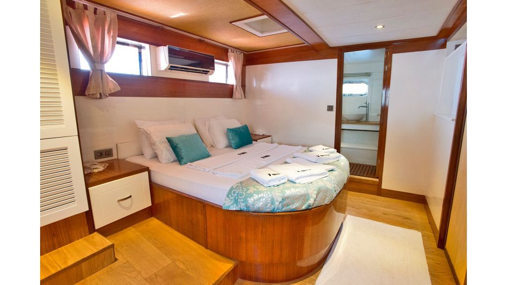 | Die Gulet Maske 2 ist eine 30 Meter lange Luxusyacht, gebaut 2013. Sie verfügt über sechs Kabinen – zwei Master-, drei Doppel- und eine Zweibettkabine – und bietet Platz für bis zu zwölf Gäste. Jede Kabine wurde sorgfältig gestaltet und verfügt über ein eigenes Bad. Das Deck bietet große Ess- und Loungebereiche, gepolsterte Sitze und weitläufige Sonnenflächen. Der Salon ist elegant eingerichtet und umfasst Ess- sowie Küchenbereiche. Zur Wassersportausstattung gehören ein 100 PS Beiboot, ein Stand-up-Paddleboard, Wasserski, Ringo, Kanu, Schnorchel- und Angelausrüstung. Angetrieben wird sie von zwei 360 PS Iveco-Motoren und zwei 27 kVA Generatoren, mit einer Reisegeschwindigkeit von 11 Knoten. Klimaanlage: 18 Stunden täglich. Die Maske 2 ist die ideale Wahl für Gäste, die Luxus, Komfort und Aktivität auf ihrer Blauen Reise kombinieren möchten. |