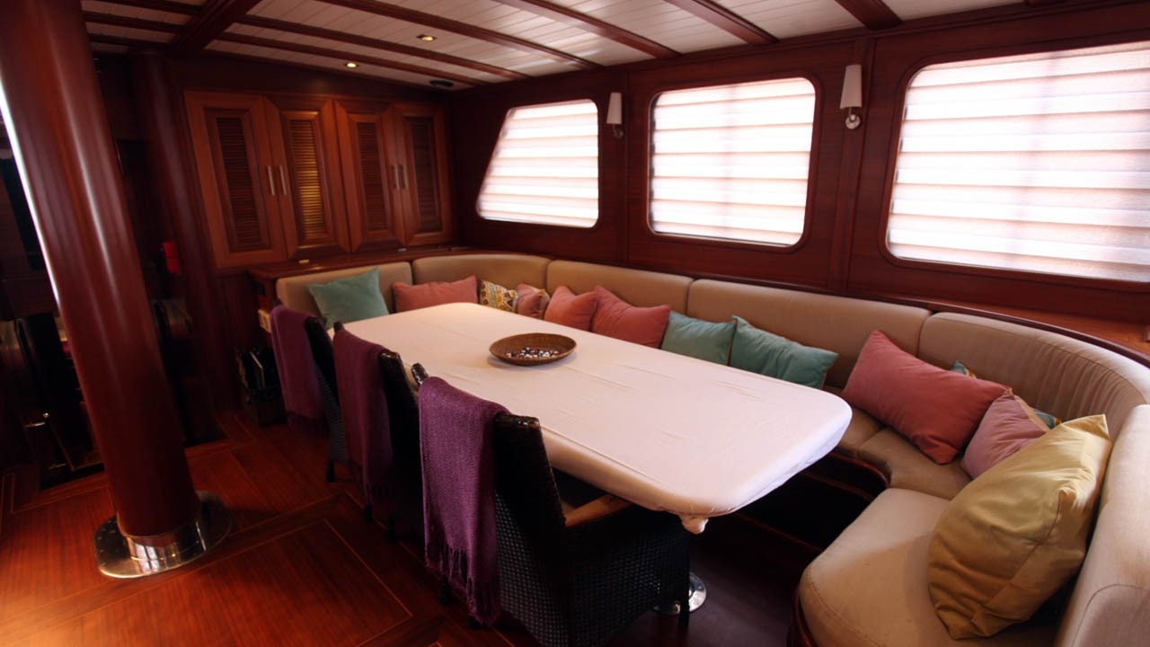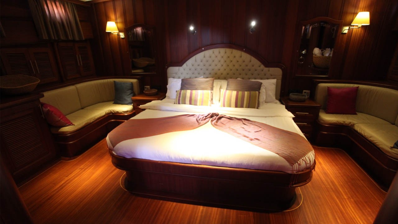 6 Kabinen, bestehend aus: 2 Masterkabinen mit Queensize-Doppelbett, 2 Doppelkabinen und 2 Kabinen mit je zwei Einzelbetten. Maximal 12 Gäste. Alle Kabinen verfügen über ein eigenes Bad mit Massagedusche, individuell regulierbare Klimaanlage mit Fernbedienung und Toiletten mit Push-Flush-Spülung. Separate Crew-Kabinen. |