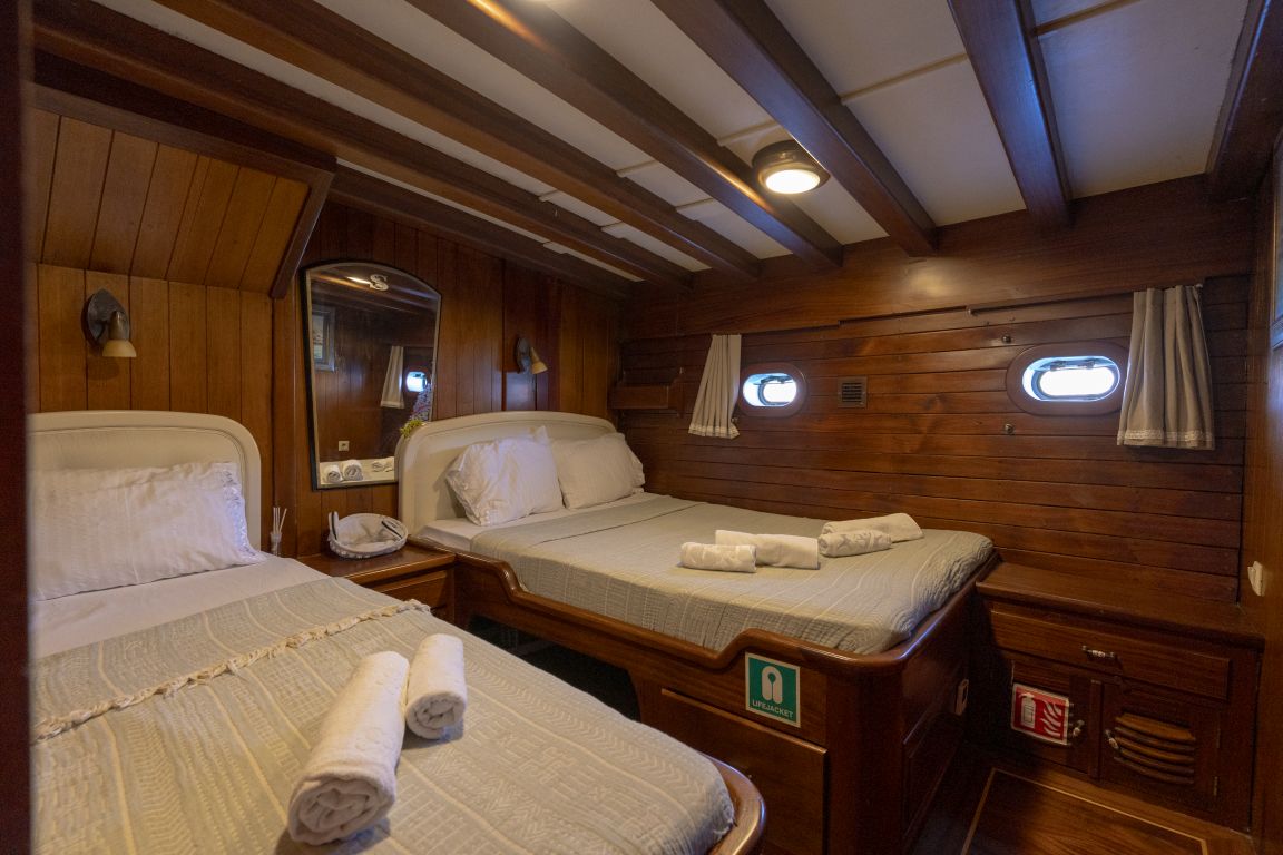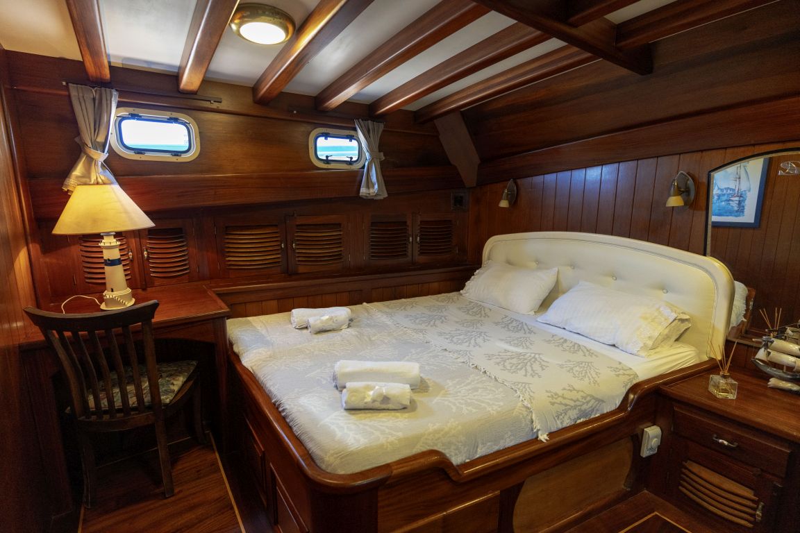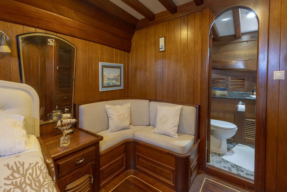 | Die Gulet Serenad ist eine geräumige, 29 Meter lange Yacht, gebaut 2003 und 2013 renoviert. Sie verfügt über sechs Kabinen – eine Master-, zwei Doppel-, eine Dreibett- und zwei Zweibettkabinen – mit Platz für bis zu zwölf Gäste. Jede Kabine ist mit eigenem Bad ausgestattet. Das Deck bietet großzügige Essbereiche, gepolsterte Sitzflächen und weitläufige Sonnenzonen. Im Salon befinden sich ein Essbereich und eine gut ausgestattete Kombüse. Für Wassersport bietet die Serenad ein 70 PS Beiboot, Stand-up-Paddleboards, Kanus, Schnorchel- und Angelausrüstung. Angetrieben von einem 450 PS Iveco-Motor und 22 + 22,5 kVA Generatoren, erreicht sie 10 Knoten. Klimaanlage: 8 Stunden täglich. Die Serenad ist ideal für Familien und Gruppen, die eine komfortable und abenteuerliche Reise entlang der türkischen Küste unternehmen möchten. |