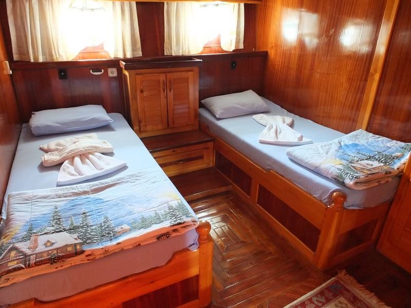Unser 8-Kabinen-Gulet hat 6 Doppel- und 2 Zweibettkabinen mit Klimaanlage, Toilette und Dusche in jeder Kabine und bietet problemlos Platz für insgesamt 16 Gäste. Das große und komfortable Wohnzimmer ist mit Geräten wie Fernseher, Satellitenfernsehen und CD-Player ausgestattet, um Ihre Zeit außerhalb des Meeres noch angenehmer zu gestalten. Während Sie die in unserer voll ausgestatteten Küche zubereiteten Mahlzeiten genießen, können Sie auch jeden Blauton entdecken.