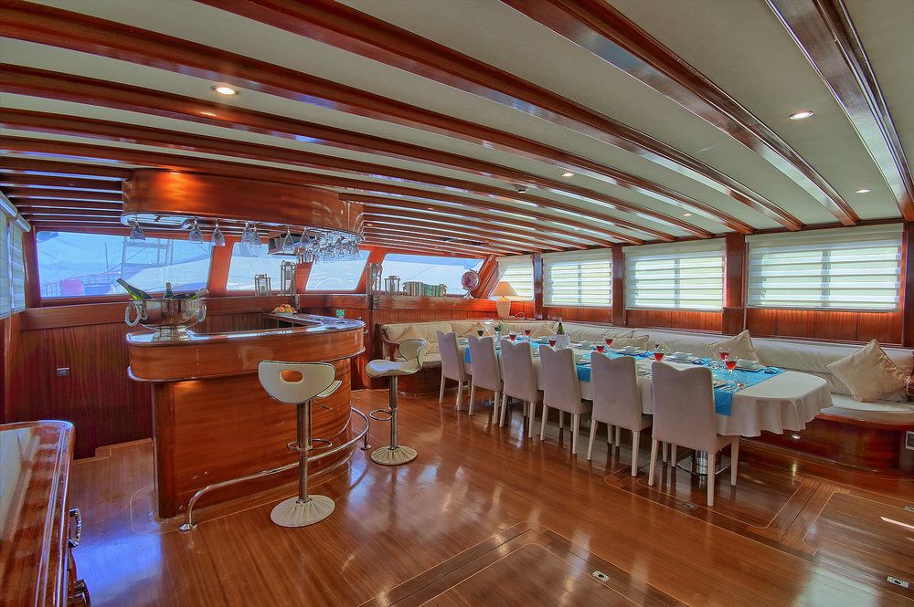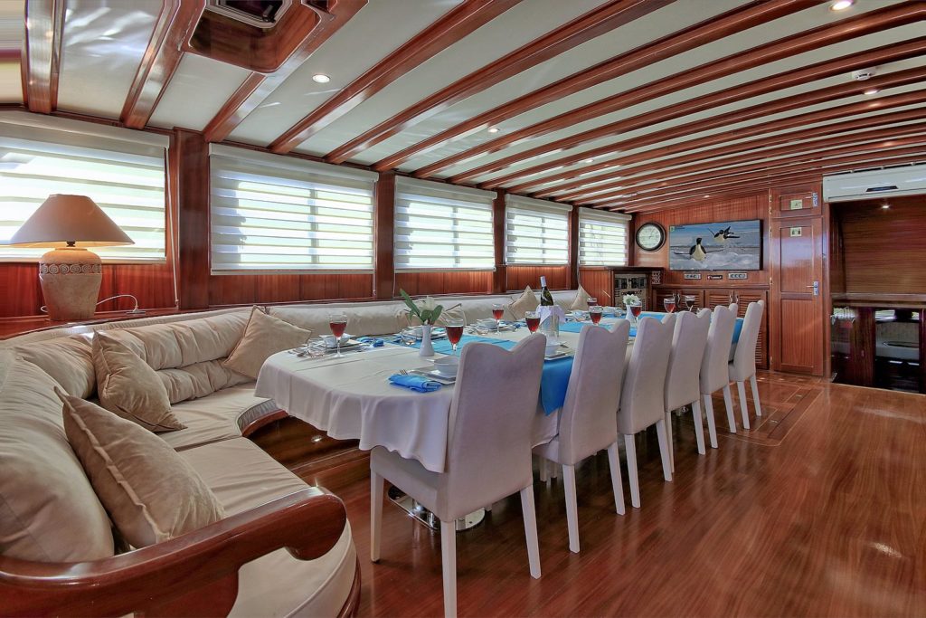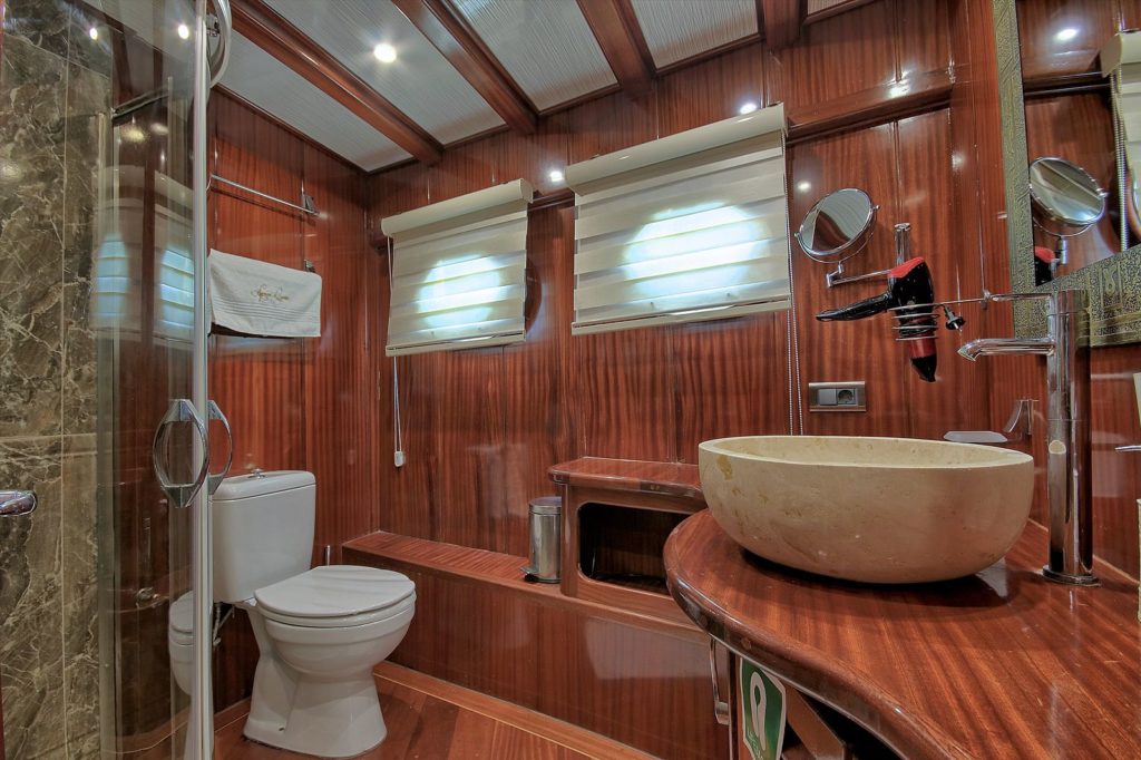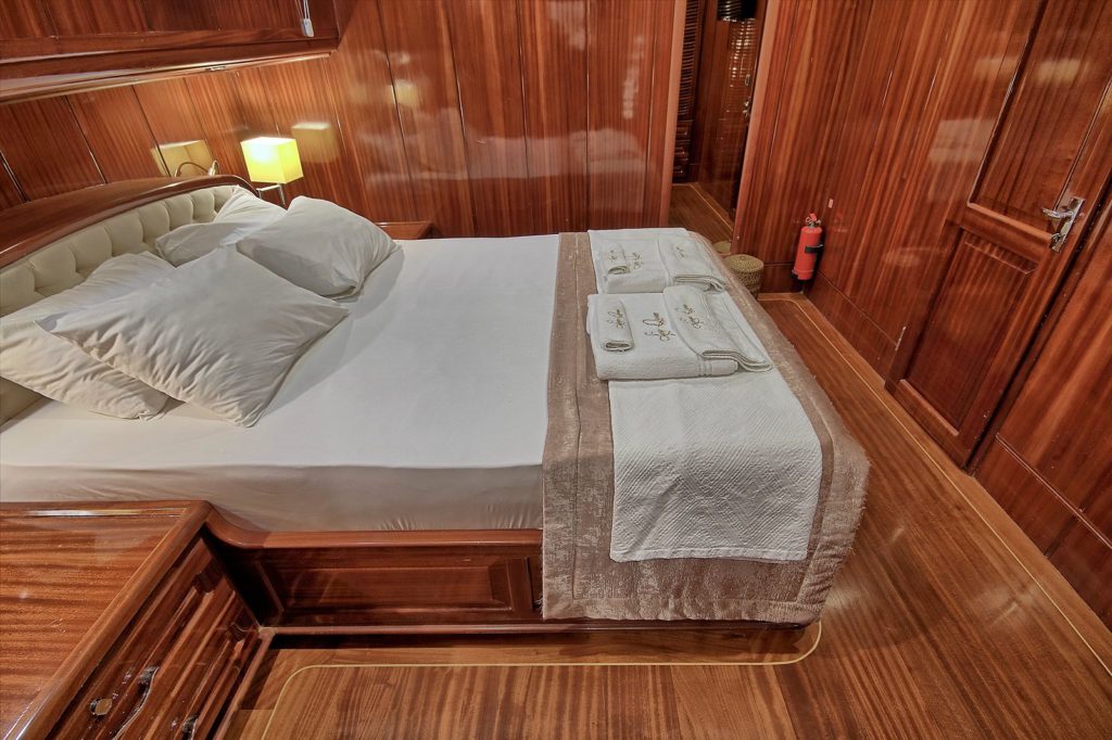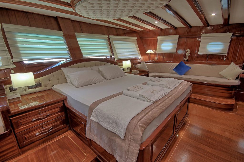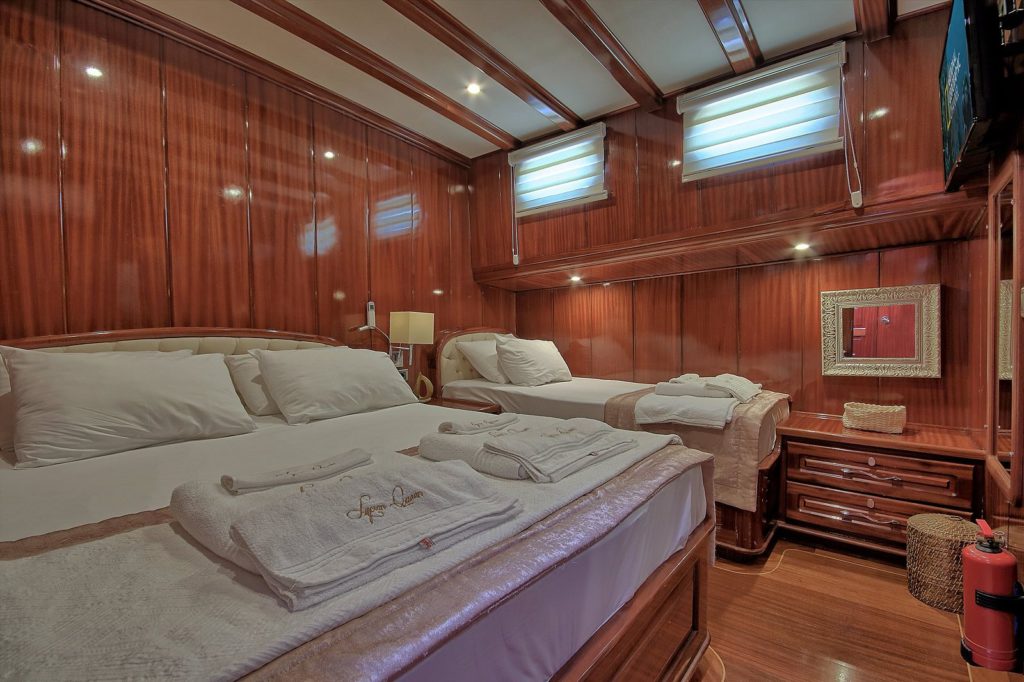 Unser Gulet mit 8 Kabinen hat 1 VIP-, 1 Master-, 4 Doppel- und 2 Dreibettkabinen, mit Klimaanlage, Toilette und Dusche in jeder Kabine, und kann problemlos insgesamt 16 Gäste beherbergen. Das große und komfortable Wohnzimmer ist mit Geräten wie Fernseher, Satellitenfernsehen und CD-Player ausgestattet, um Ihre Zeit außerhalb des Meeres noch angenehmer zu gestalten. Während Sie die in unserer voll ausgestatteten Küche zubereiteten Mahlzeiten genießen, können Sie auch jeden Blauton entdecken.