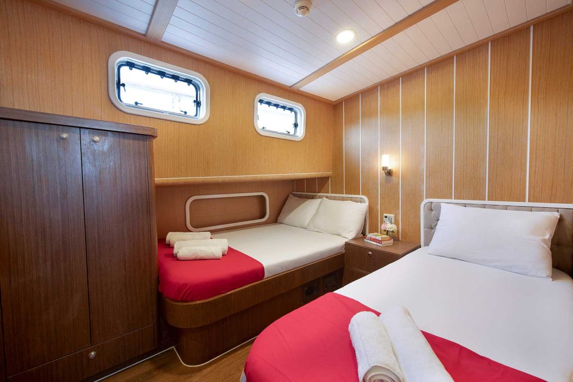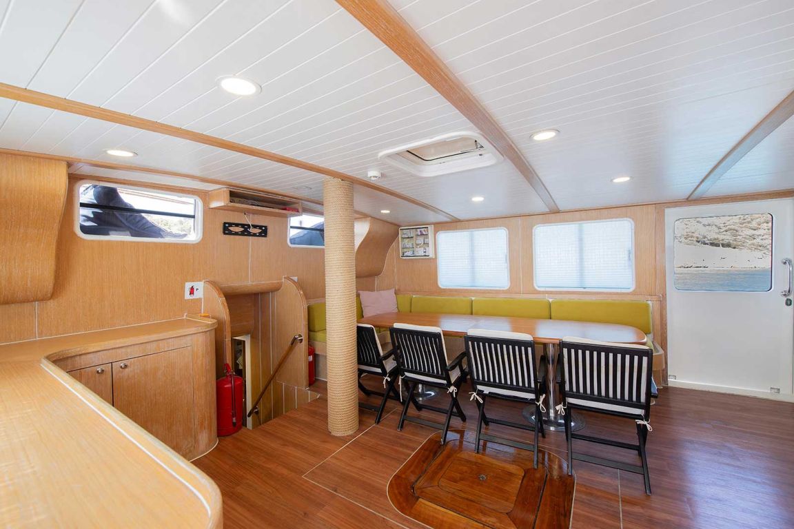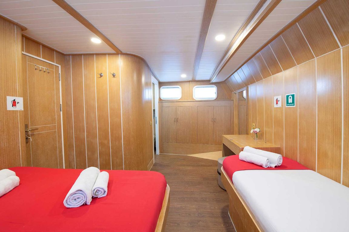 8 Kabinen für 16 Gäste: 2 Master-Suiten mit zusätzlichem Einzelbett, 4 Doppelzimmer mit zusätzlichem Einzelbett, 2 Doppelzimmer, Klimaanlage, Duschkabine und Toiletten im Haushaltsstil in allen Kabinen, separate Mannschaftskabinen. 24 Stunden Klimaanlage |