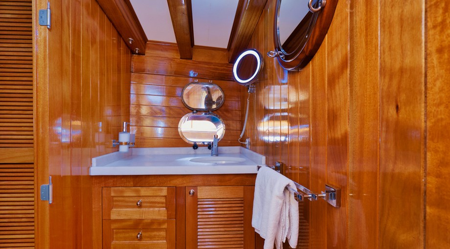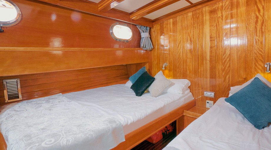 Unsere Gulet mit 8 Kabinen verfügt über 4 Master-Kabinen, 1 Doppelkabine, 1 Dreibettkabine und 2 Zweibettkabinen. Jede Kabine ist mit Klimaanlage, WC und Dusche ausgestattet und bietet bequem Platz für insgesamt 17 Gäste. Der große und komfortable Salon ist mit Fernseher, Sat-TV und CD-Player ausgestattet, damit Sie Ihre Zeit an Land noch angenehmer gestalten können. Während Sie die in unserer voll ausgestatteten Küche zubereiteten Mahlzeiten genießen, können Sie die ganze Vielfalt des Meeres entdecken.