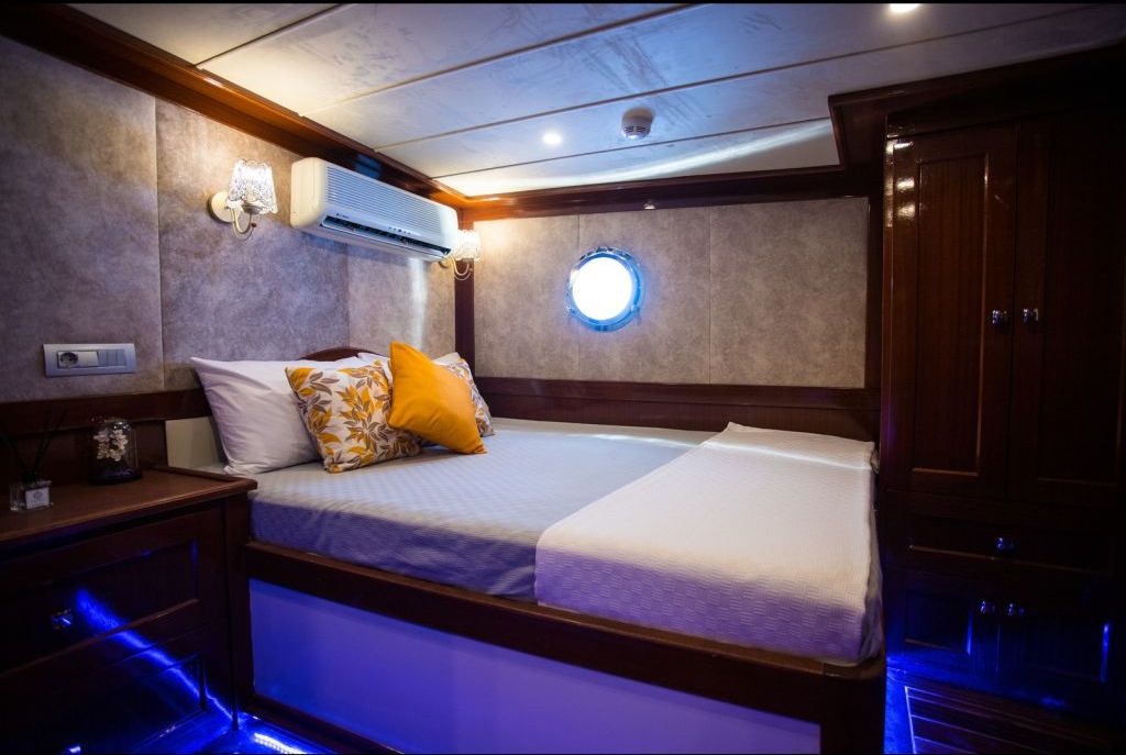 Bis zu 18 Gäste; 6 Doppelkabinen + 2 Dreibettkabinen, Klimaanlage, Kleiderschrank, Duschkabine und Toiletten im Haushaltsstil in allen Kabinen, separate Mannschaftskabinen. |