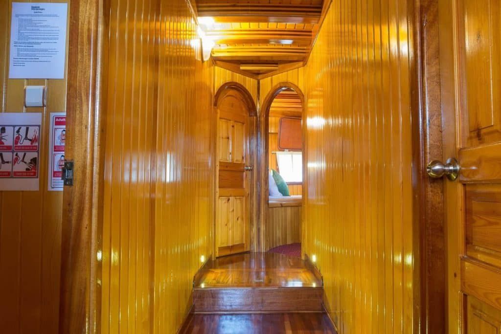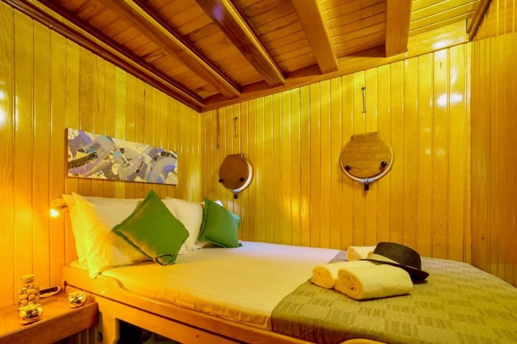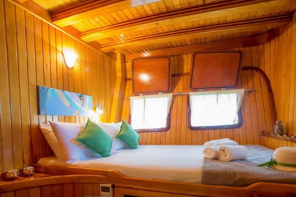 Bis zu 16 Gäste; 6 Doppelkabinen, 2 Zweibettkabinen, Klimaanlage, Kleiderschrank, Duschkabine und Toiletten im Haushaltsstil in allen Kabinen, separate Mannschaftskabinen. |