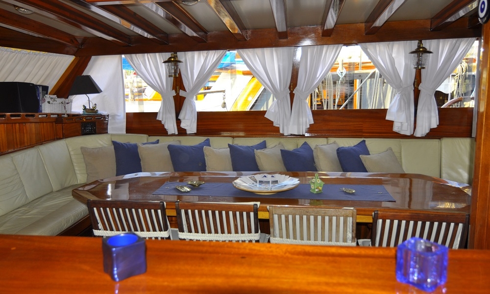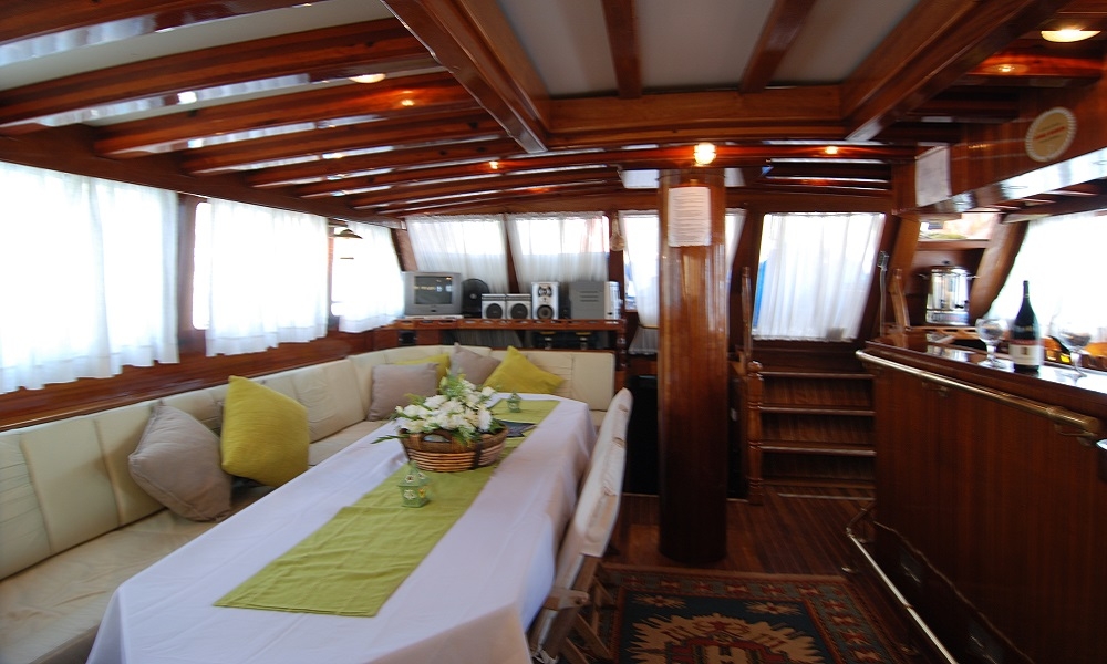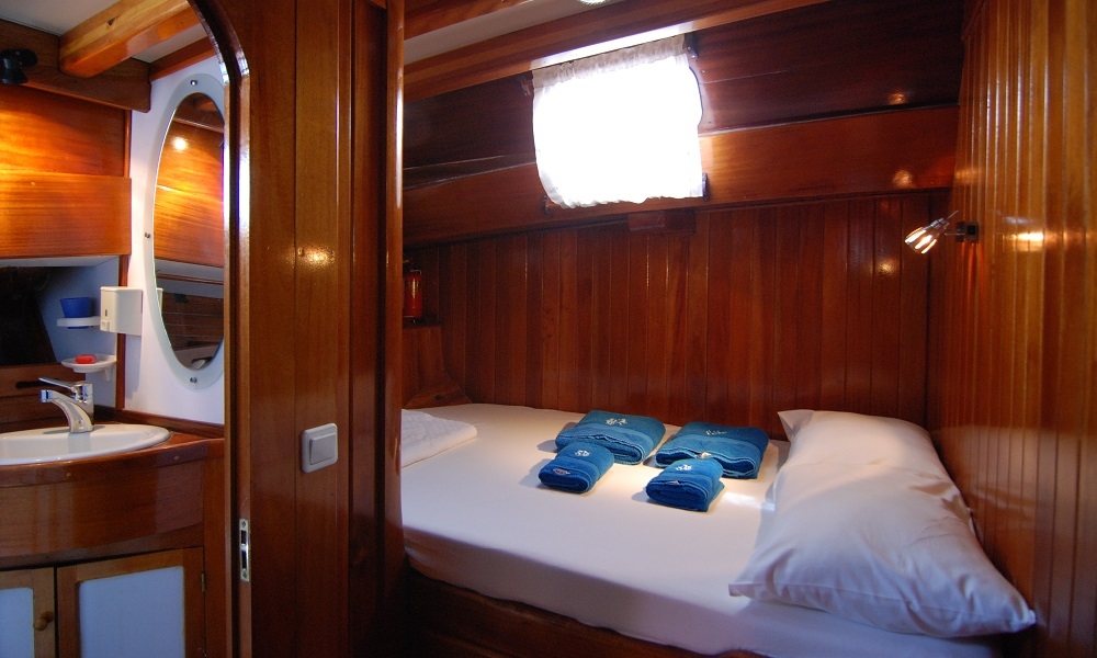 Unser 8-Kabinen-Gulet hat 6 Doppel- und 2 Zweibettkabinen, mit Klimaanlage, Toilette und Dusche in jeder Kabine, und bietet bequem Platz für insgesamt 16 Gäste. Das große und komfortable Wohnzimmer ist mit Geräten wie Fernseher, Satellitenfernsehen und CD-Player ausgestattet, um Ihre Zeit außerhalb des Meeres noch angenehmer zu gestalten. Während Sie die in unserer voll ausgestatteten Küche zubereiteten Mahlzeiten genießen, können Sie auch jeden Blauton entdecken.