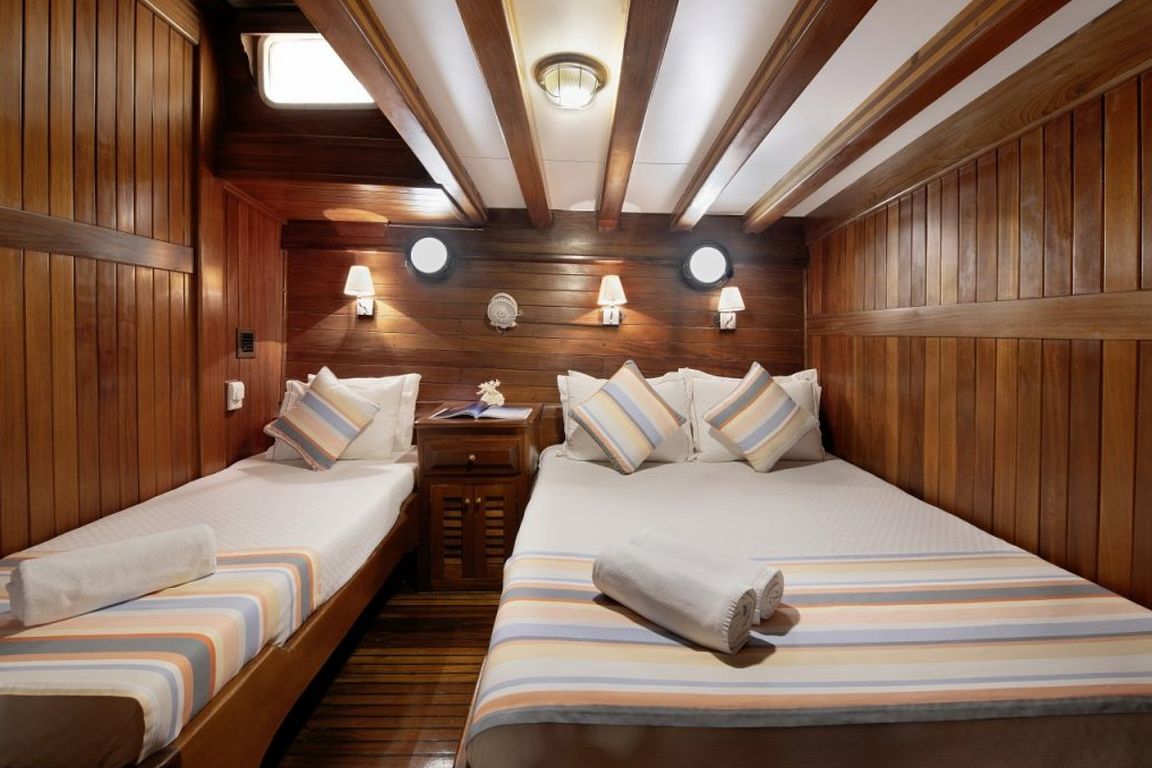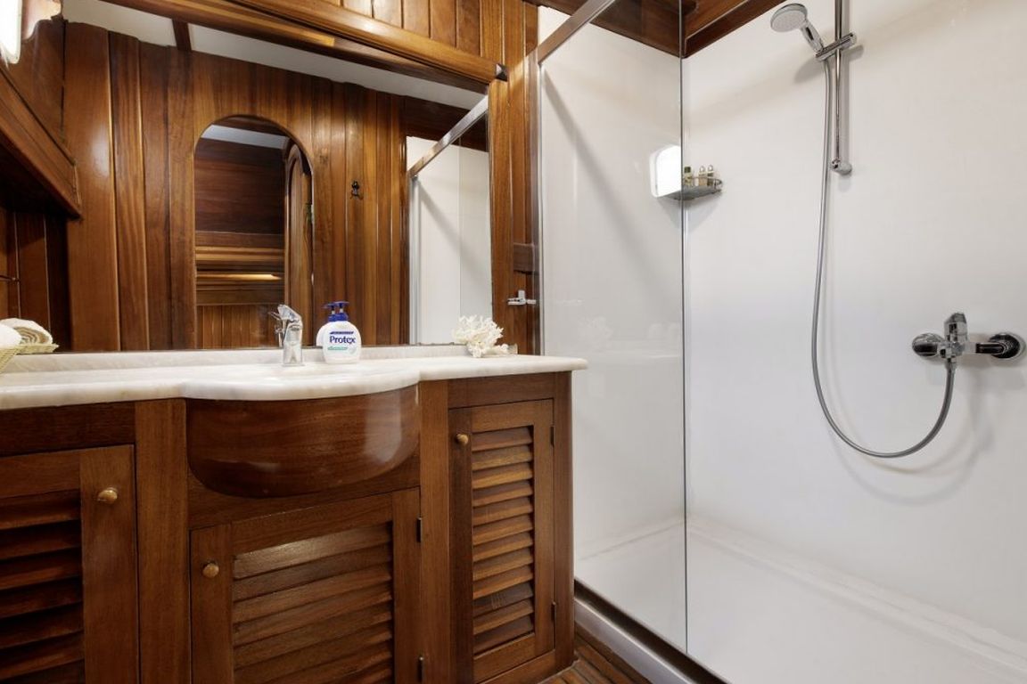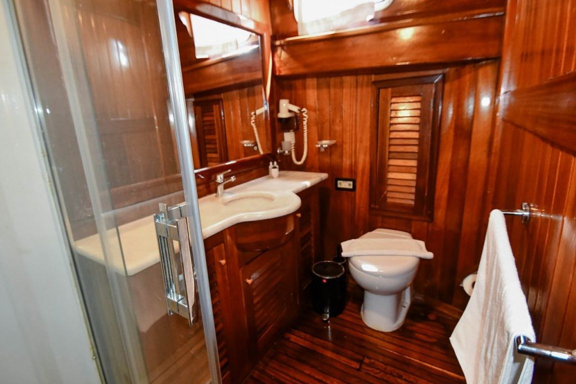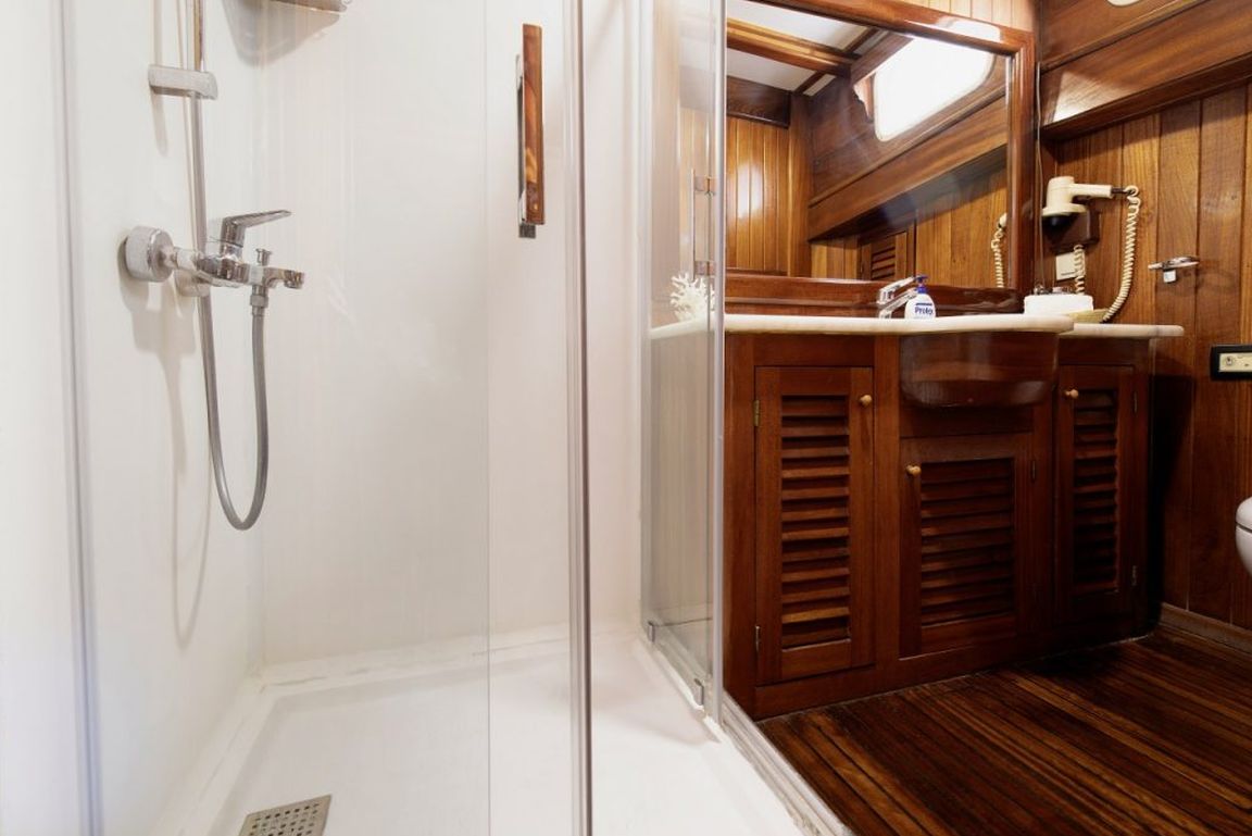 | Bis zu 16 Gästekapazität; 5 Doppel, 1 Dreibett, 2 Zweibettkabinen, Klimaanlage, Duschkabine und Toiletten im Haushaltsstil in allen Kabinen, separate Mannschaftskabinen. |